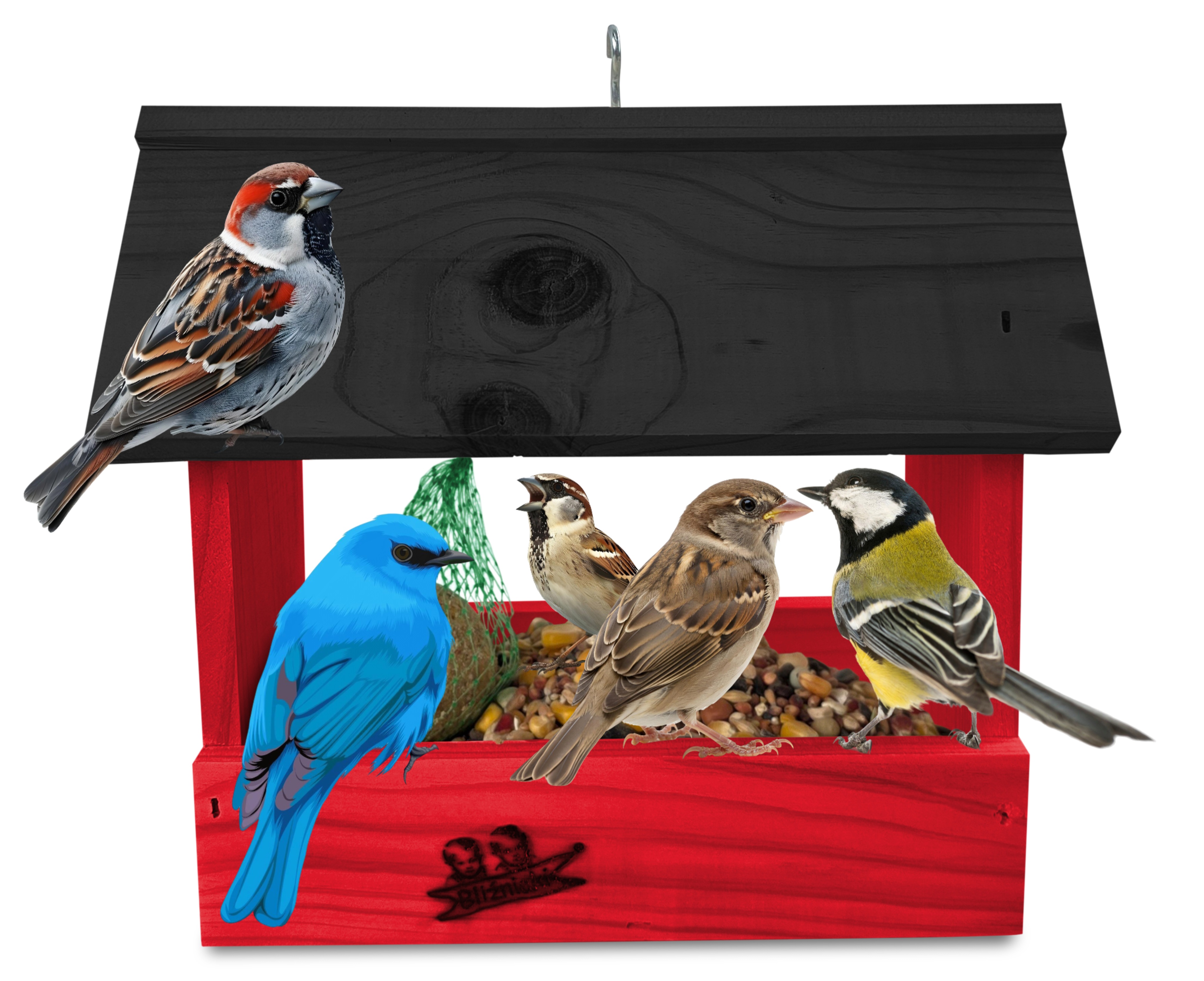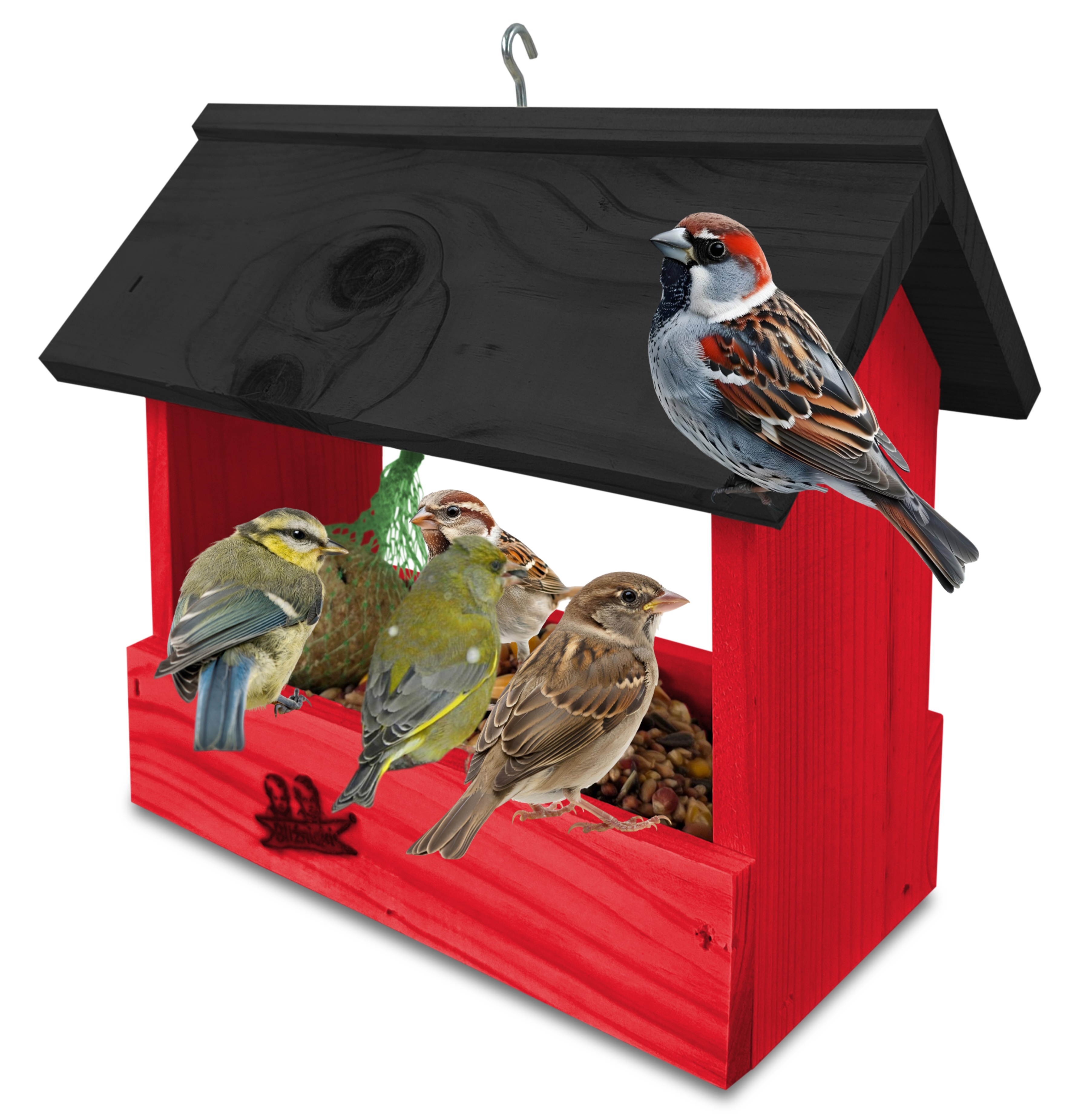 - U góry widoczny jest haczyk umożliwiający zawieszenie karmnika w dowolnym miejscu, możliwe jest również jego postawienie