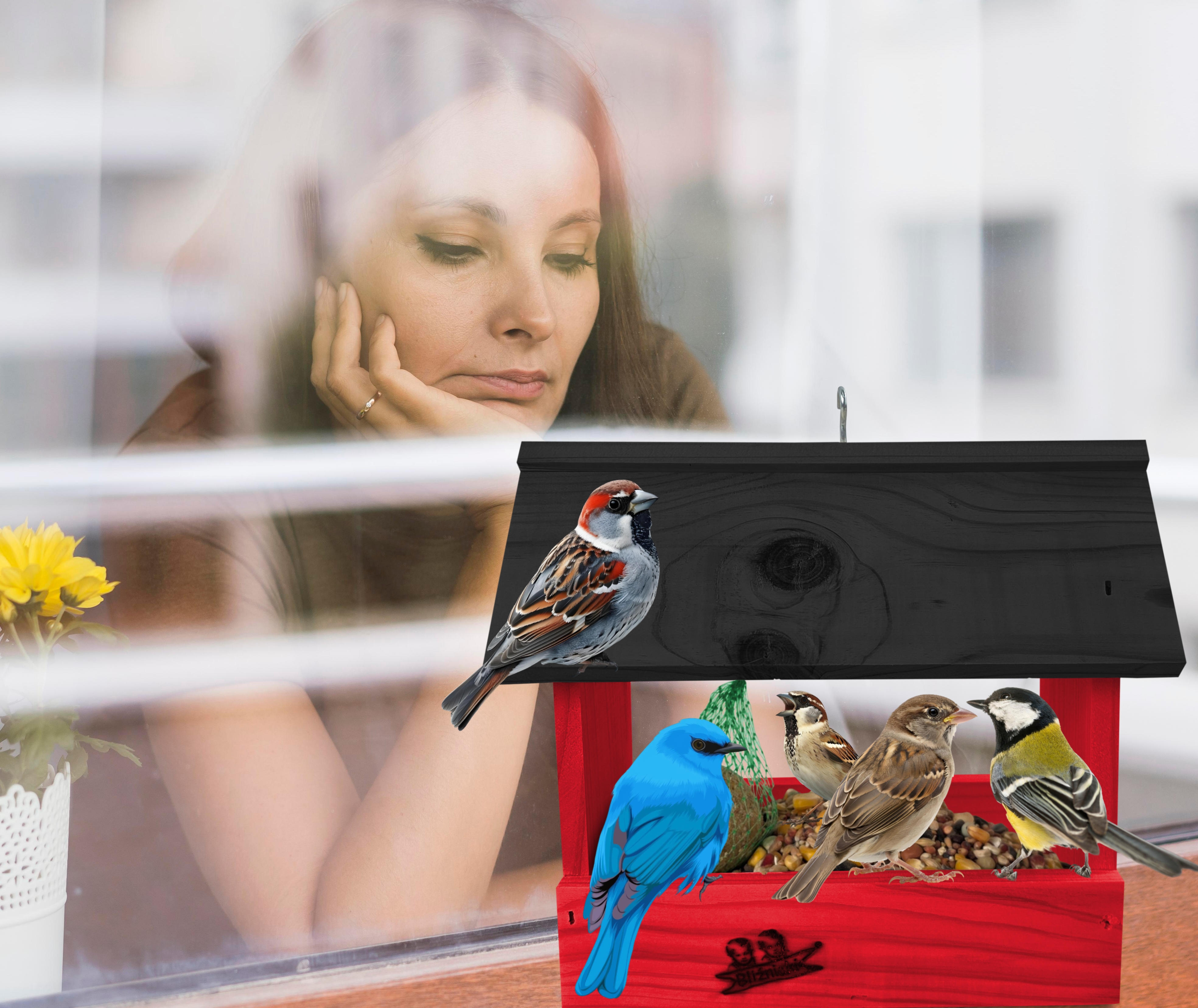 Karmnik z drewna litego w kolorze czerwonym dla ptaków na zimę dekoracja na taras wróble dzwońce dzięcioły K204 CB CZ