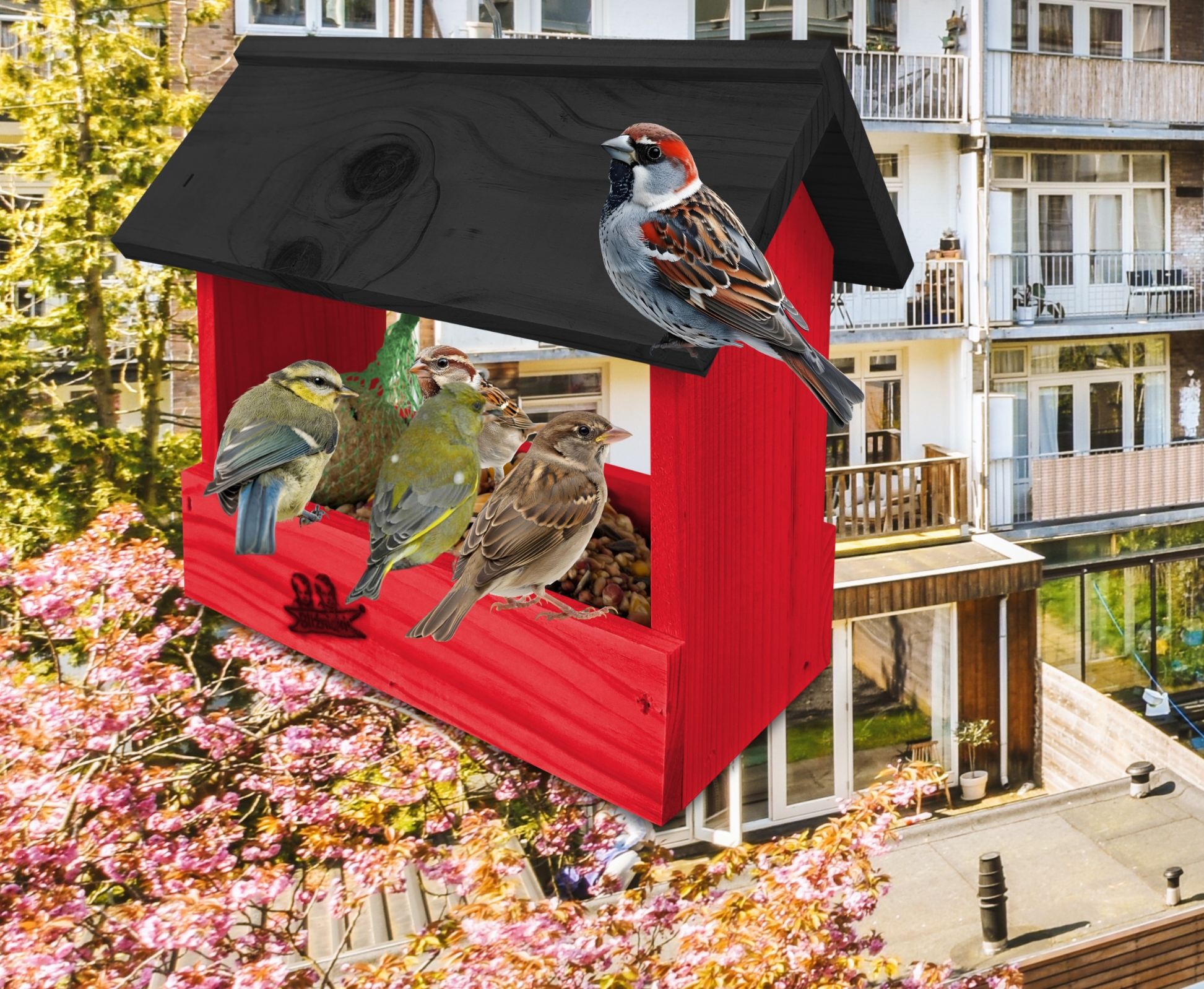 Przedmiotem sprzedaży jest ozdobny drewniany karmnik dla ptaków budka domek na balkon K204 CB CZ kolor czerwony z czarnym dachem