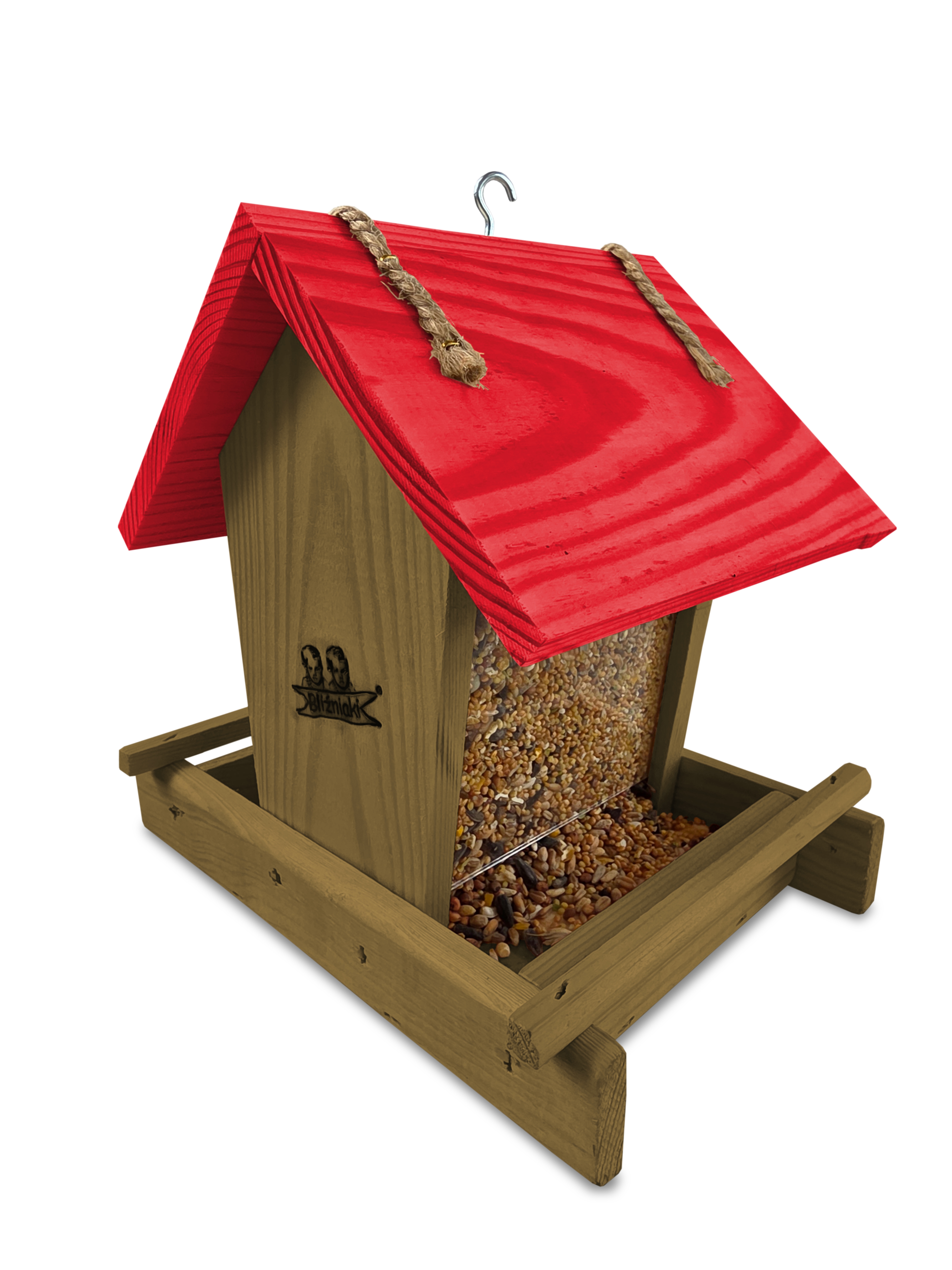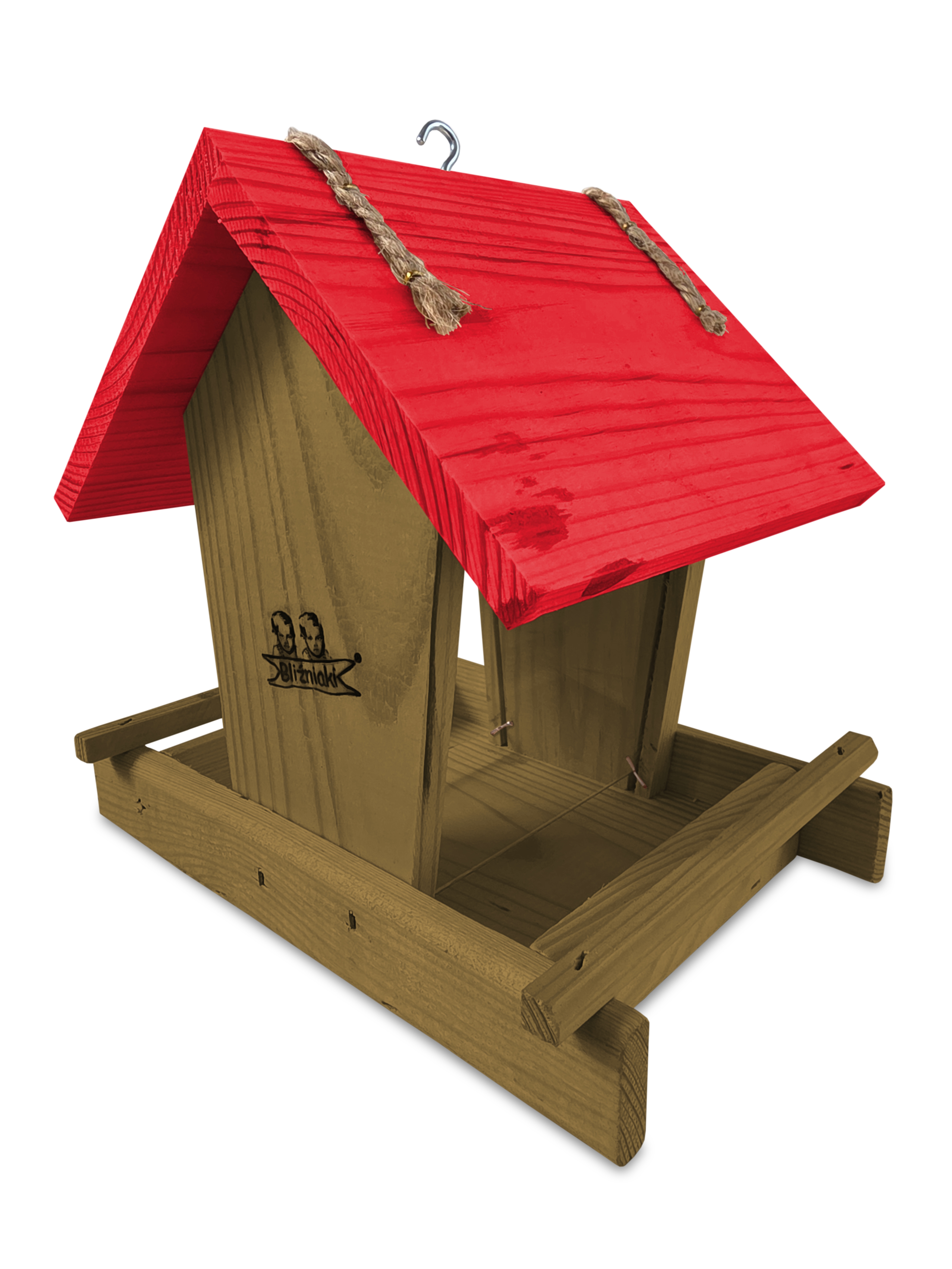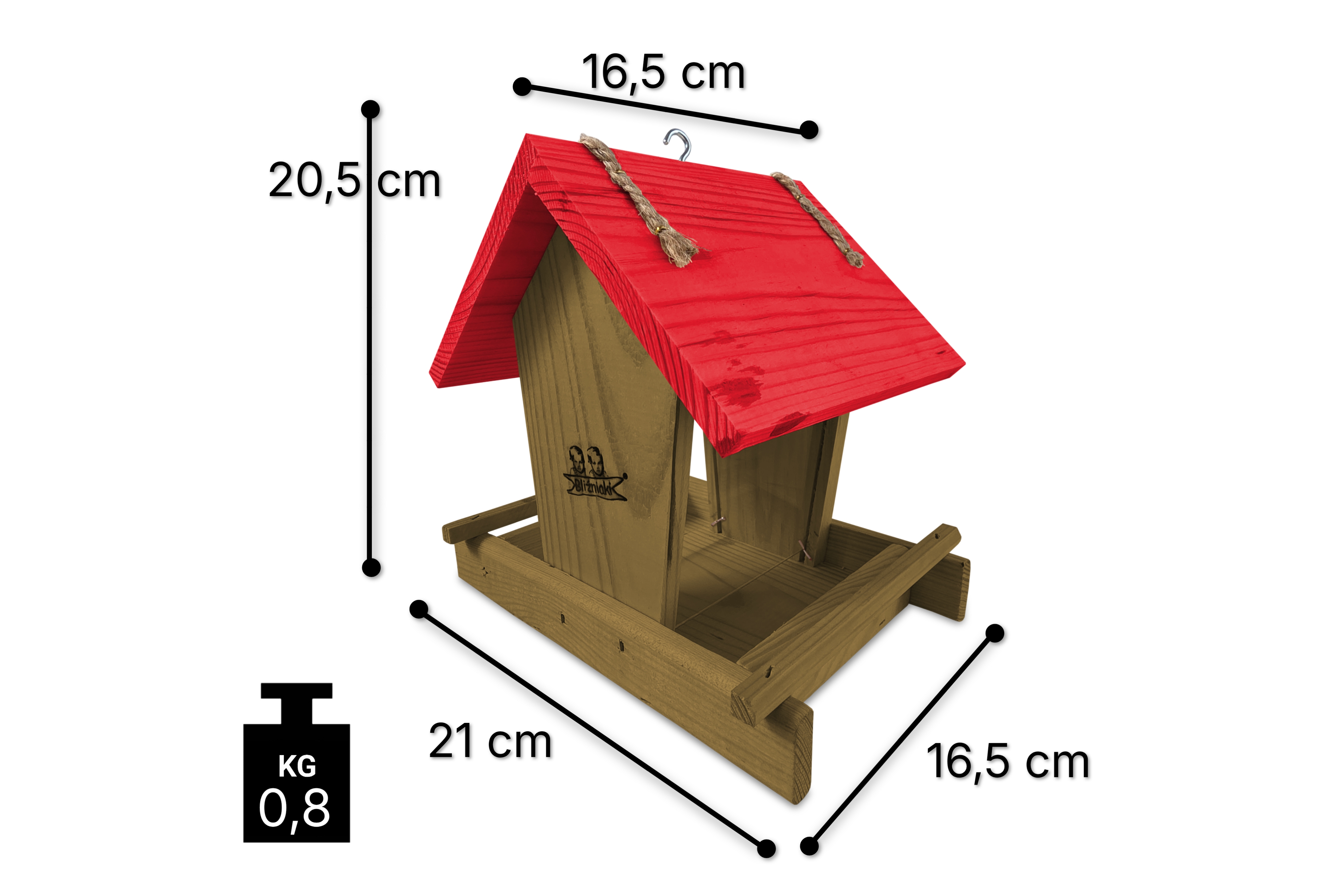 - Karmnik wykonany jest w całości z drewna iglastego, KOLOR DĘBOWY Z CZERWONYM DACHEM