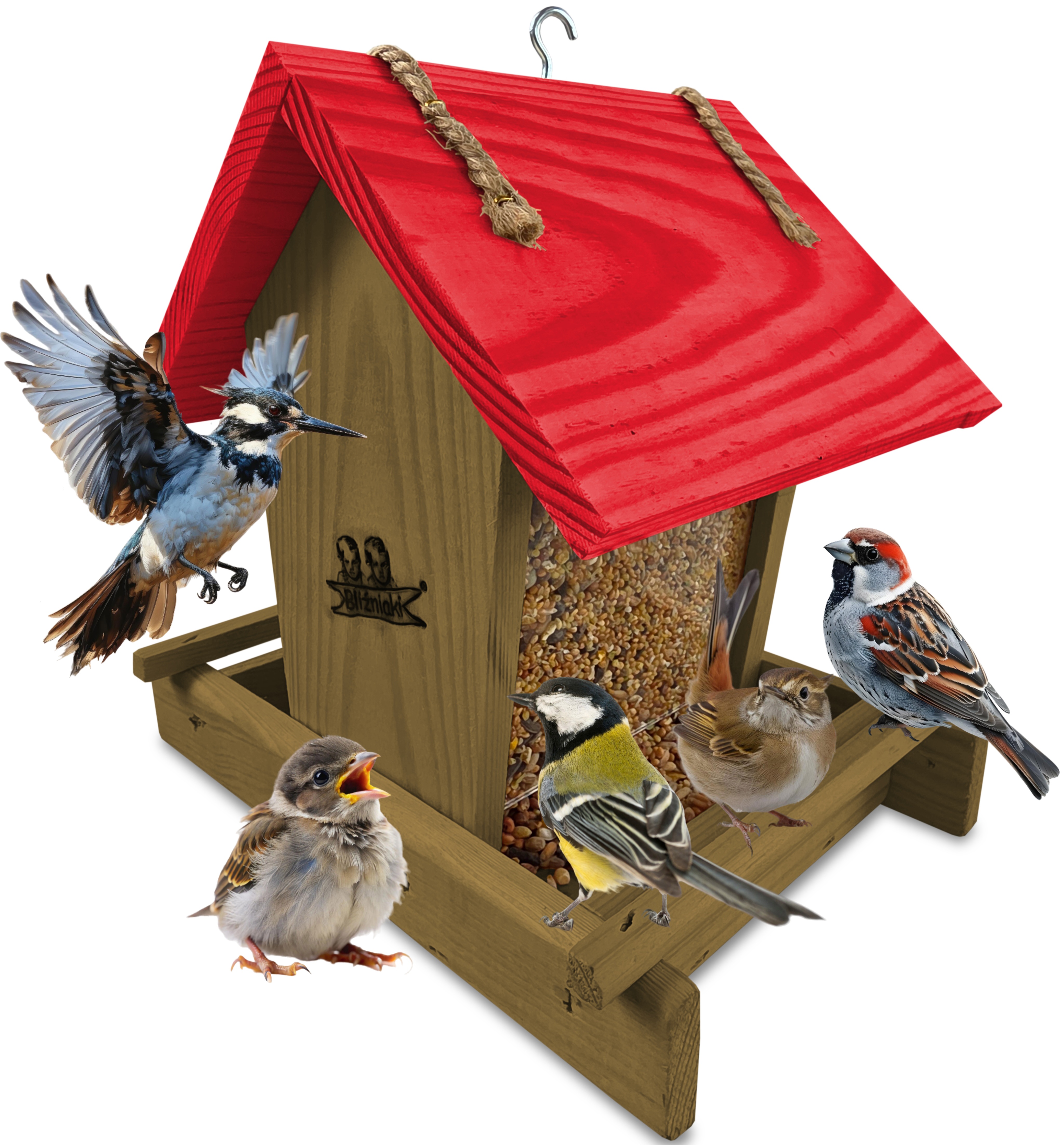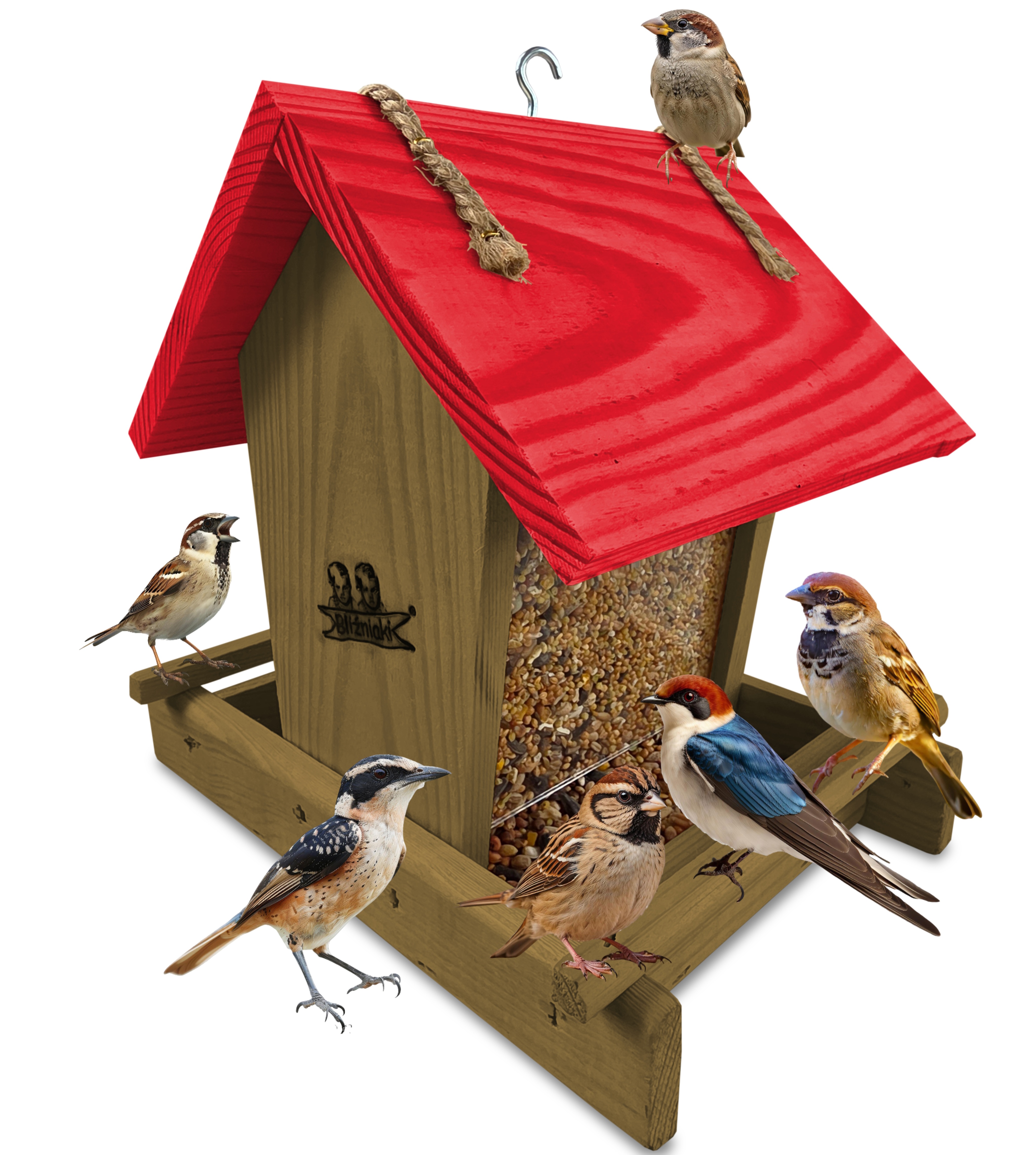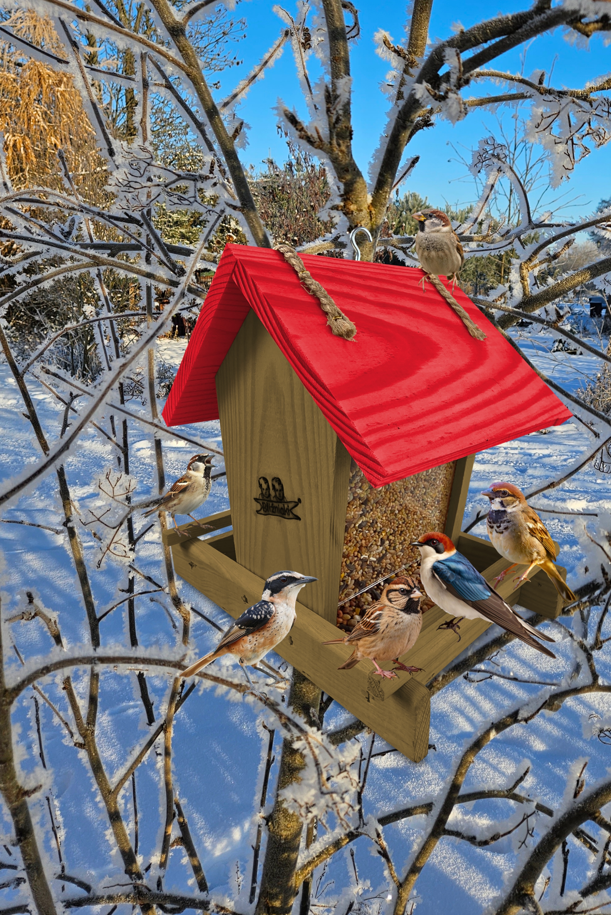 - Karmnik wykonany jest w całości z drewna iglastego, KOLOR DĘBOWY Z CZERWONYM DACHEM
