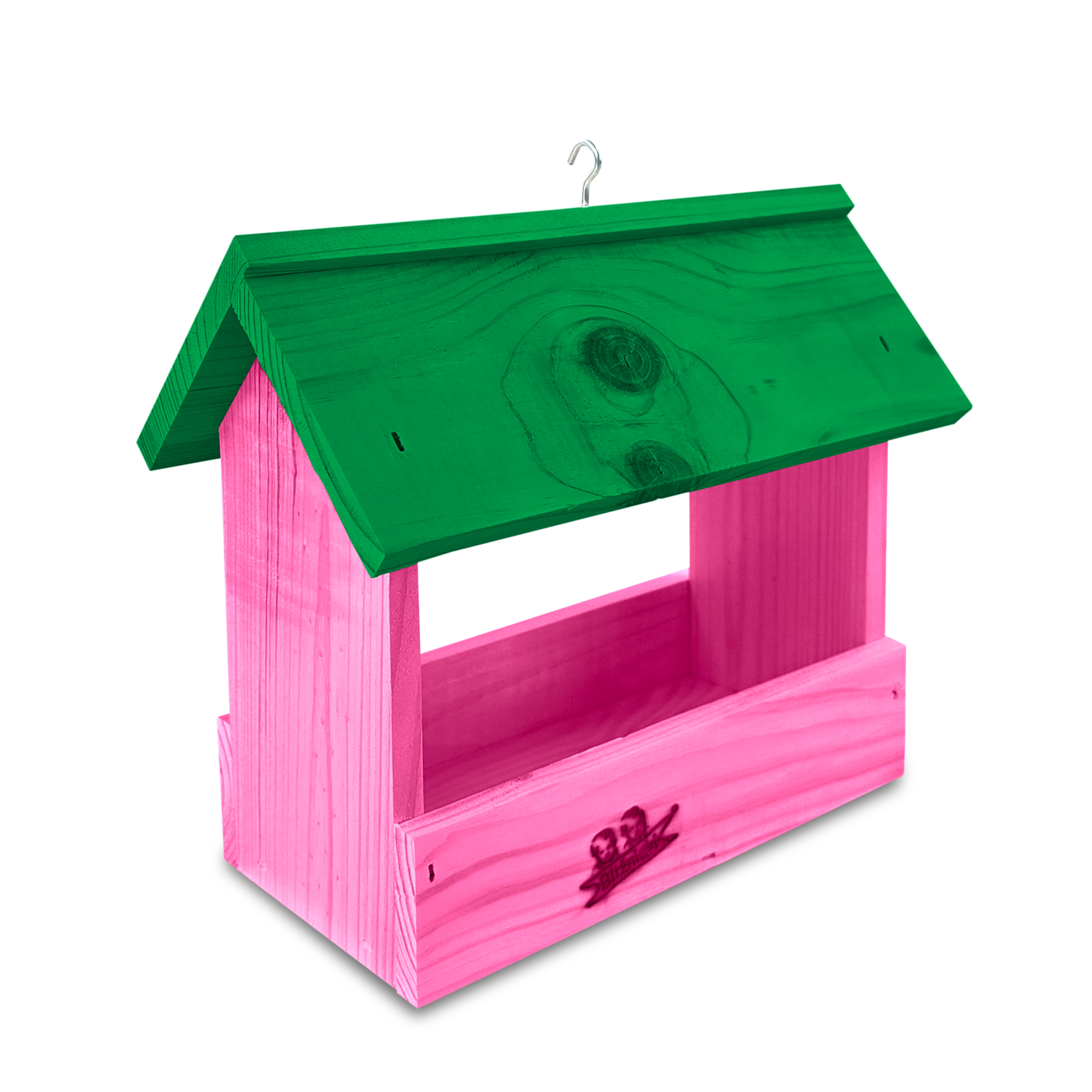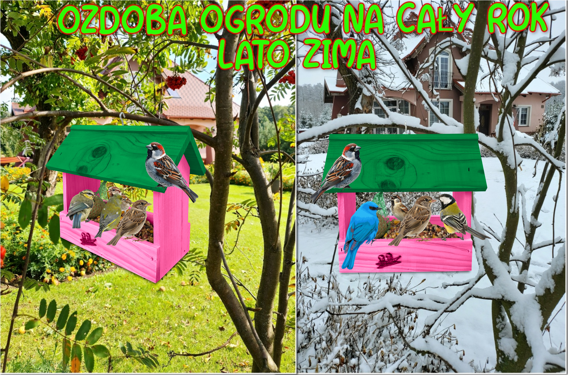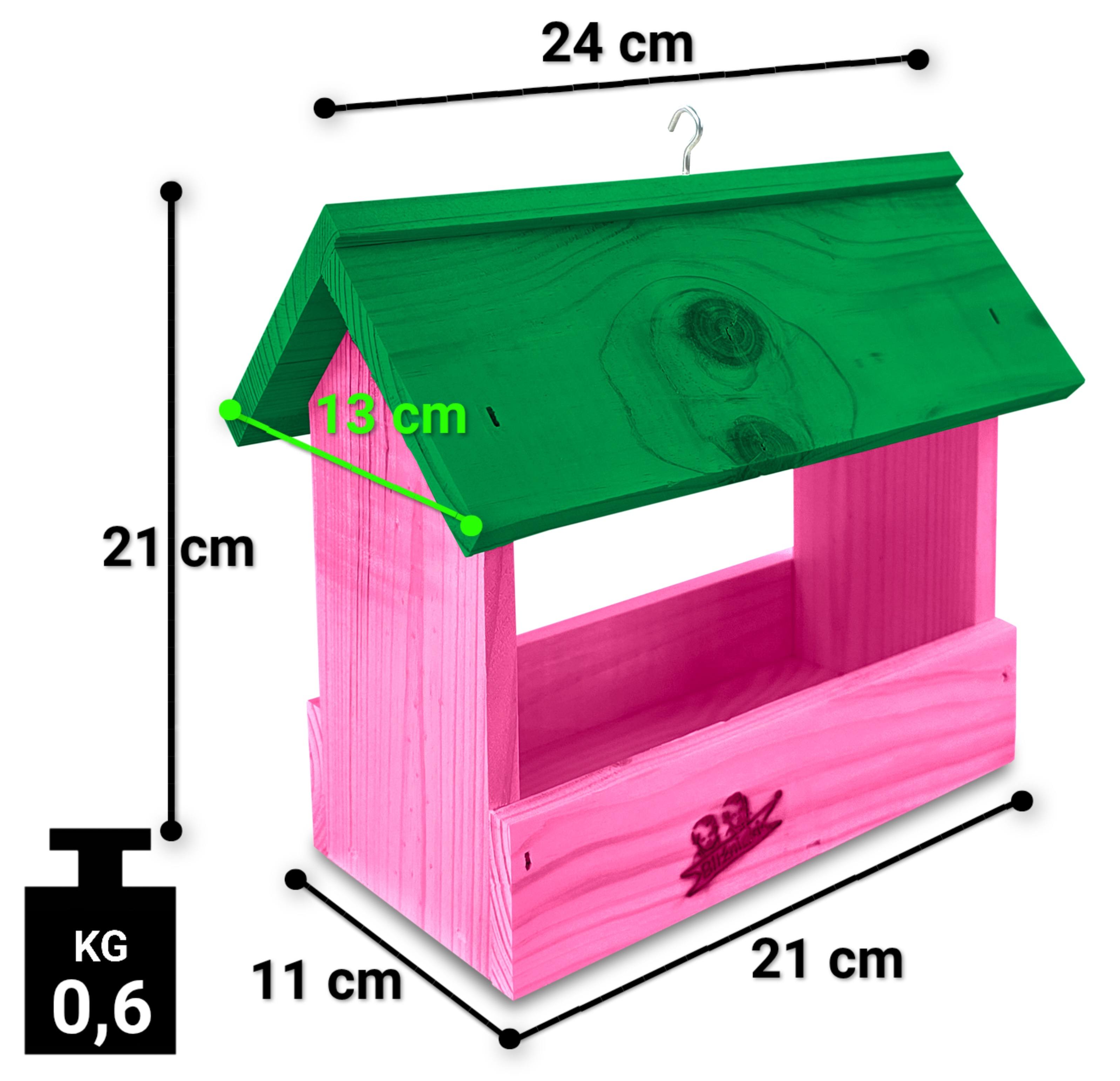 - Karmnik wykonany jest w całości z drewna iglastego, KOLOR JASNY RÓŻ Z ZIELONYM DACHEM