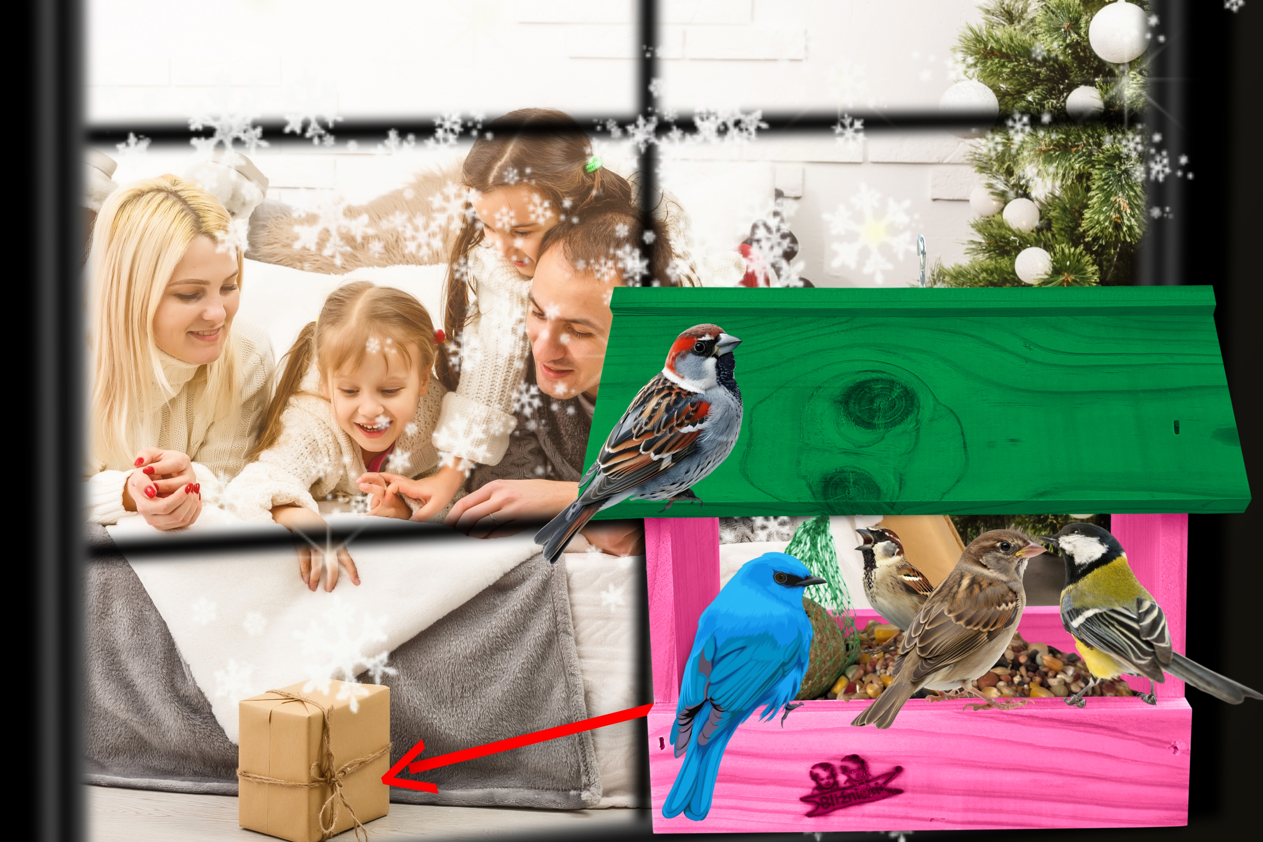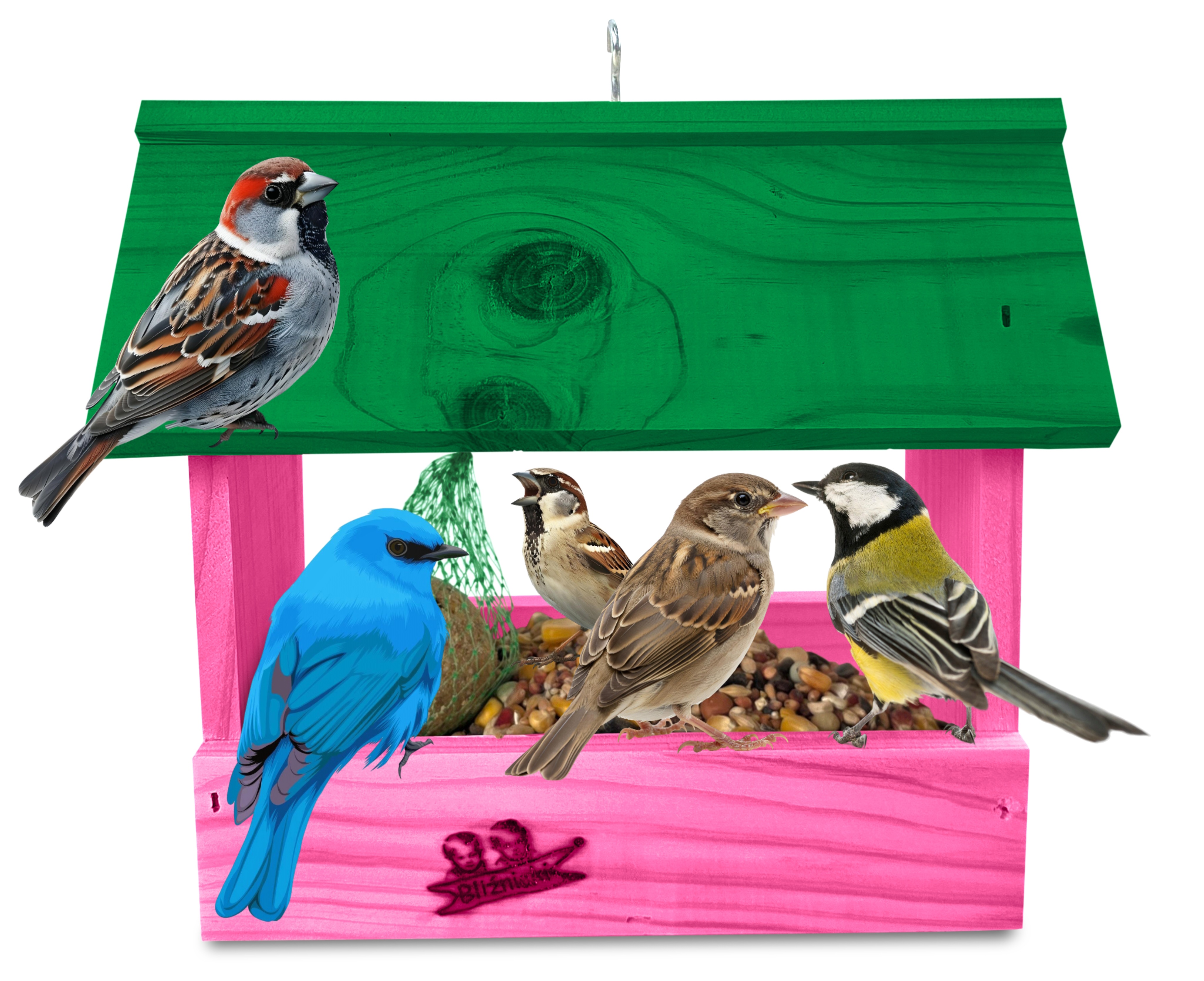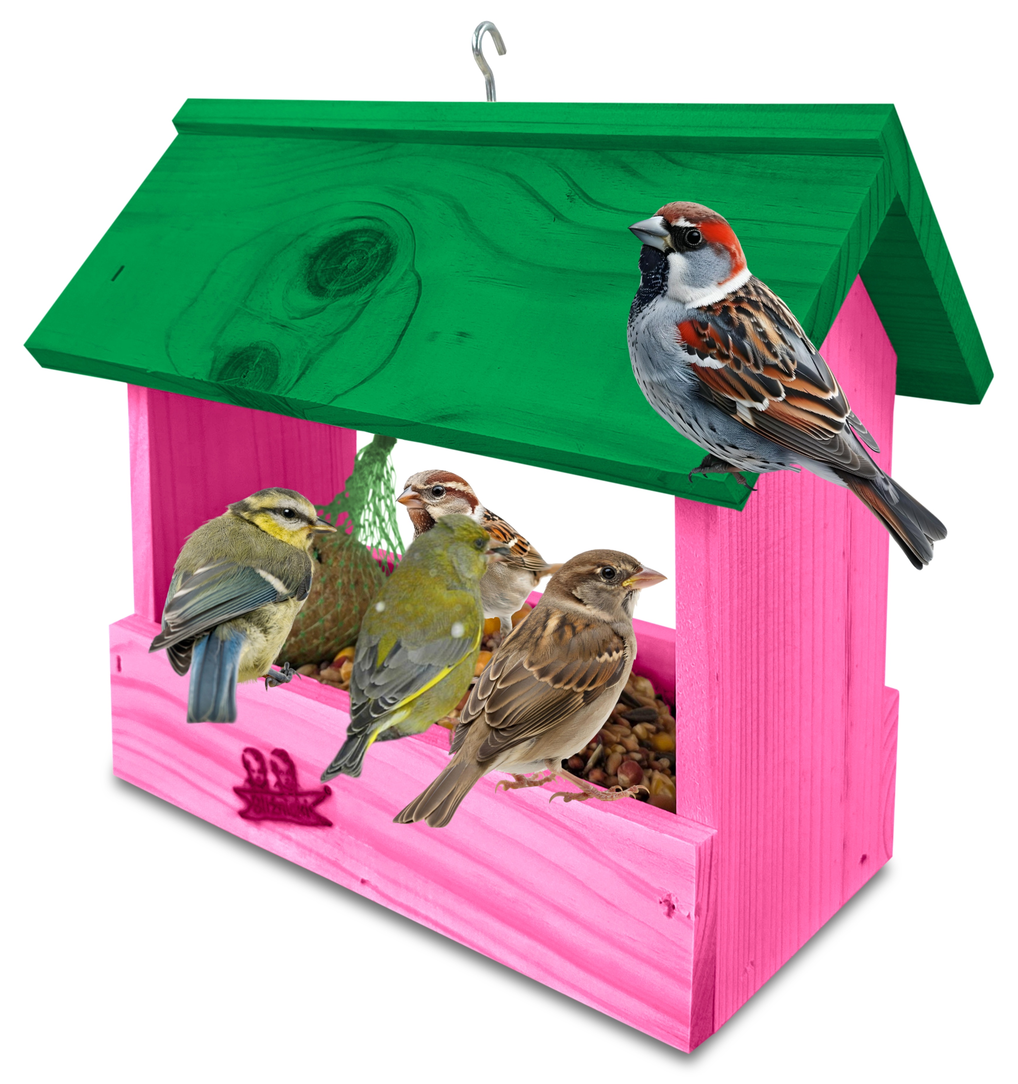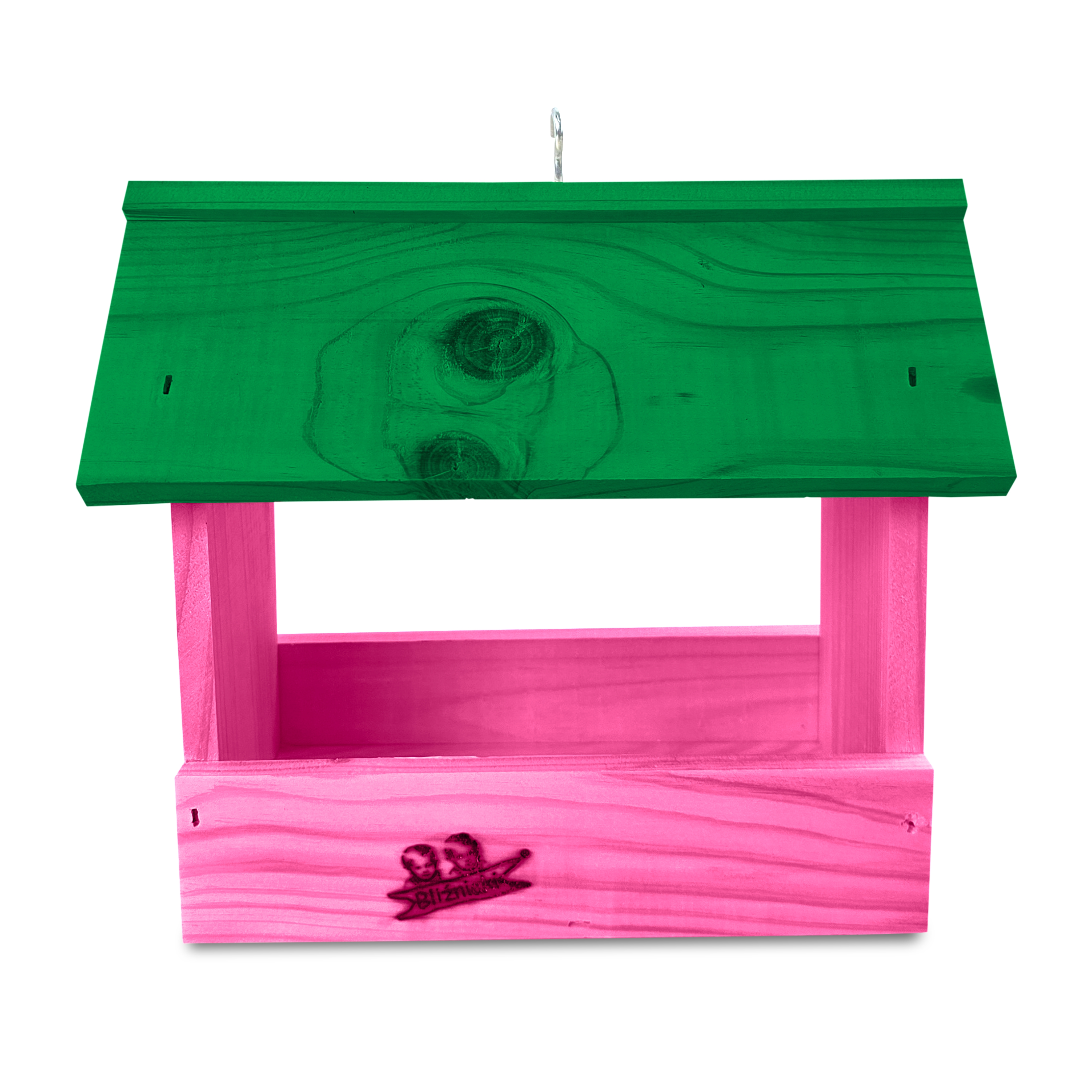 - Karmnik wykonany jest w całości z drewna iglastego, KOLOR JASNY RÓŻ Z ZIELONYM DACHEM
