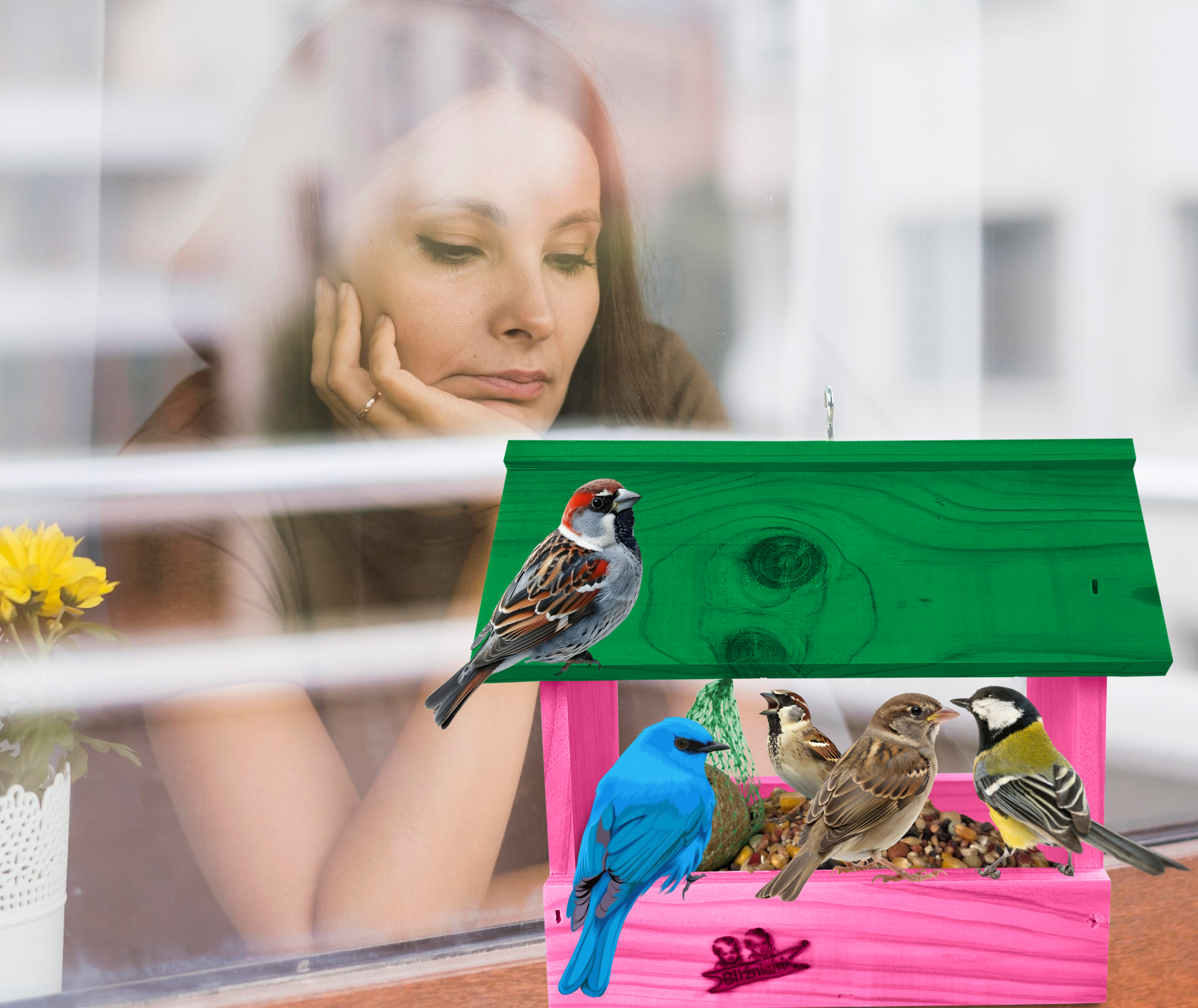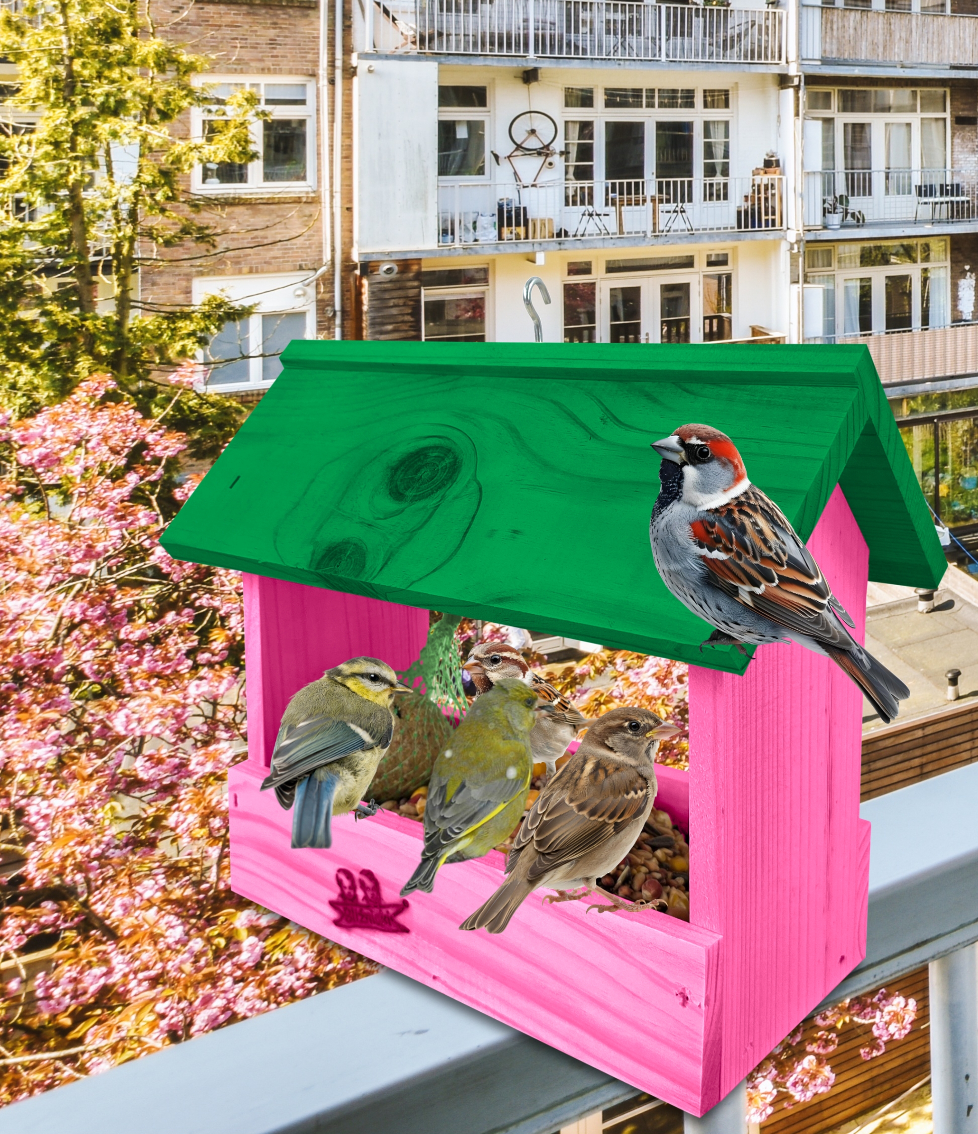 Przedmiotem sprzedaży jest ozdobny drewniany karmnik dla ptaków budka domek na balkon K204 RÓP K kolor jasnoróżowy z zielonym dachem