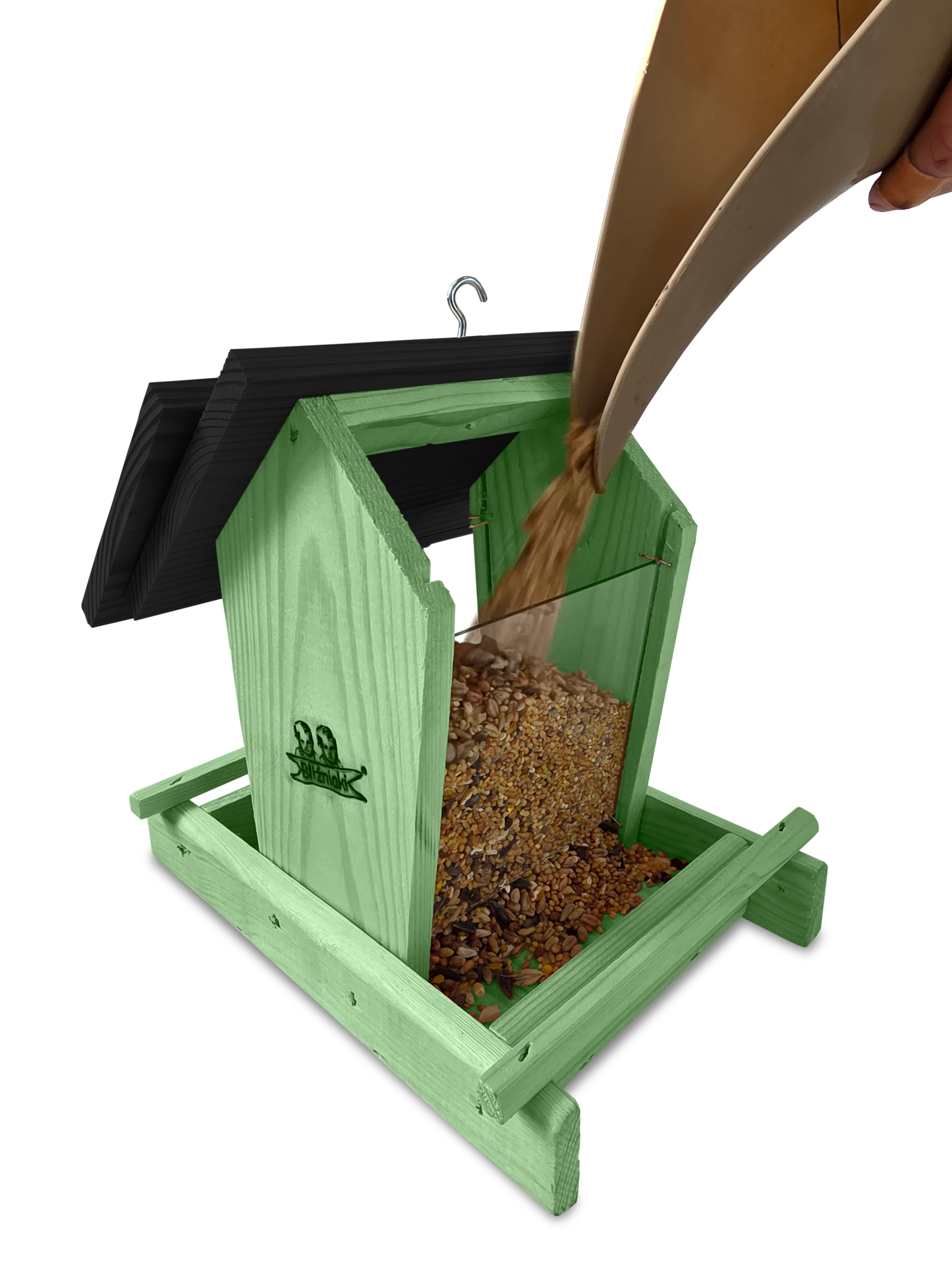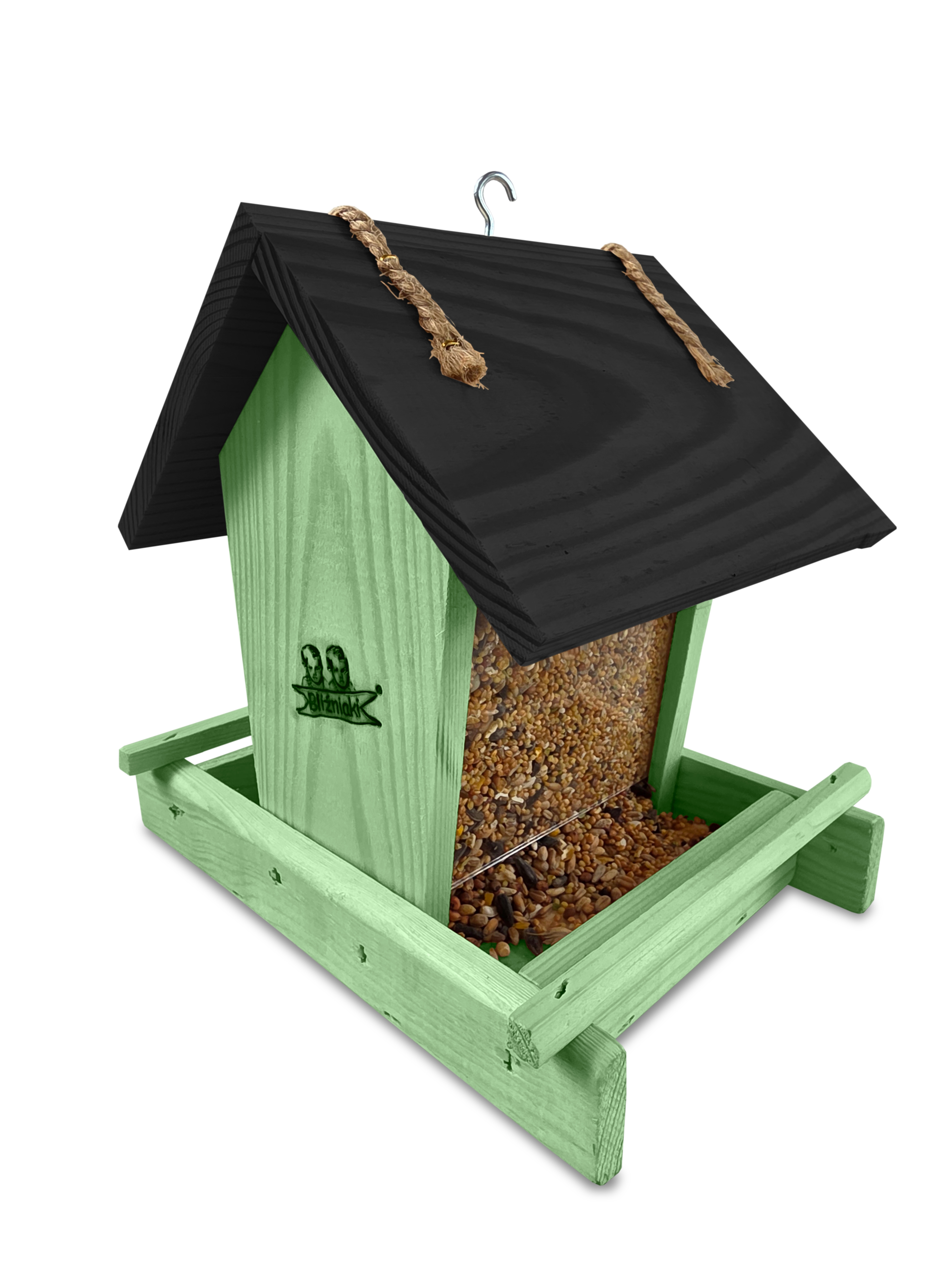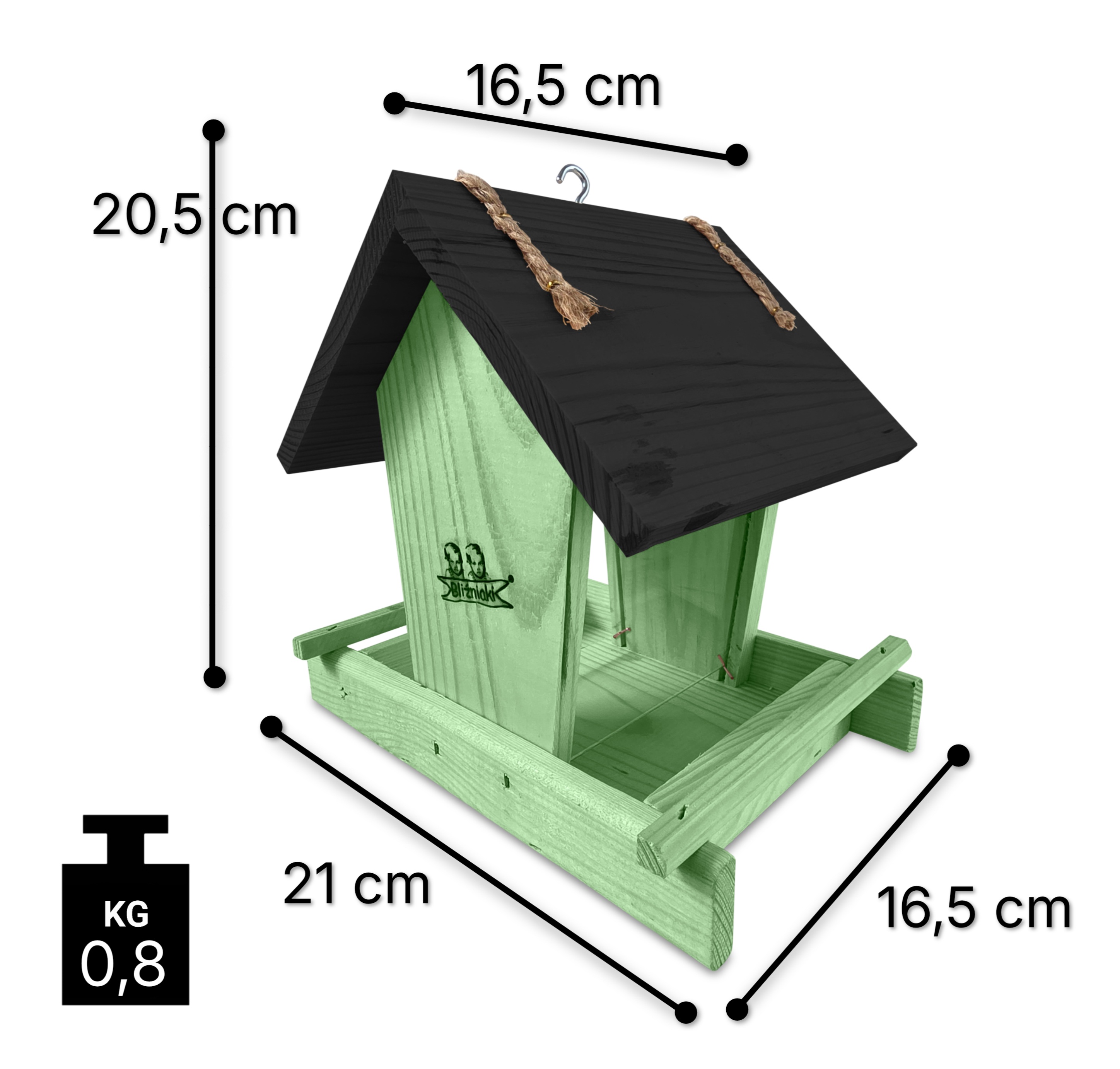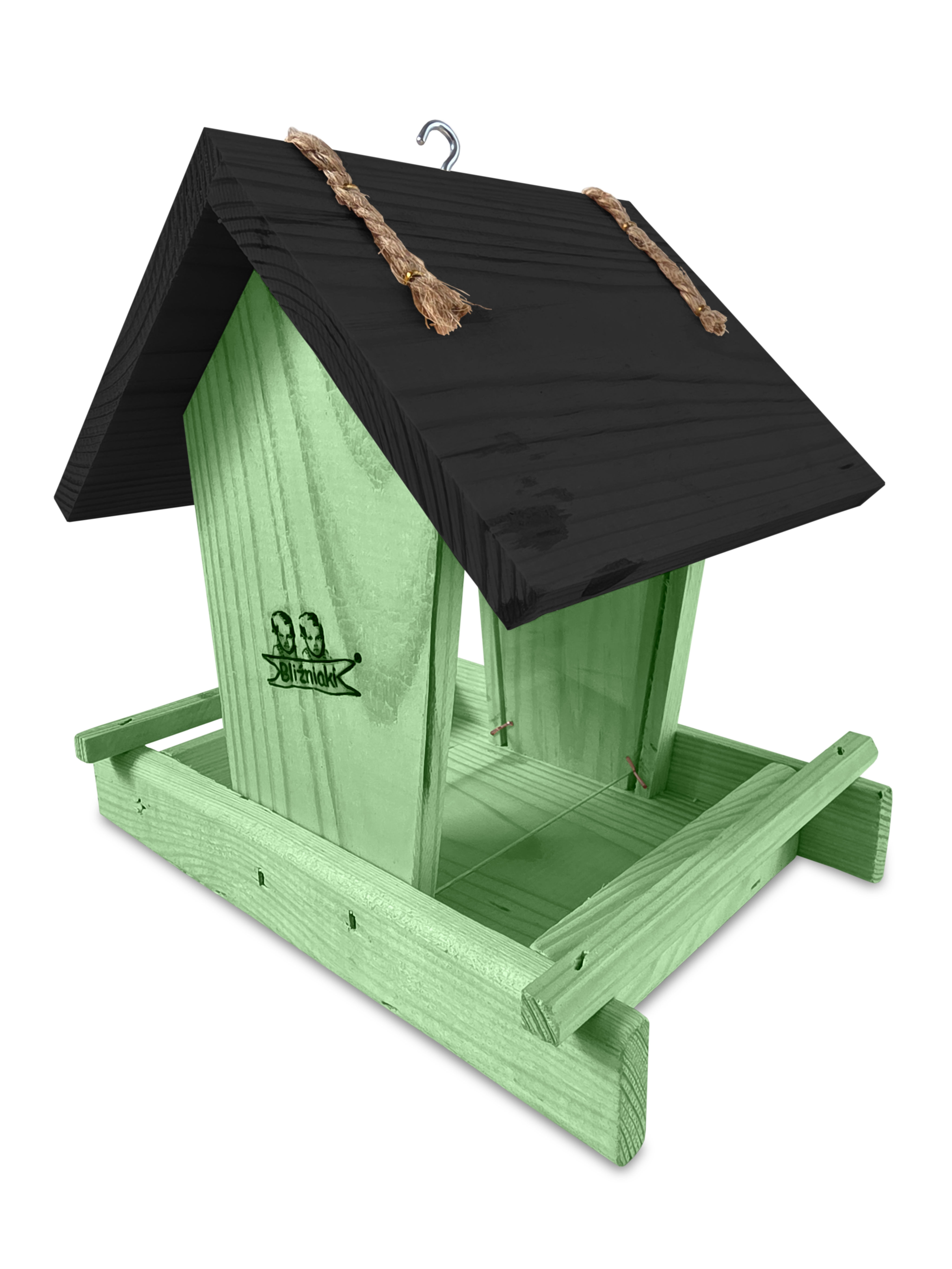 - Karmnik wykonany jest w całości z drewna iglastego, KOLOR JASNOZIELONY Z CZARNYM DACHEM