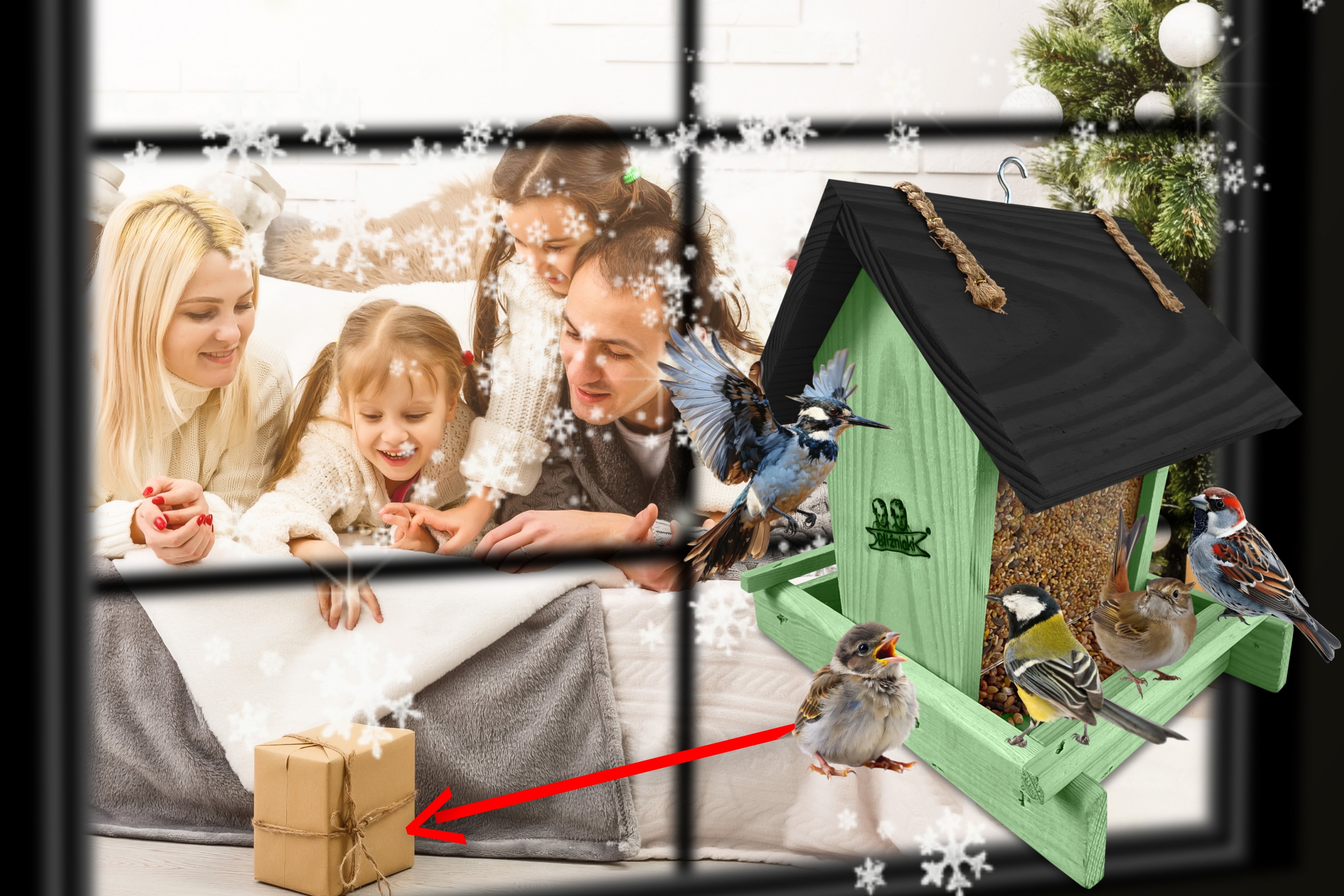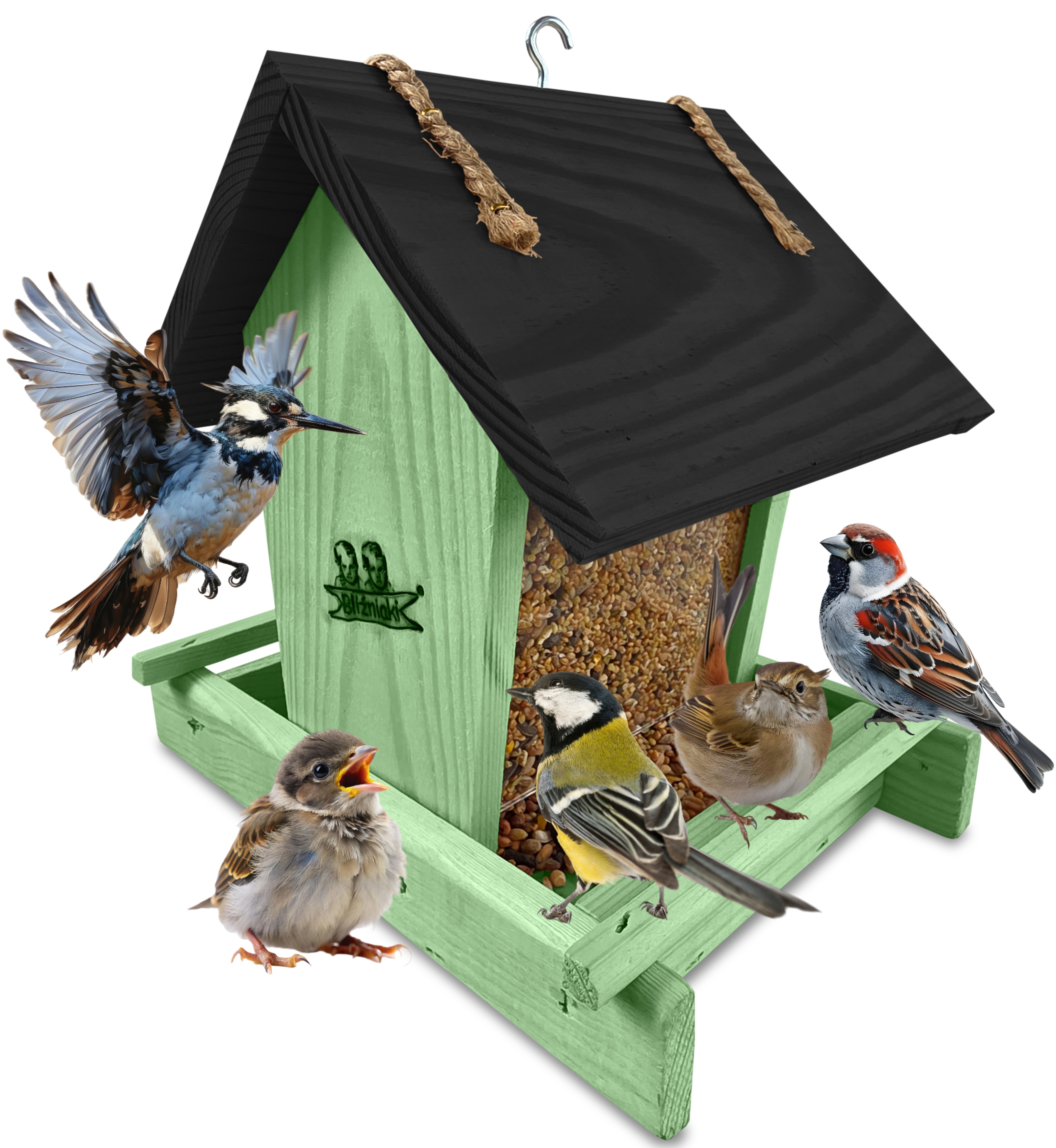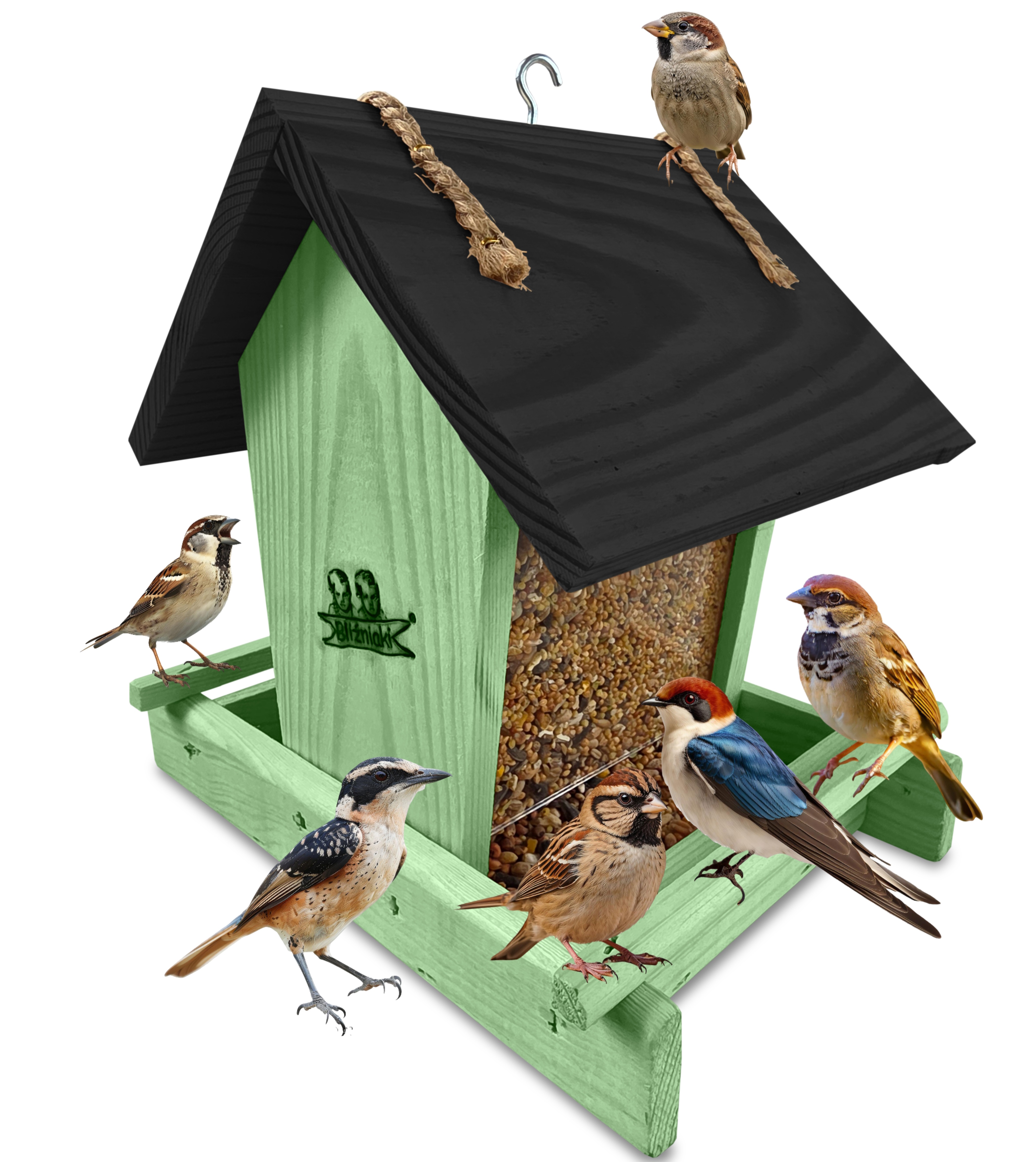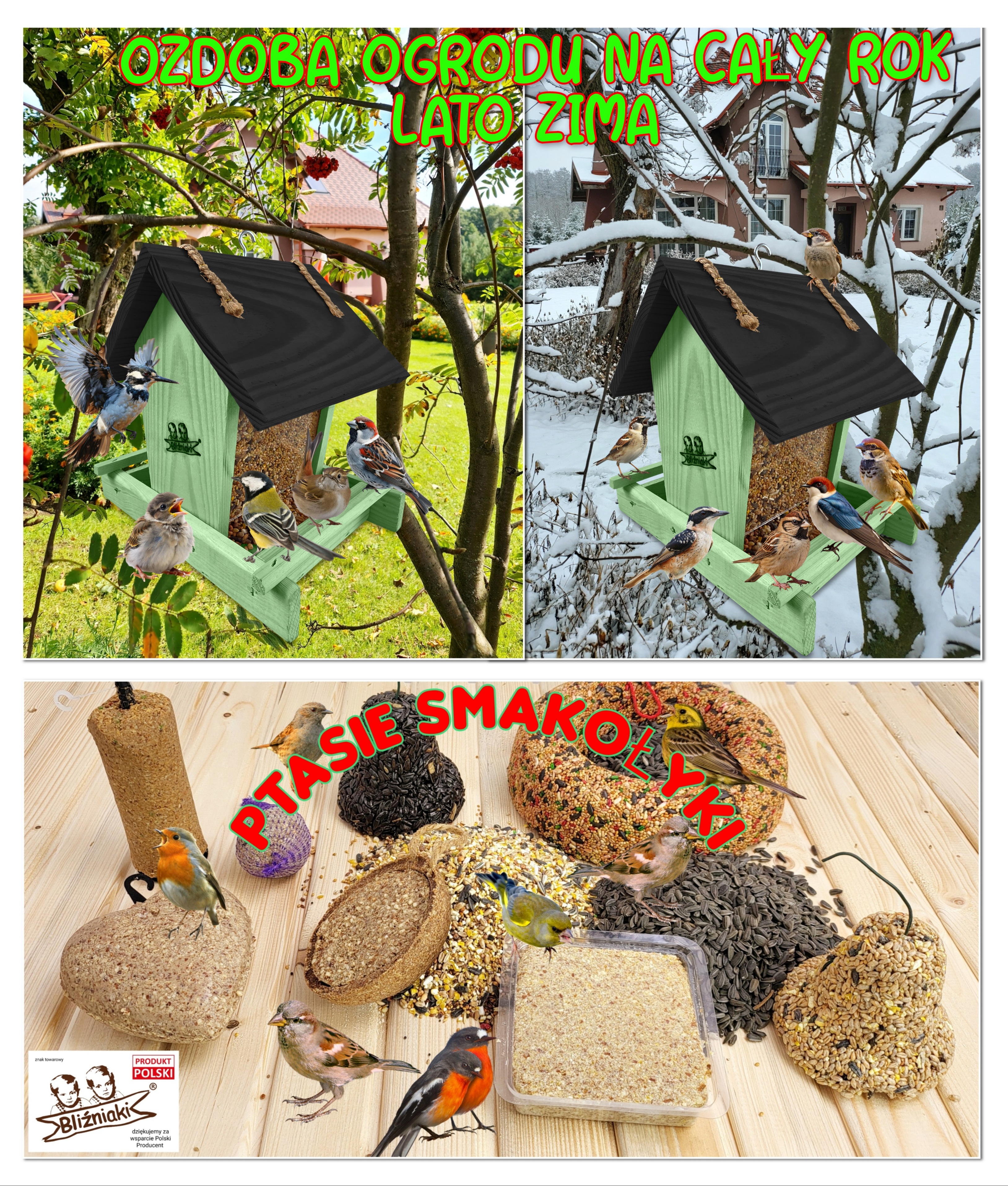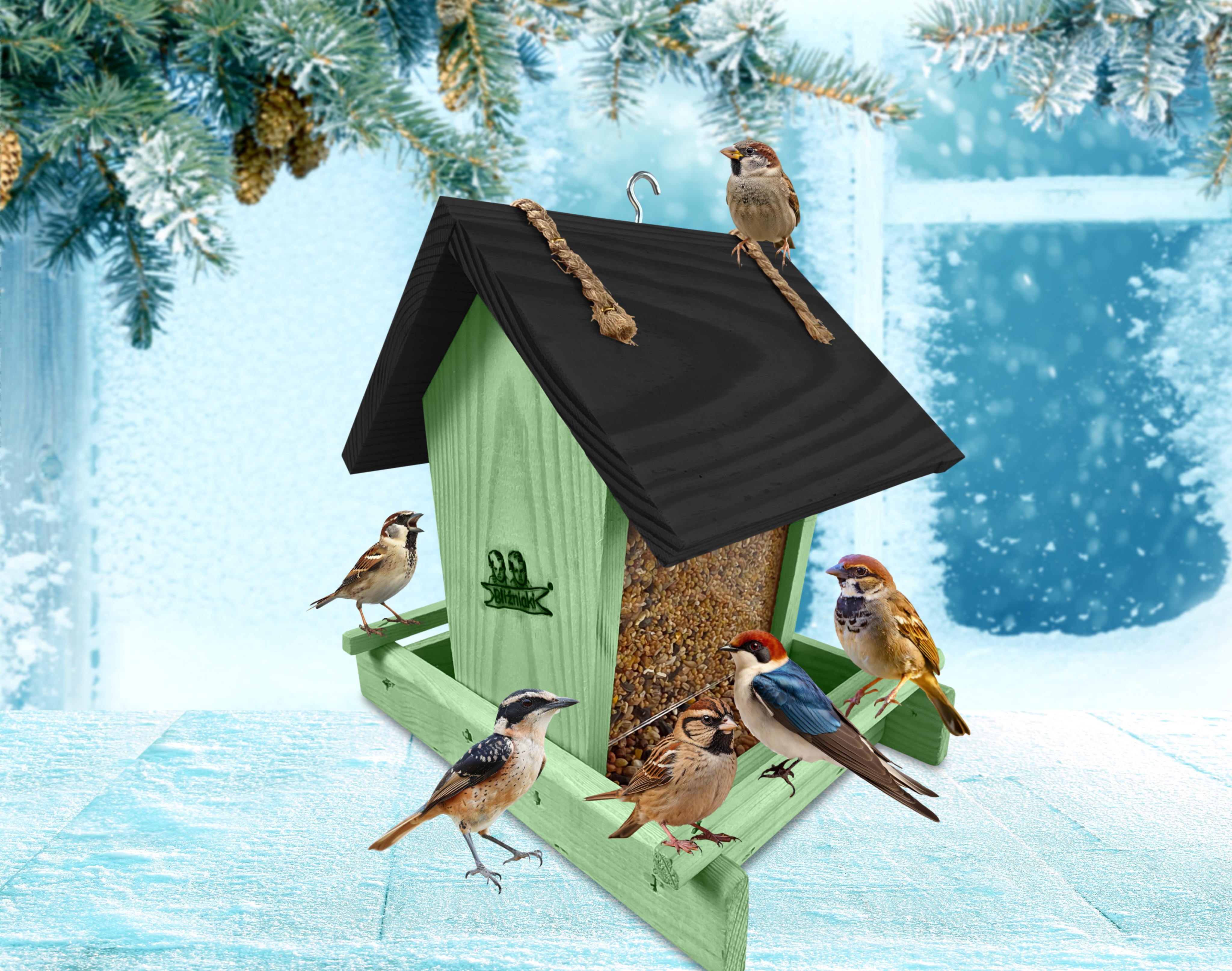 - Karmnik wykonany jest w całości z drewna iglastego, KOLOR JASNOZIELONY Z CZARNYM DACHEM