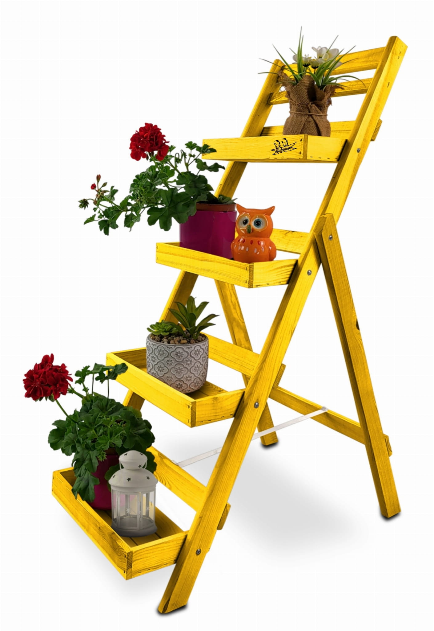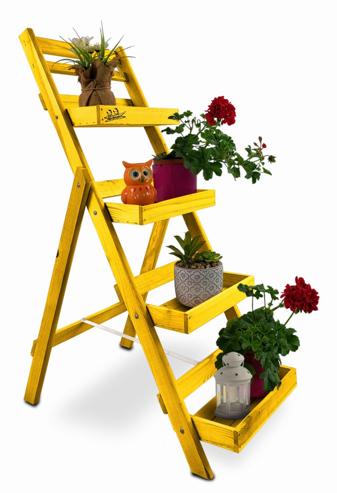 Regał został wykonany z solidnego drewna sosnowego, w kolorze ŻÓŁTYM. To bardzo praktyczny i stylowy element wyposażenia nowoczesnego domu pozwalający zadbać o należny porządek w pomieszczeniach jak i na zewnątrz. Nasz stojak może również pełnić rolę ozdobnego kwietnika do ustawienia na nim doniczek z Twoimi ulubionymi kwiatami na tarasie lub balkonie.