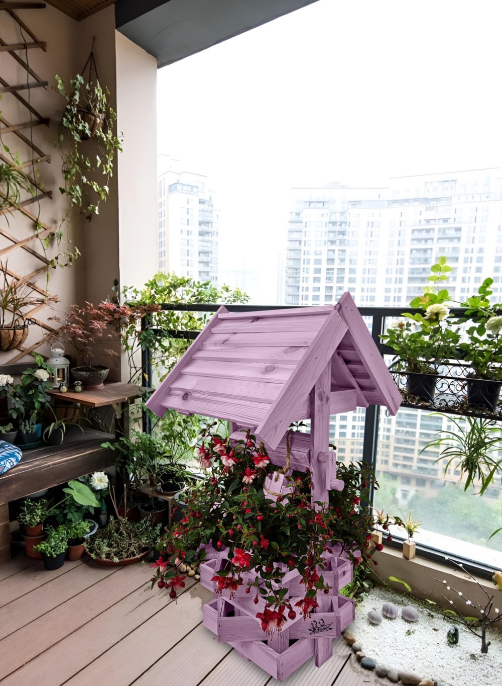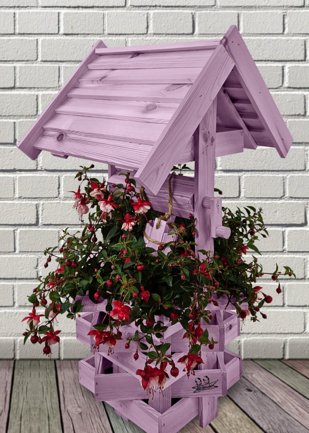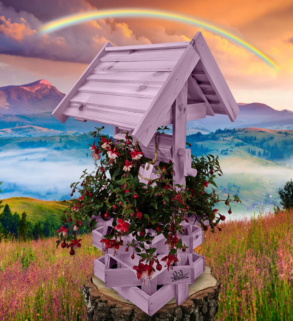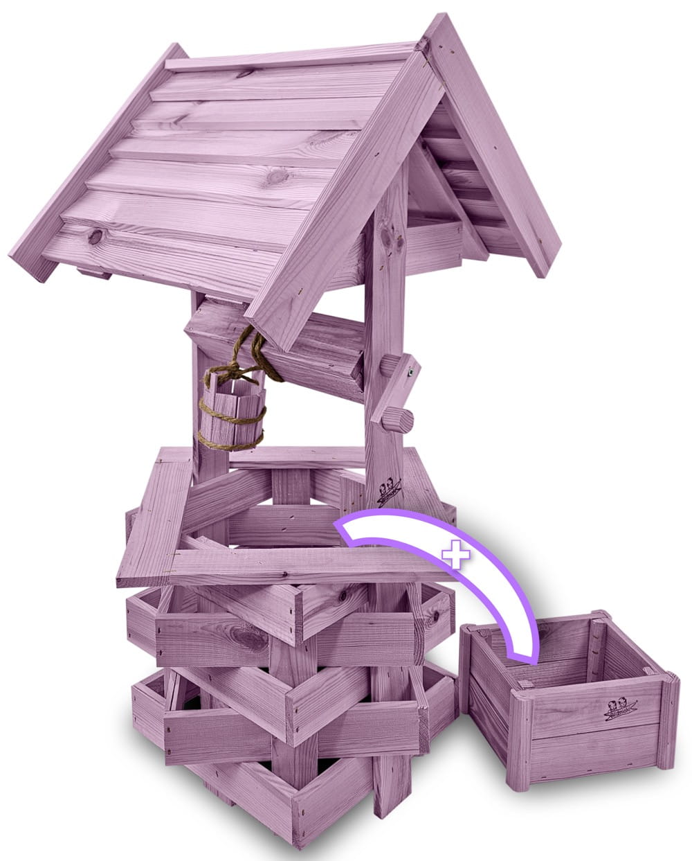 Nasza dekoracyjna studnia w pastelowym fiolecie wykonana z suszonego drewna sosnowego to nie tylko piękny element dekoracyjny, ale również wyraz ekologicznego podejścia do projektowania ogrodów.