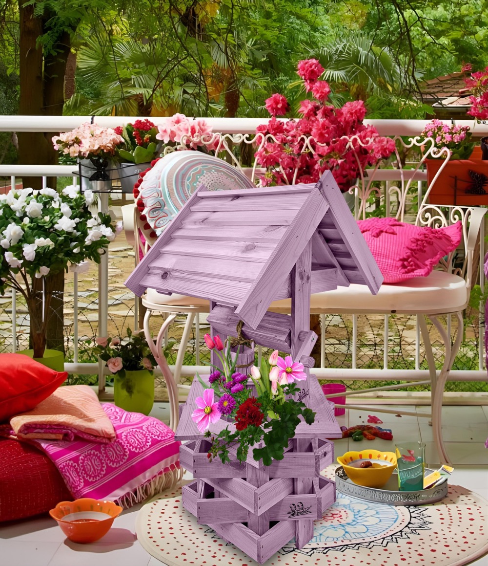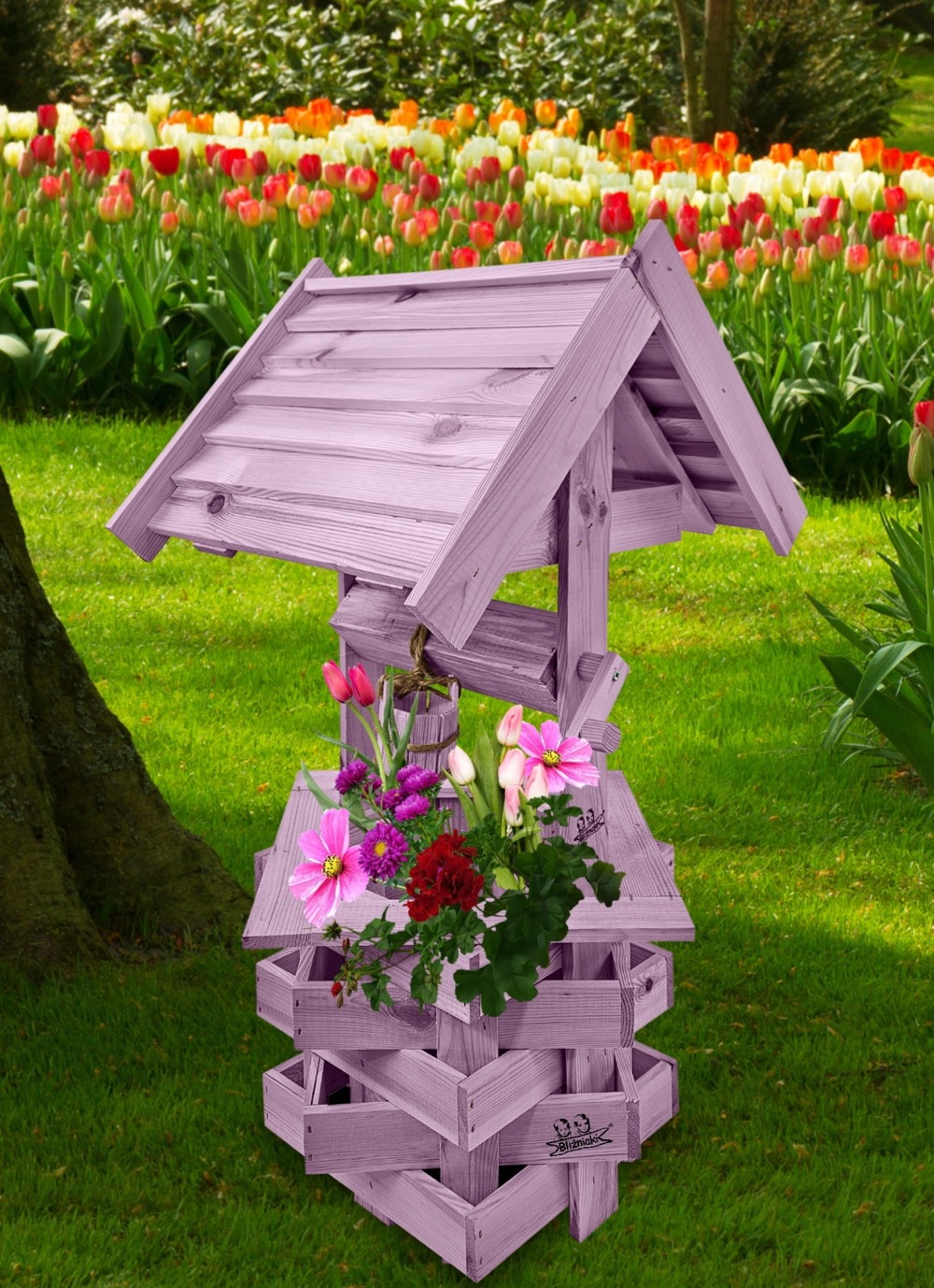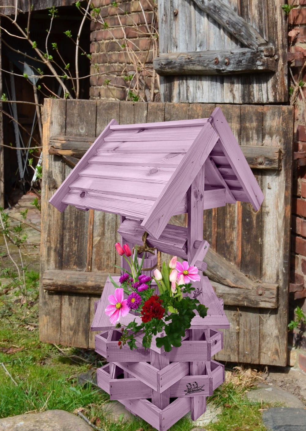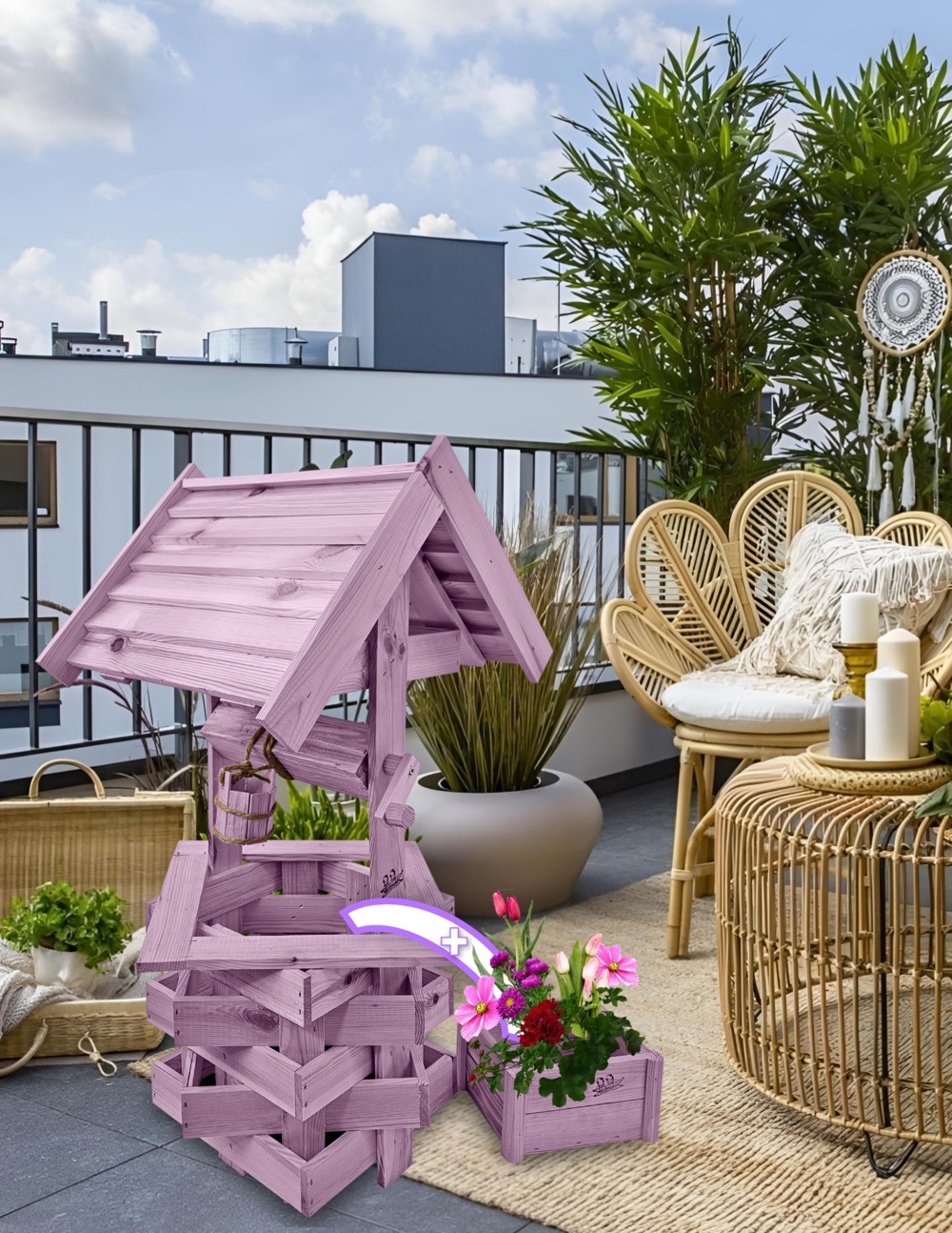 Nasza dekoracyjna studnia w pastelowym fiolecie wykonana z suszonego drewna sosnowego to nie tylko piękny element dekoracyjny, ale również wyraz ekologicznego podejścia do projektowania ogrodów.