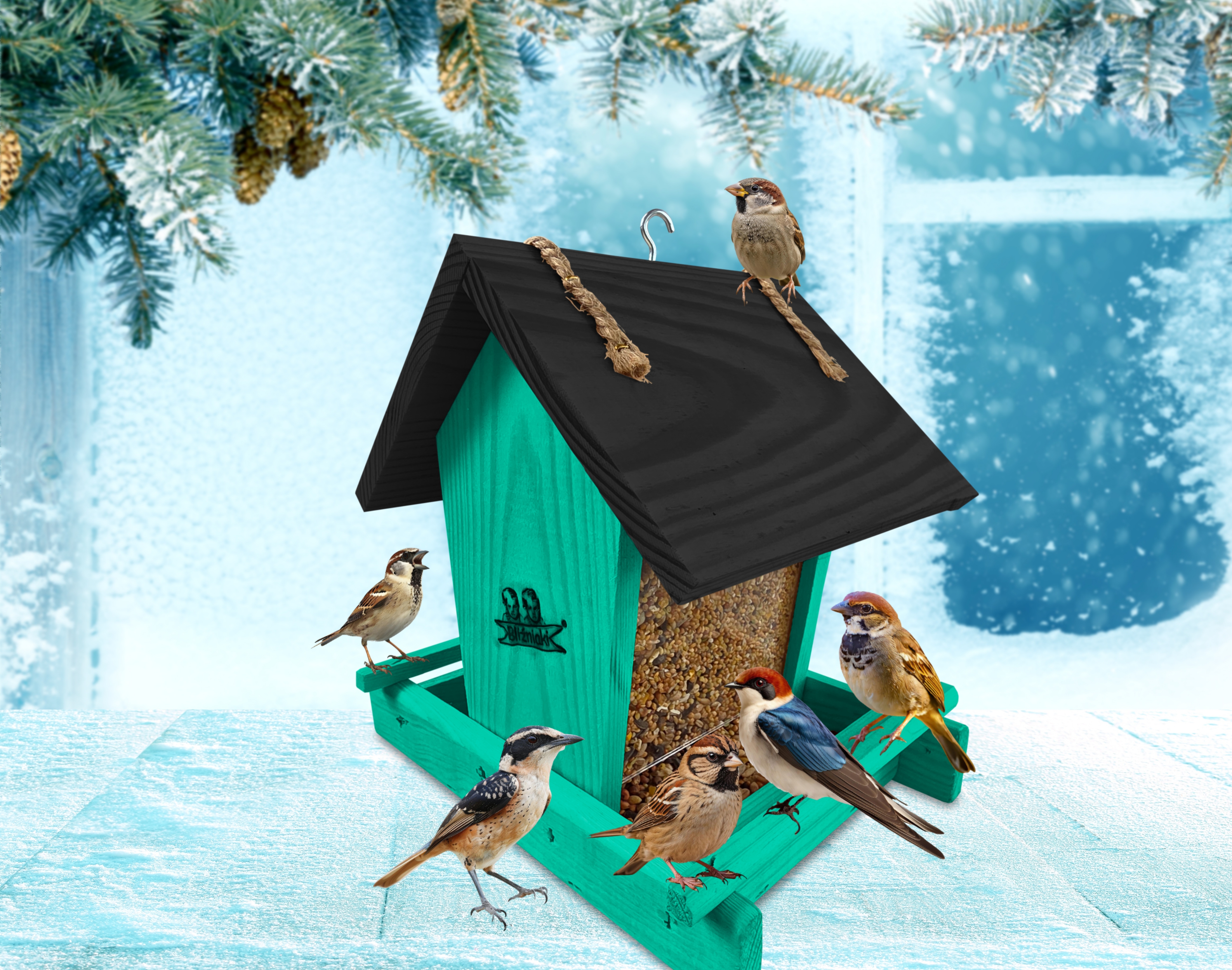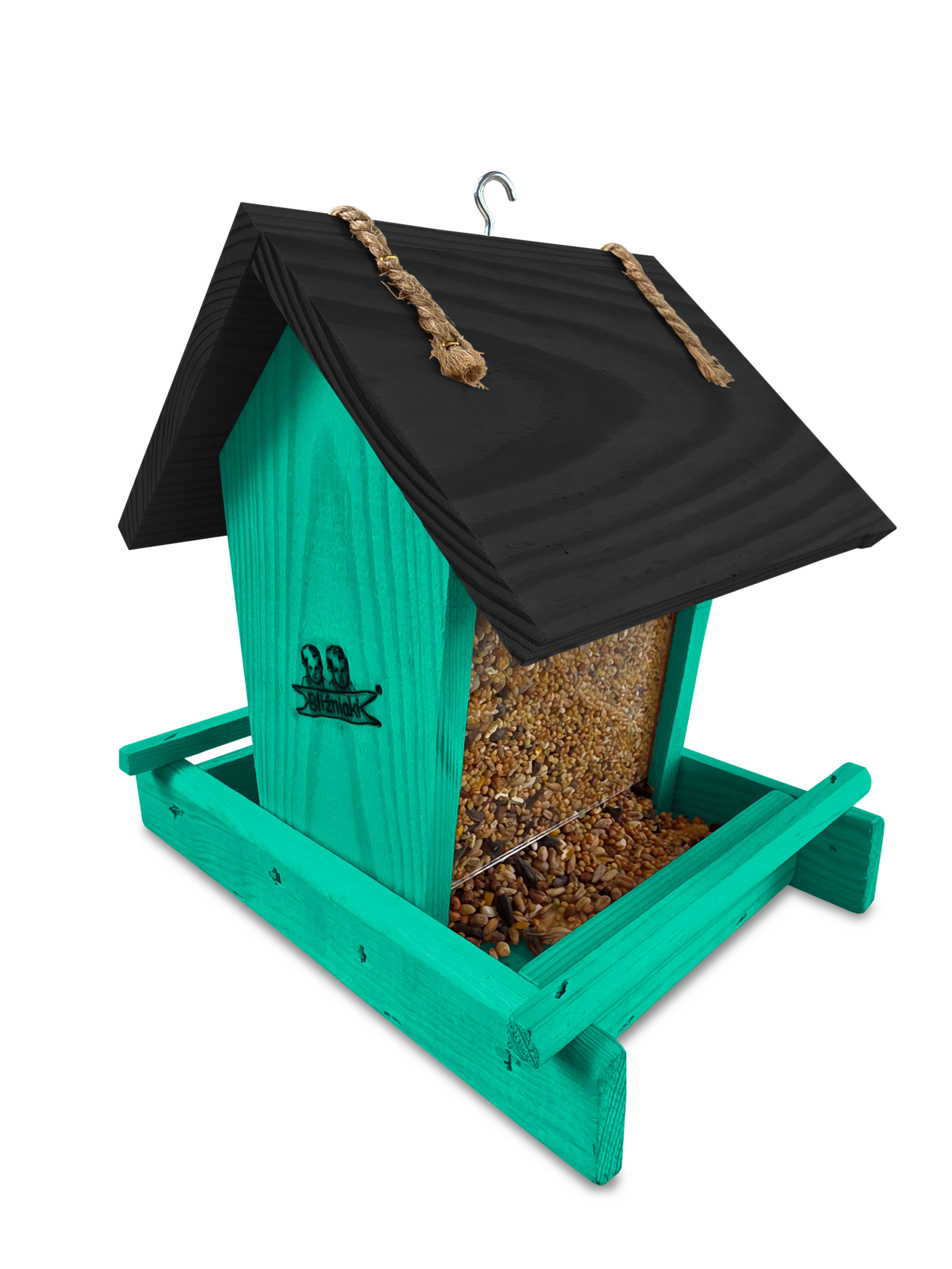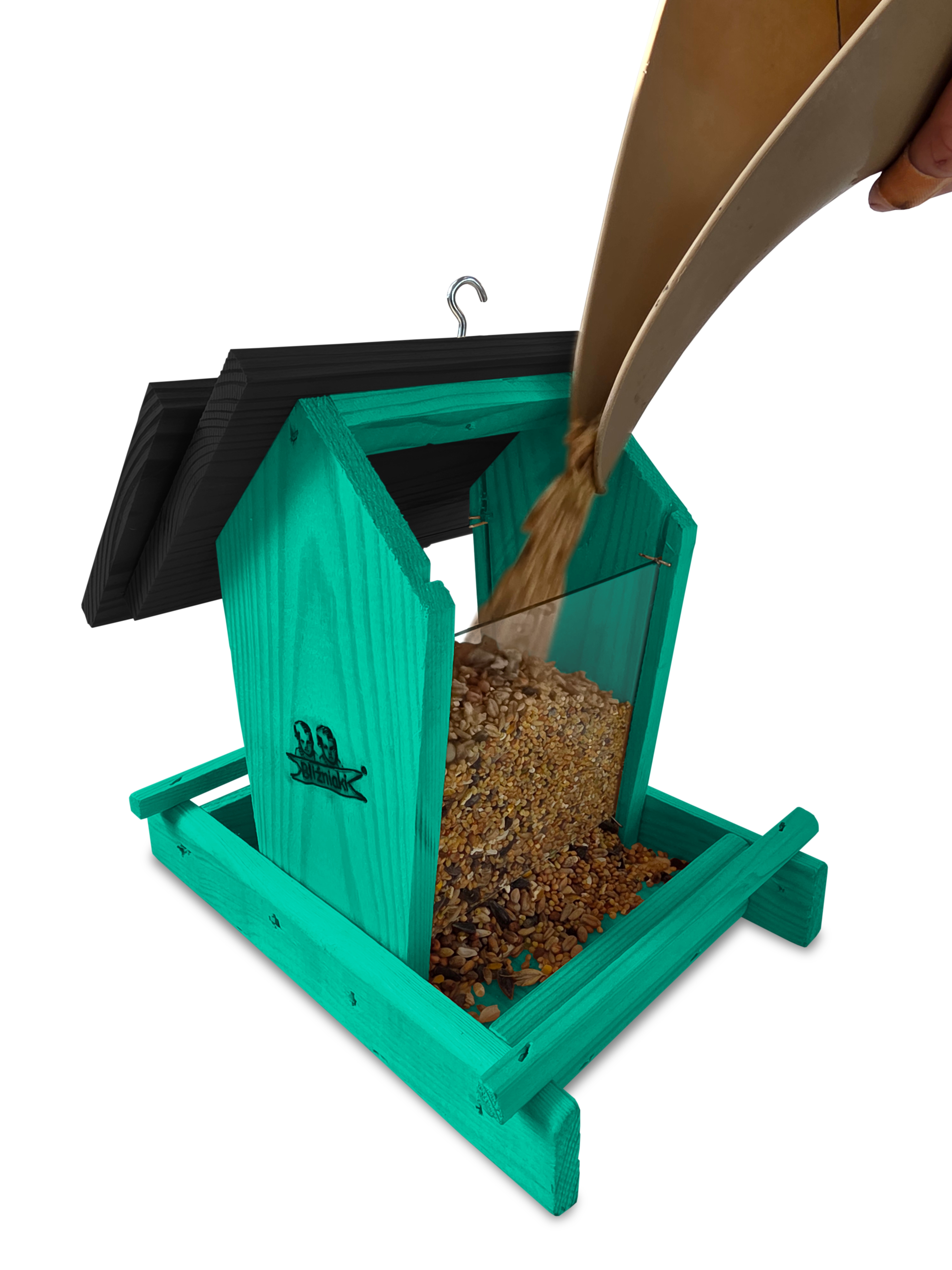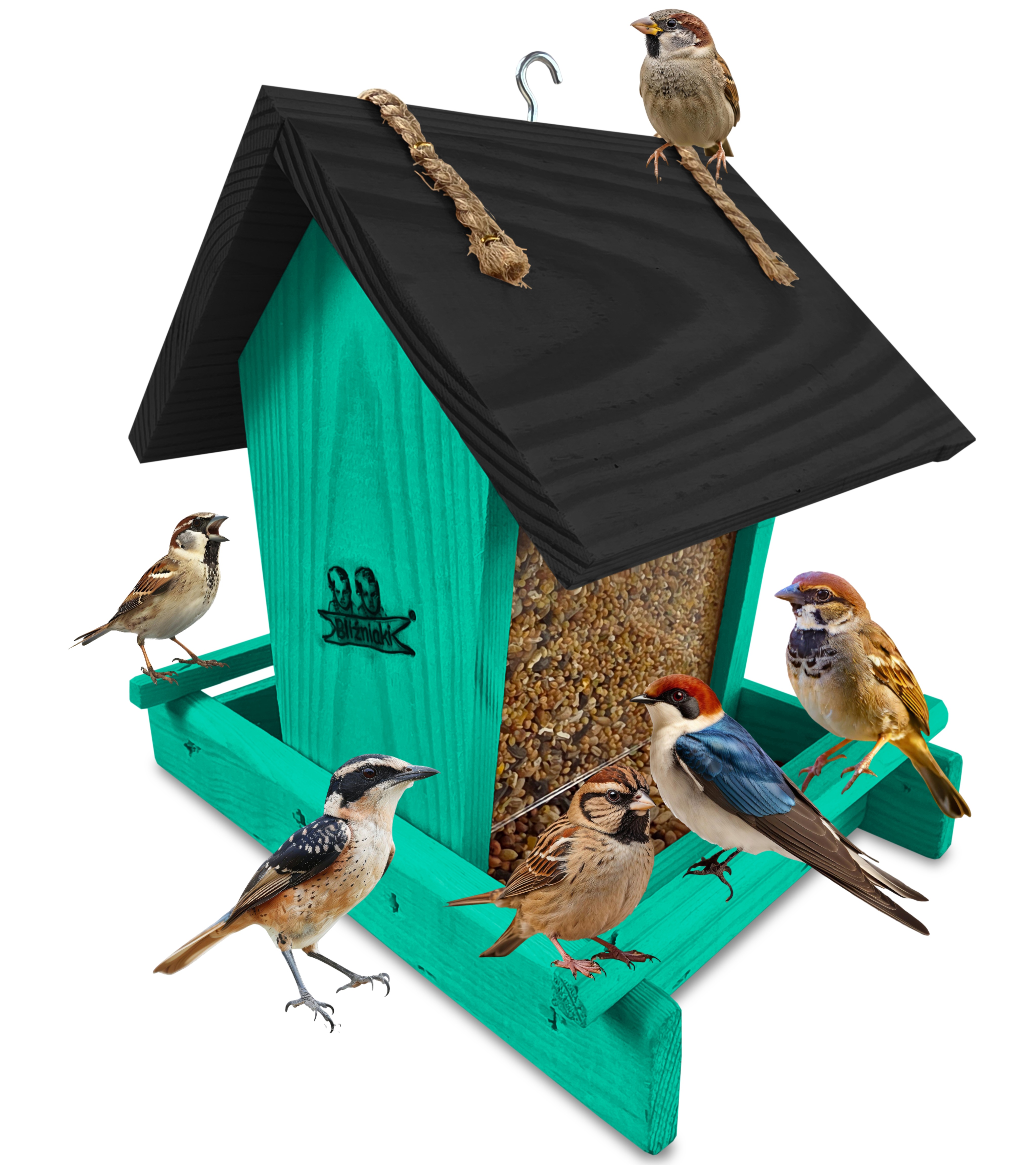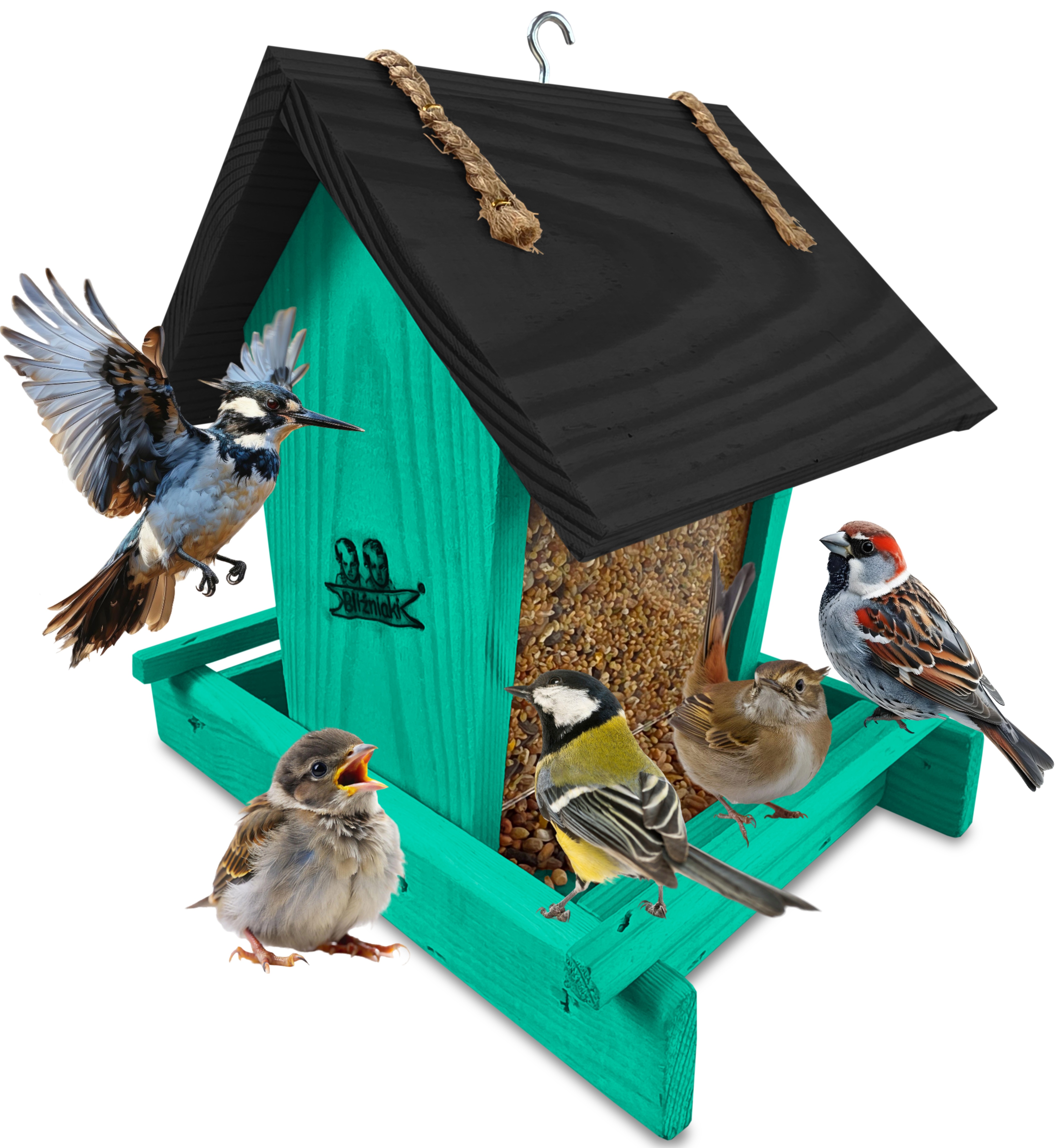 Przedmiotem sprzedaży jest ozdobny drewniany karmnik dla ptaków z dozownikiem ziarna model K29 MR CZ kolor morska zieleń z czarnym dachem