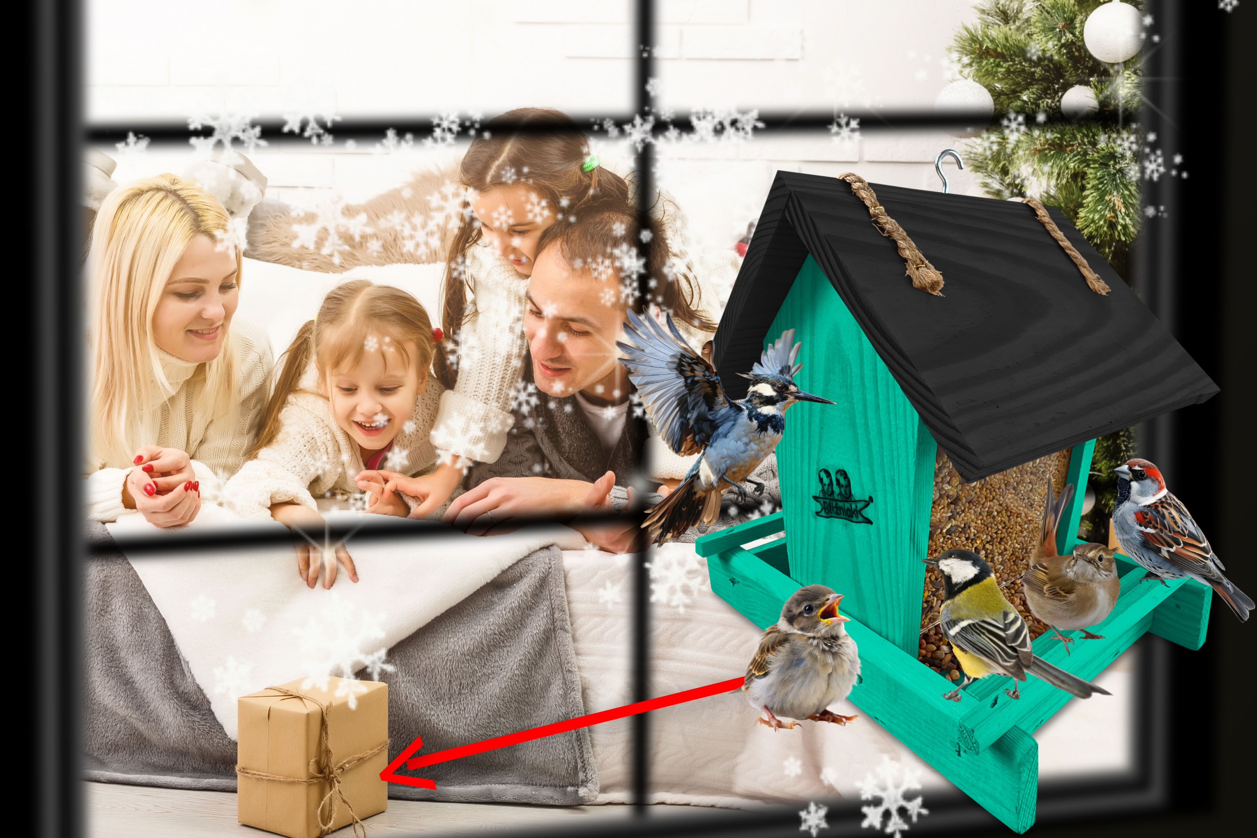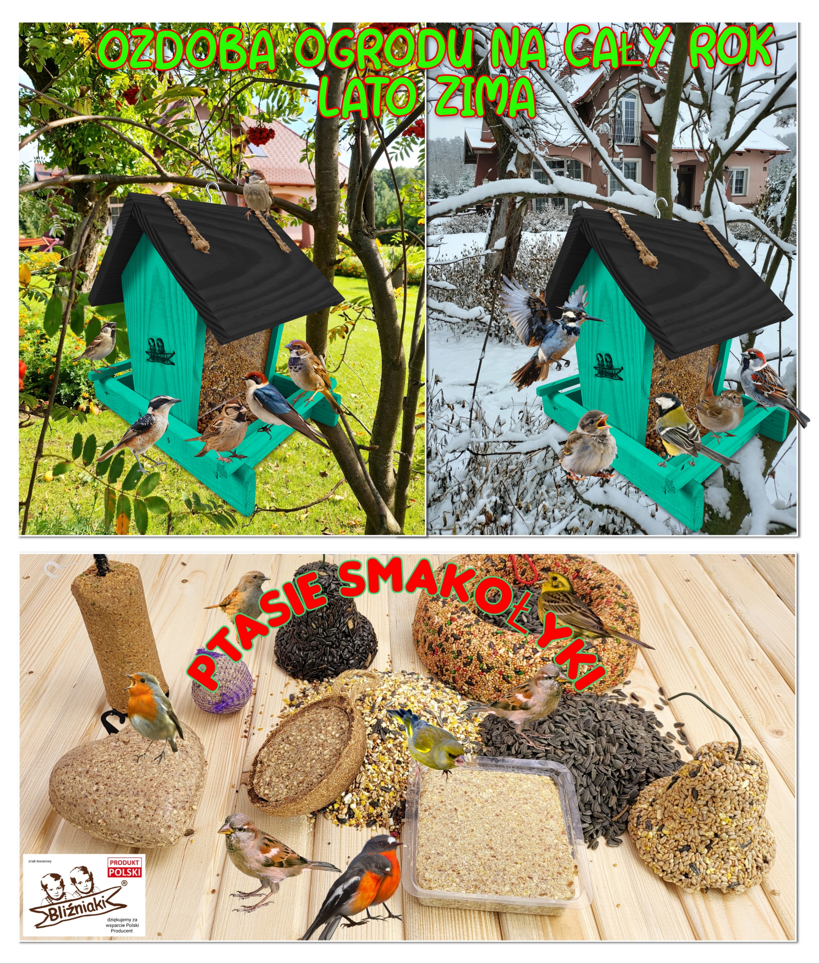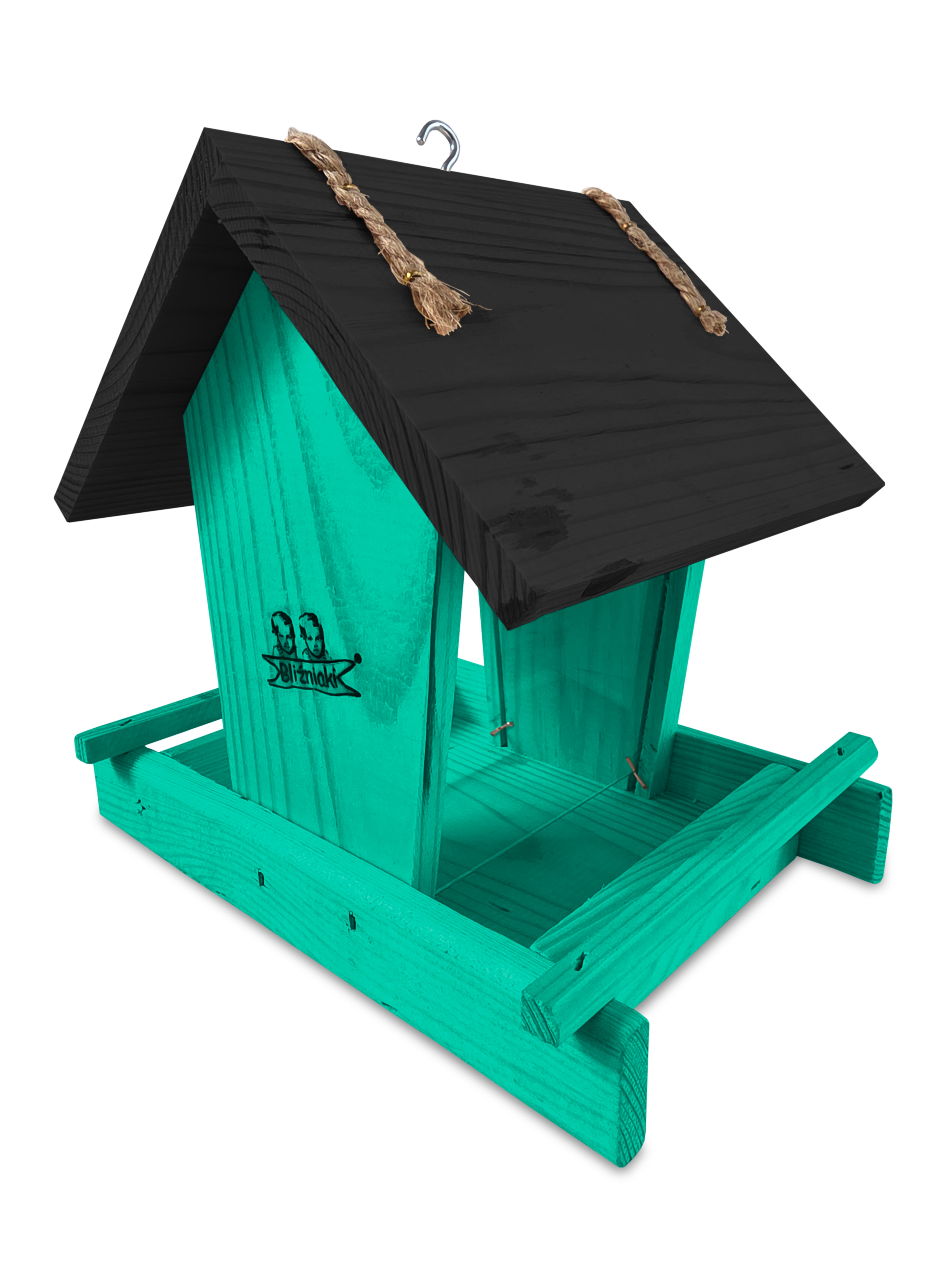 - Karmnik wykonany jest w całości z drewna iglastego, KOLOR MORSKA ZIELEŃ Z CZARNYM DACHEM