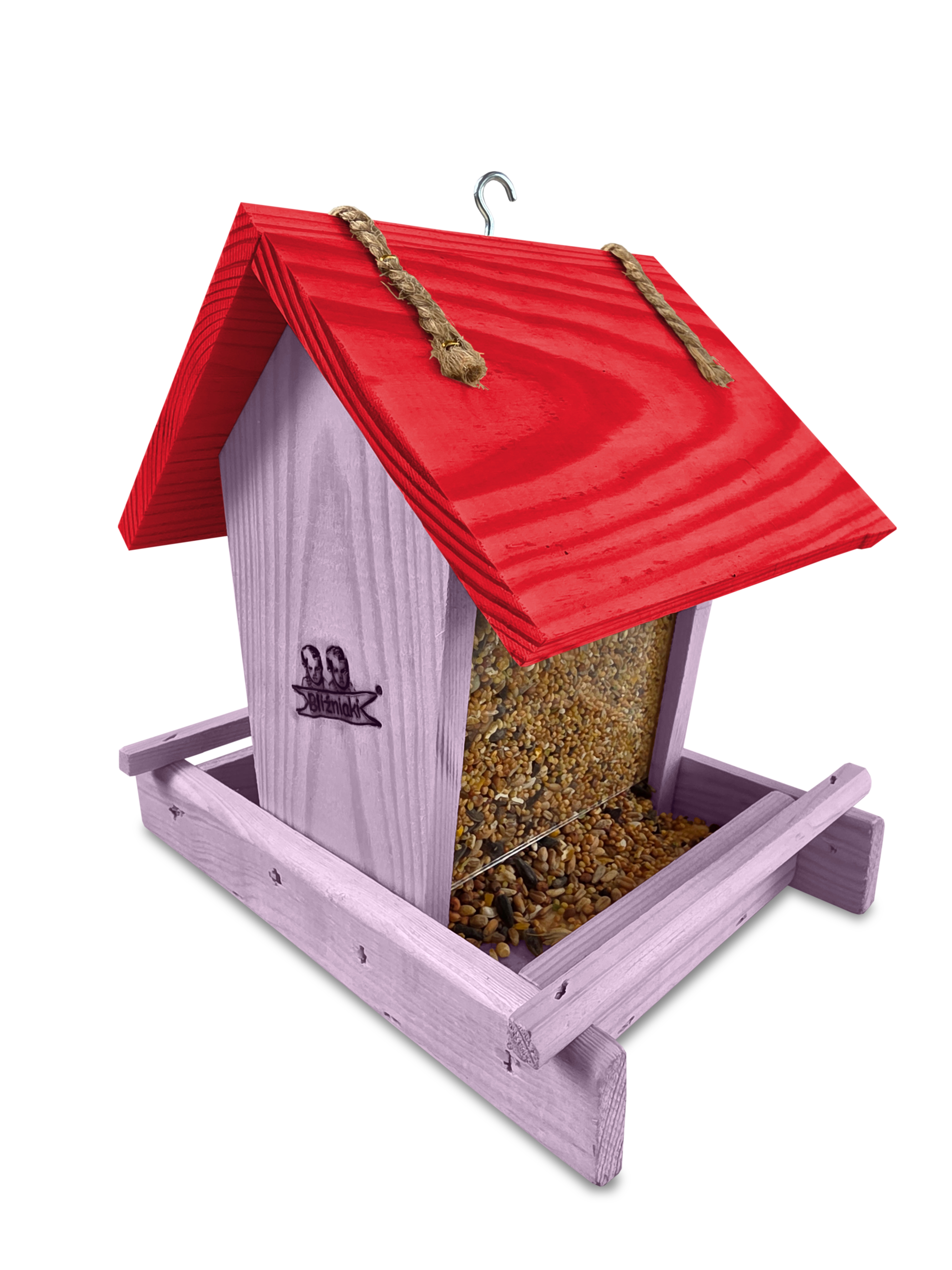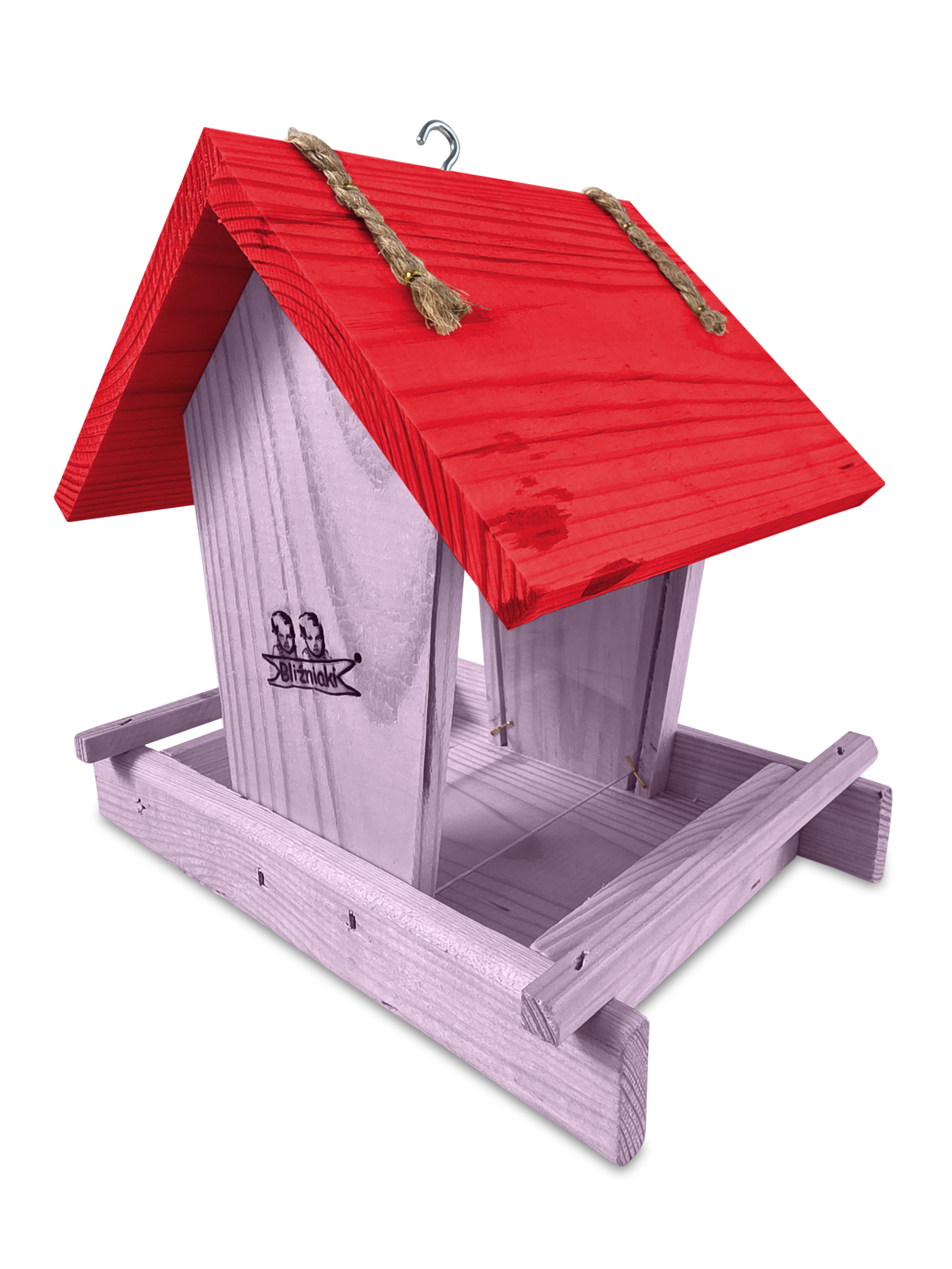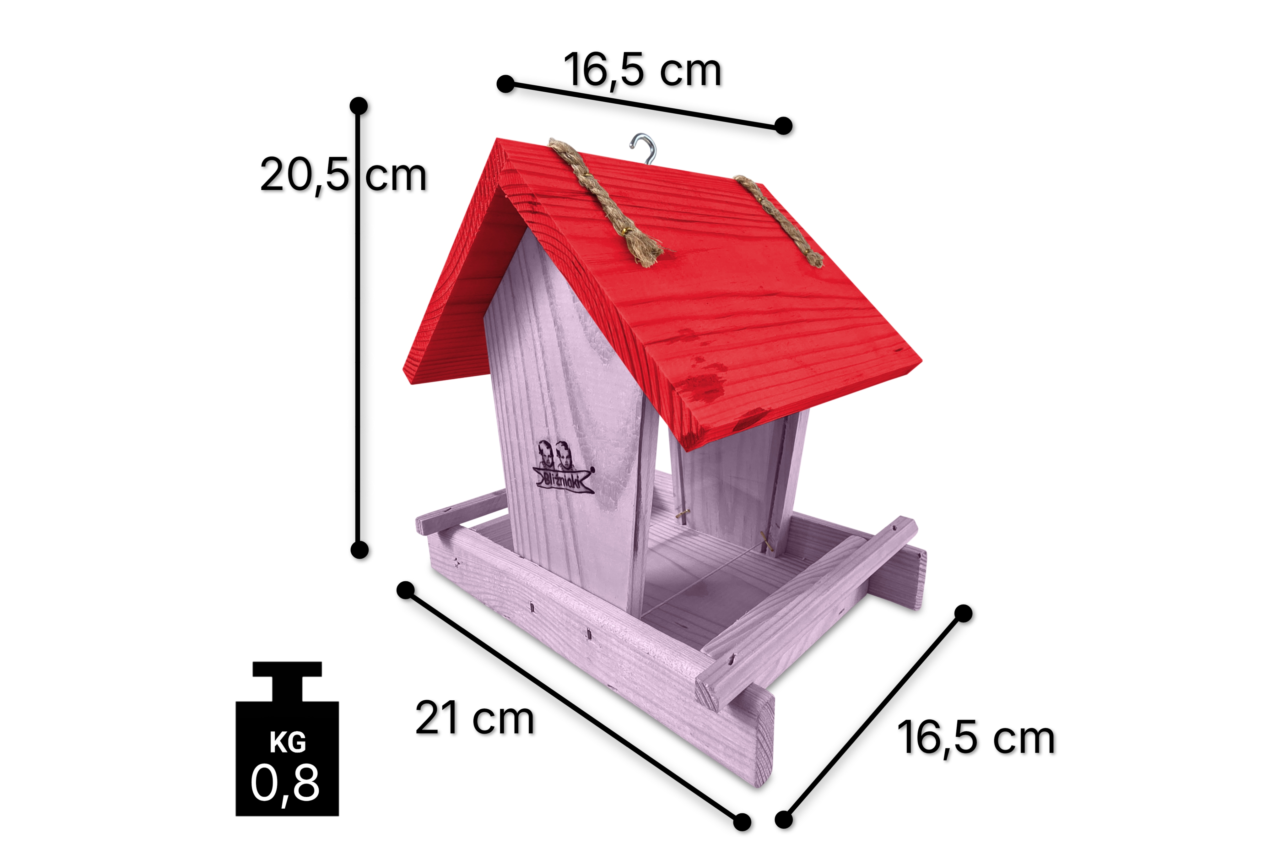 - Karmnik wykonany jest w całości z drewna iglastego, KOLOR JASNY FIOLET Z CZERWONYM DACHEM