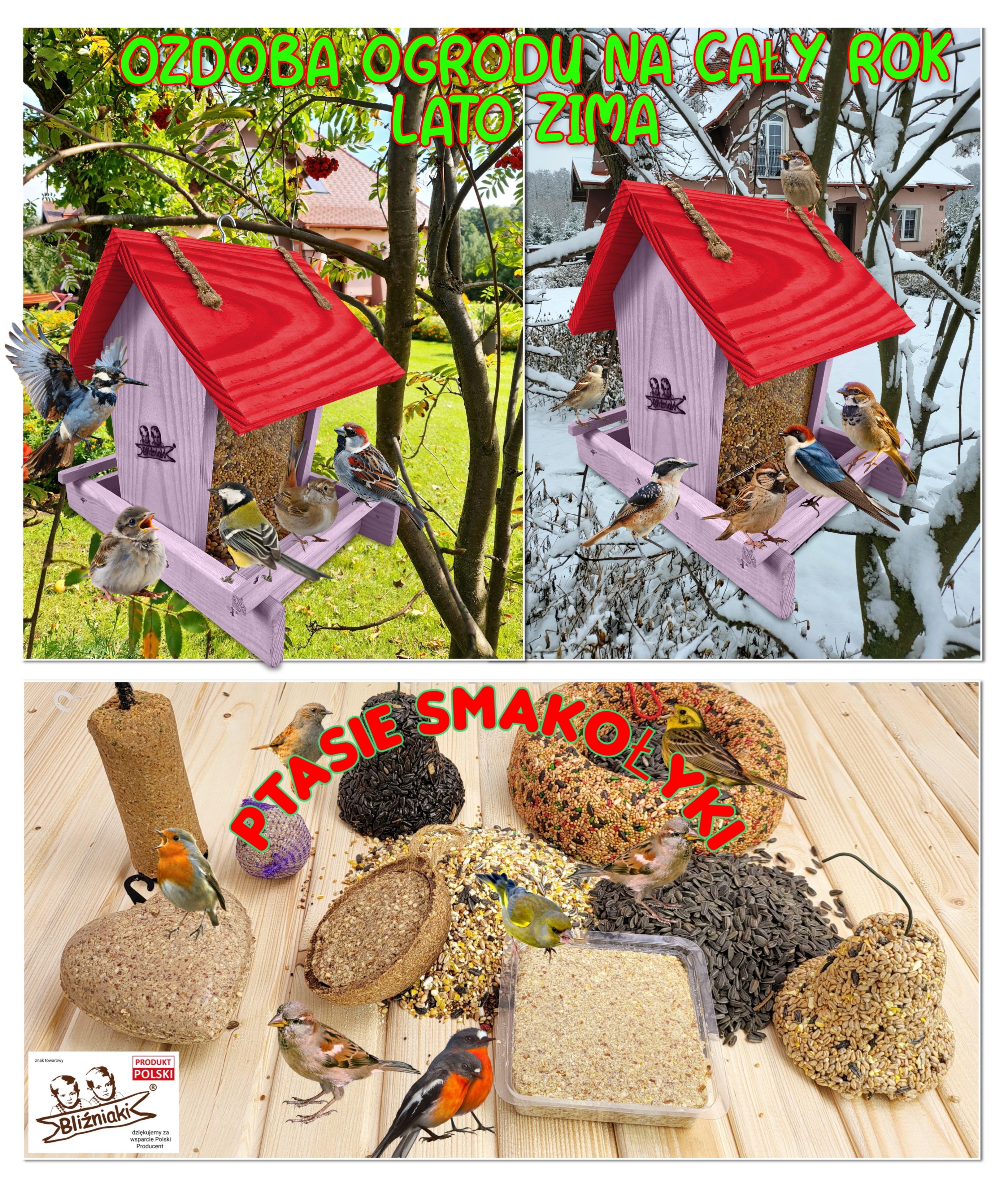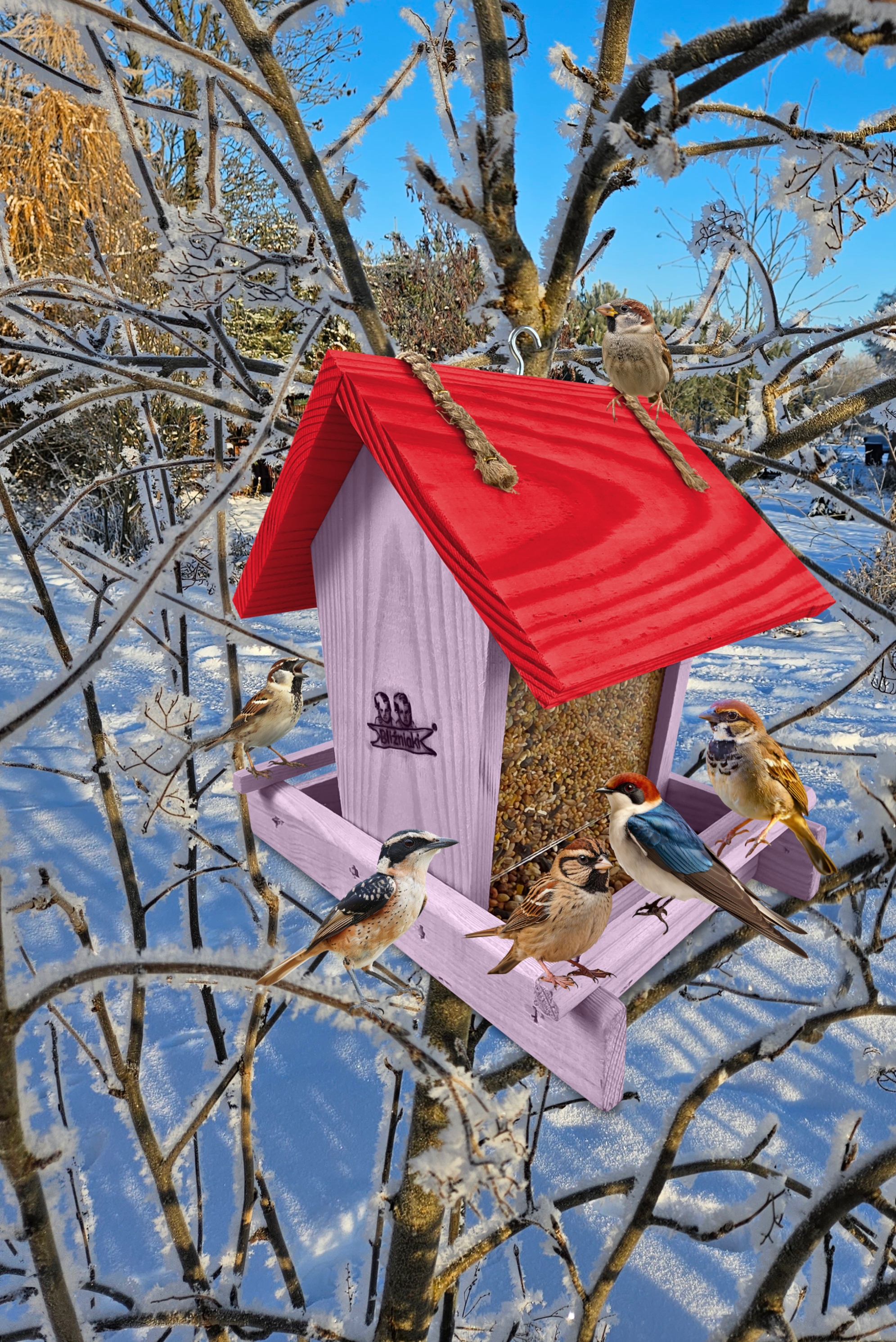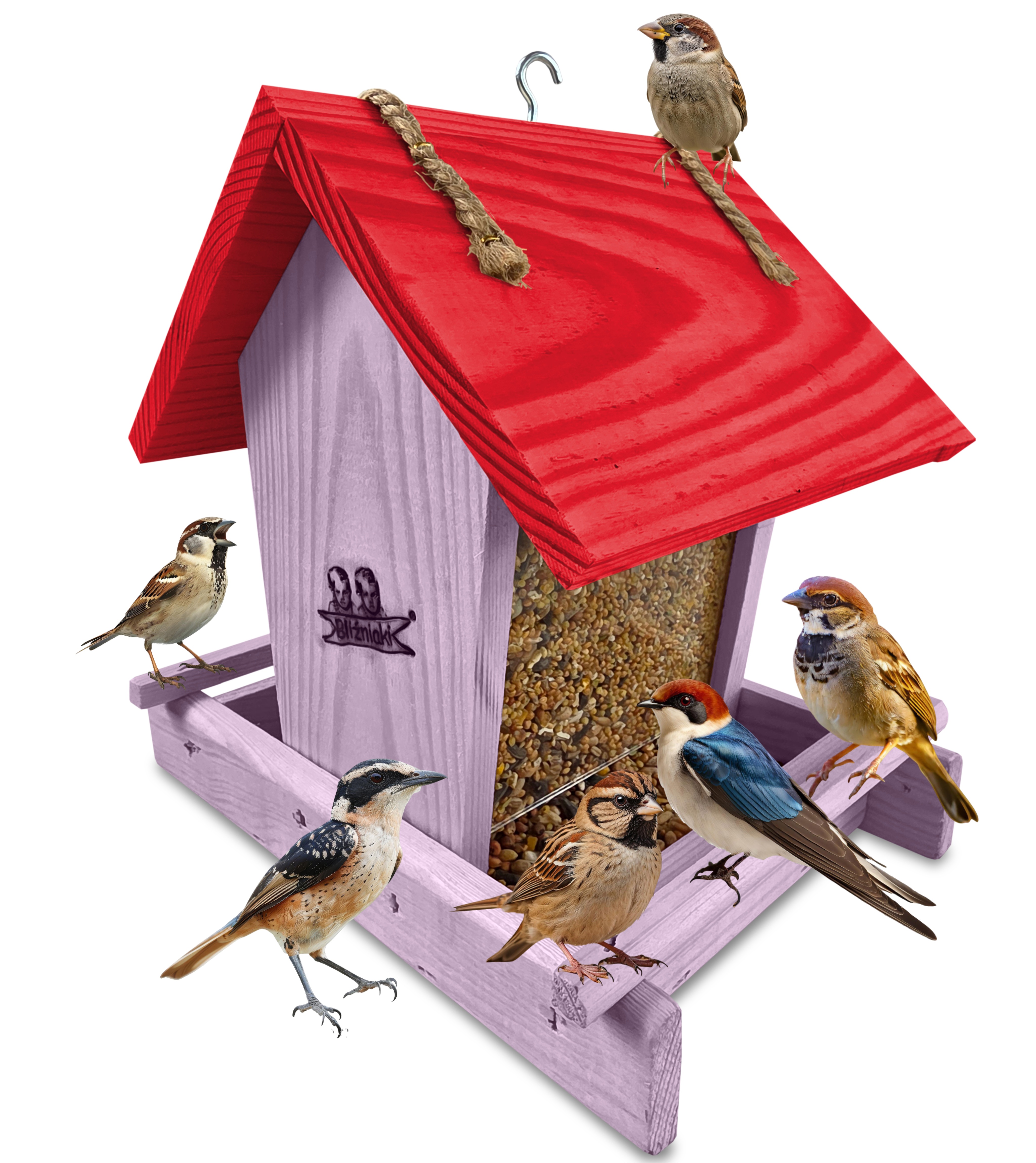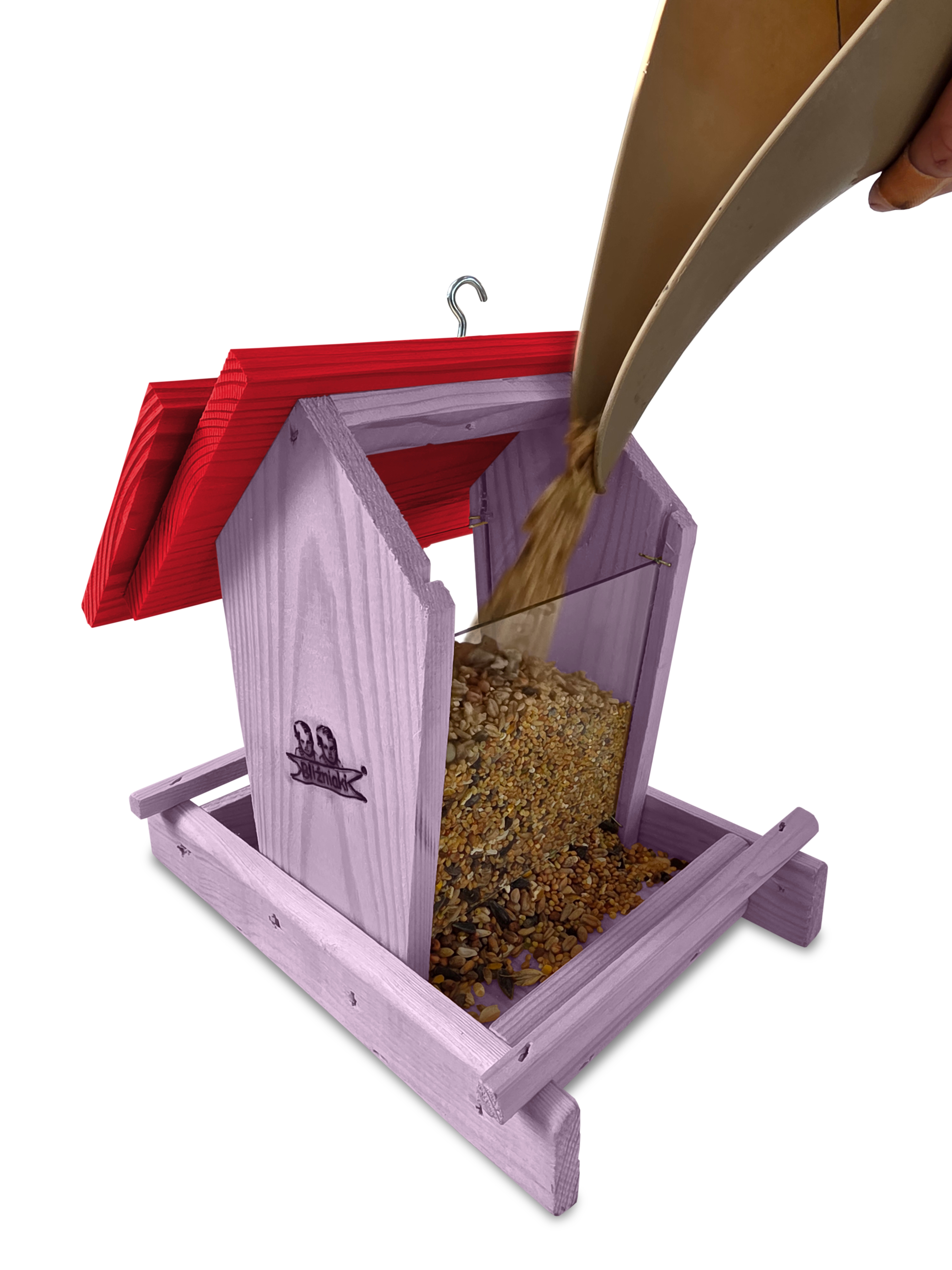 - Karmnik wykonany jest w całości z drewna iglastego, KOLOR JASNY FIOLET Z CZERWONYM DACHEM