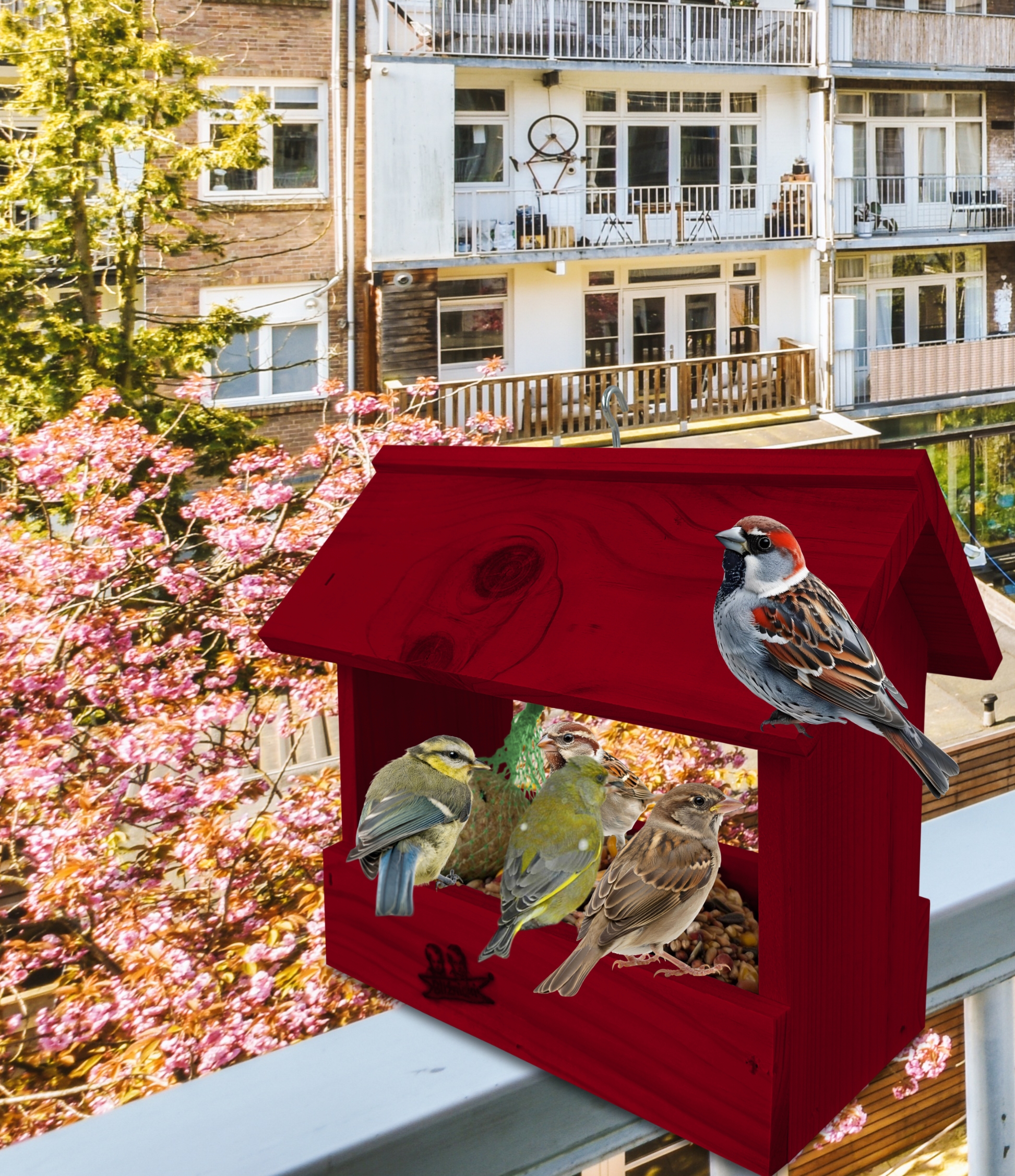 Karmnik posiada haczyk, umożliwiający zawieszenie go na balkonie, drzewie, pod dachem altany. Dzięki temu przylatujące do niego ptaki nie staną się łatwym kąskiem dla kotów i innych zwierząt. Dzięki małym gabarytom, z łatwością można wkomponować go w elementy architektury ogrodowej, na balkonie czy nawet parapecie.