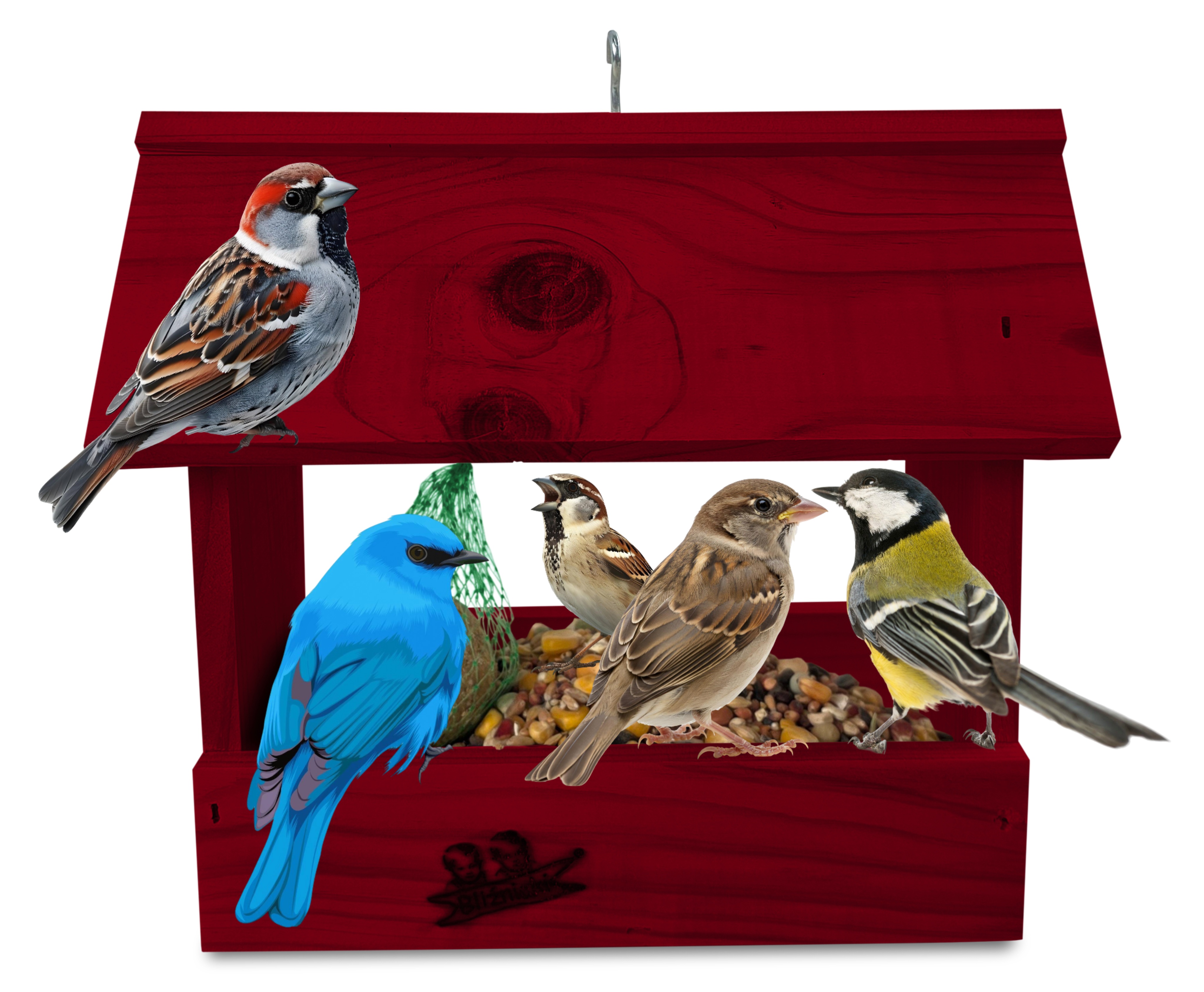 - U góry widoczny jest haczyk umożliwiający zawieszenie karmnika w dowolnym miejscu, możliwe jest również jego postawienie