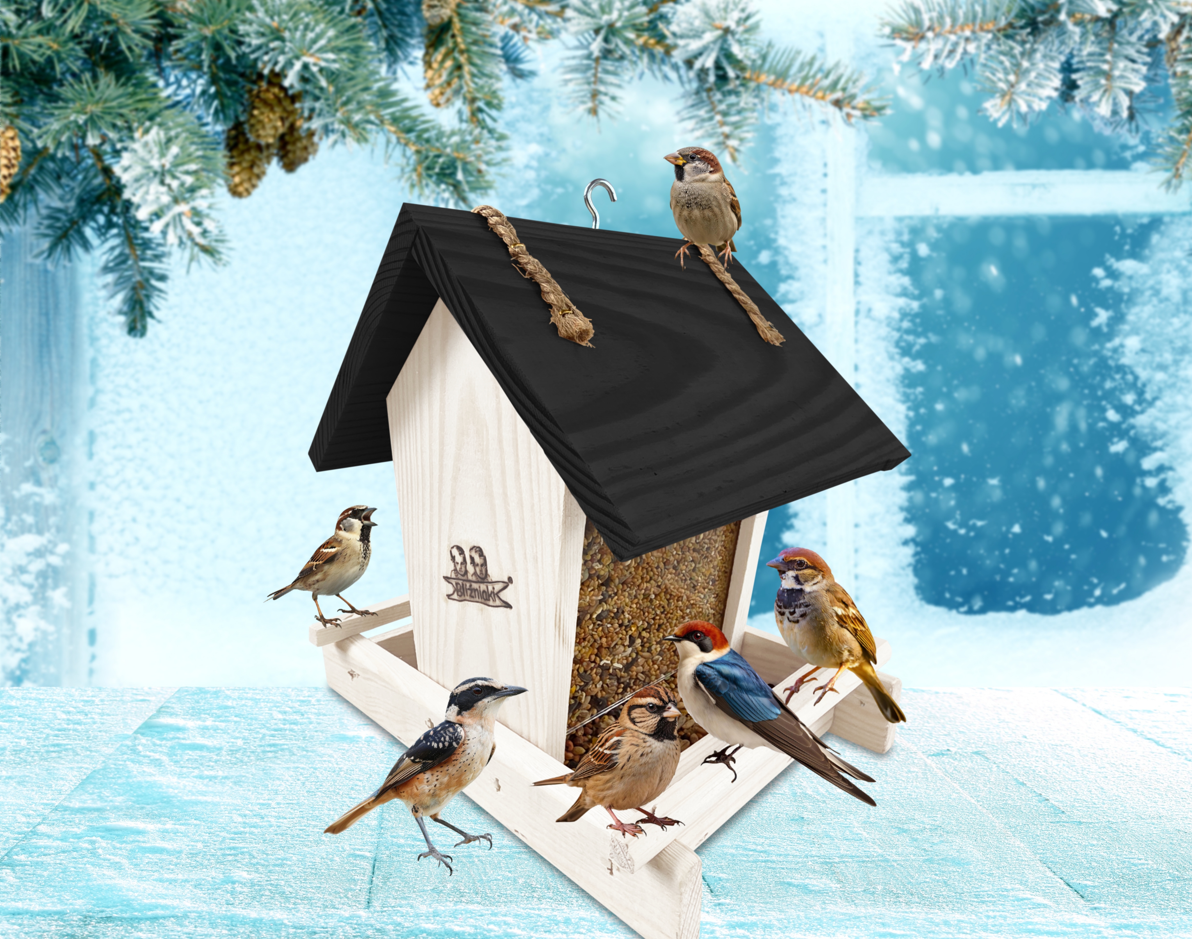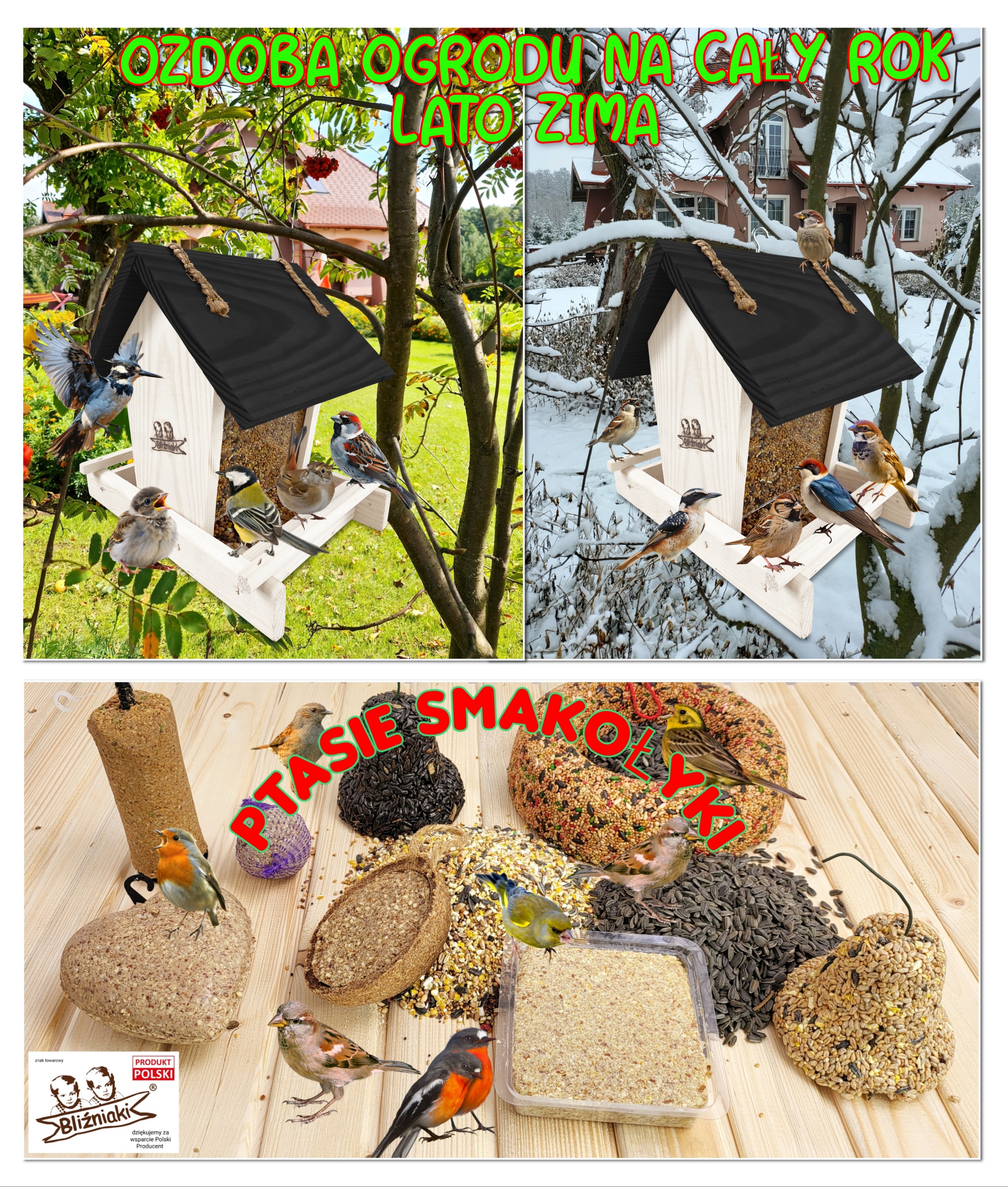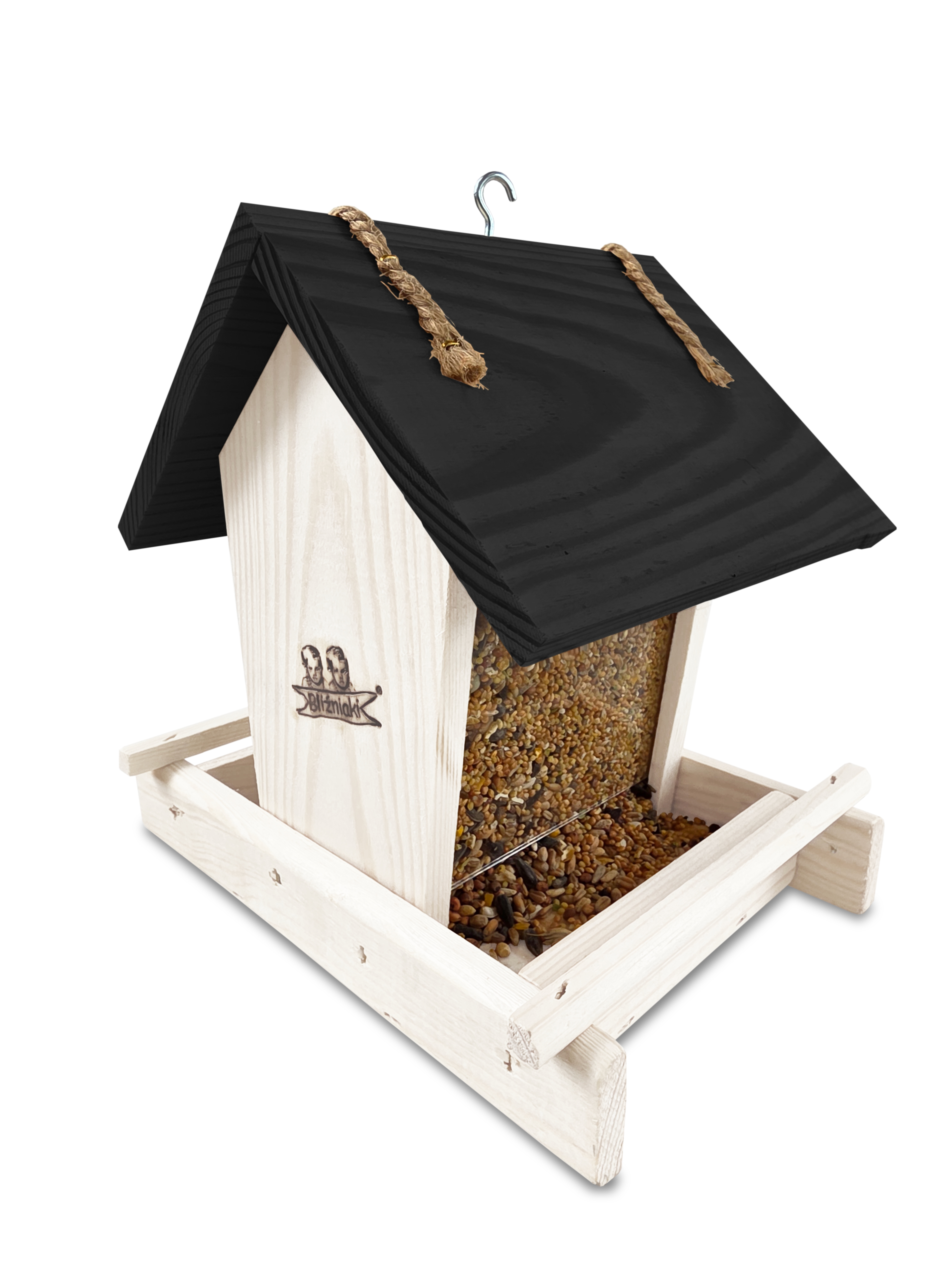 Przedmiotem sprzedaży jest ozdobny drewniany karmnik dla ptaków z dozownikiem ziarna model K29 BI CZ w kolorze białym z czarnym dachem