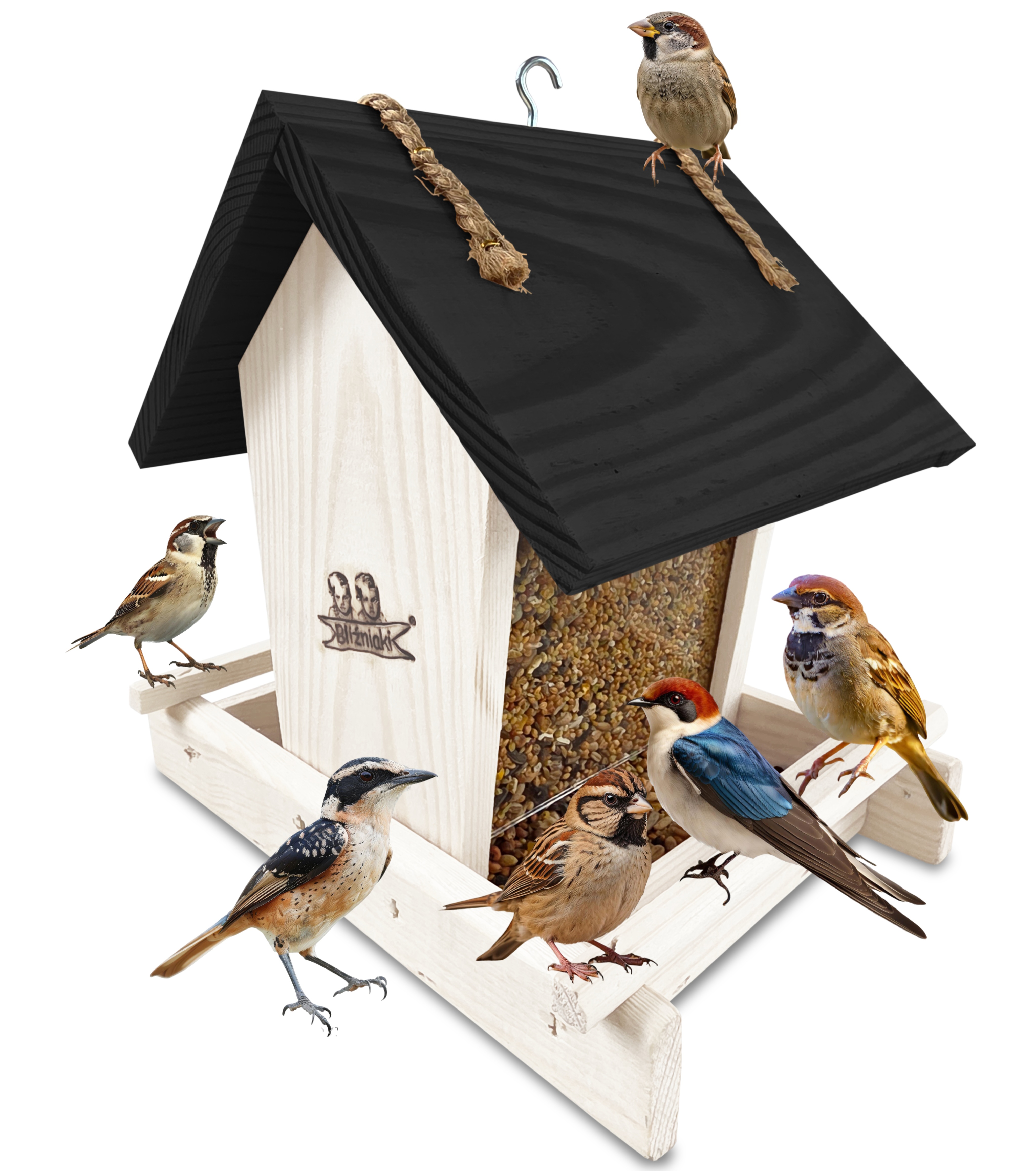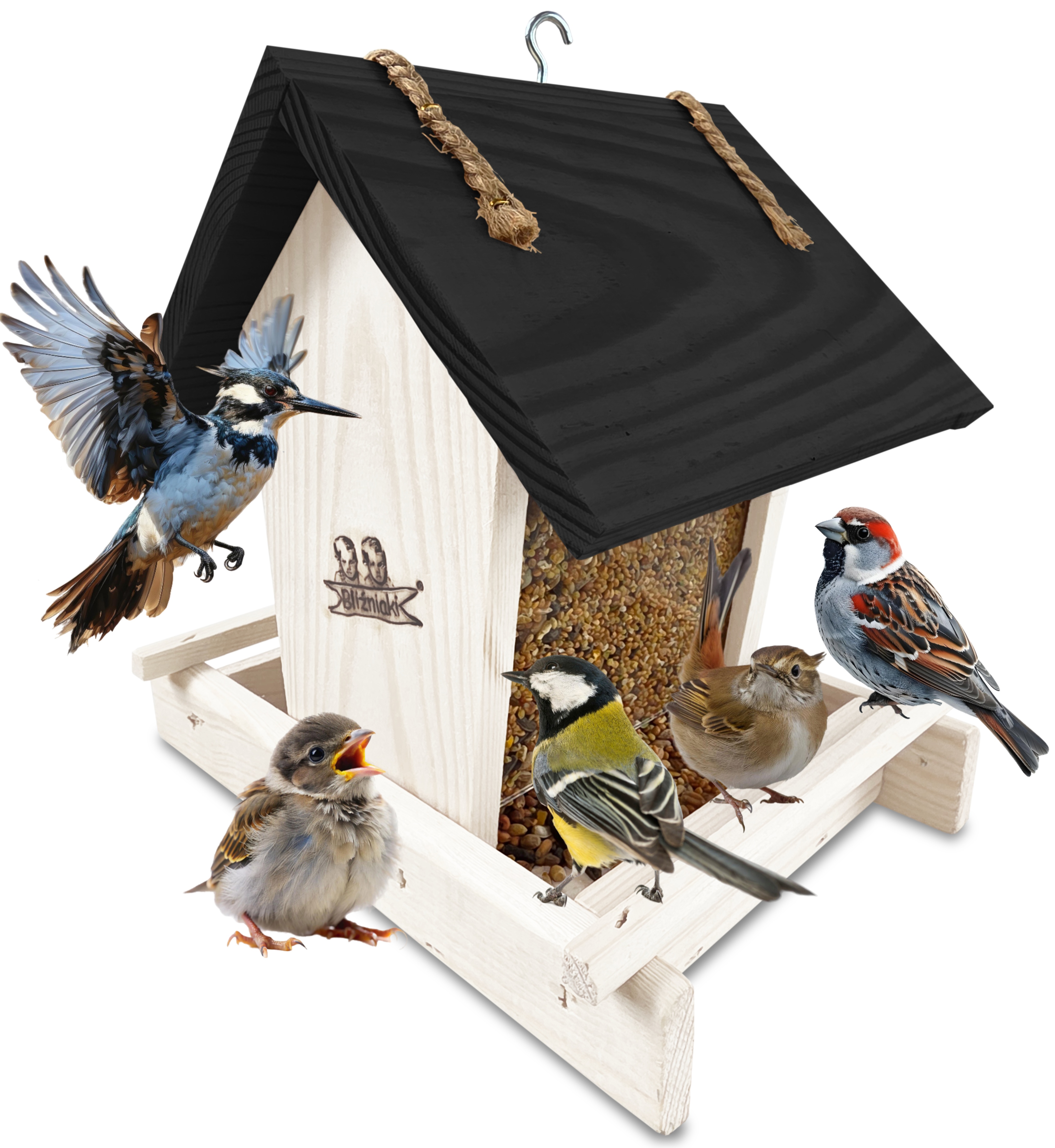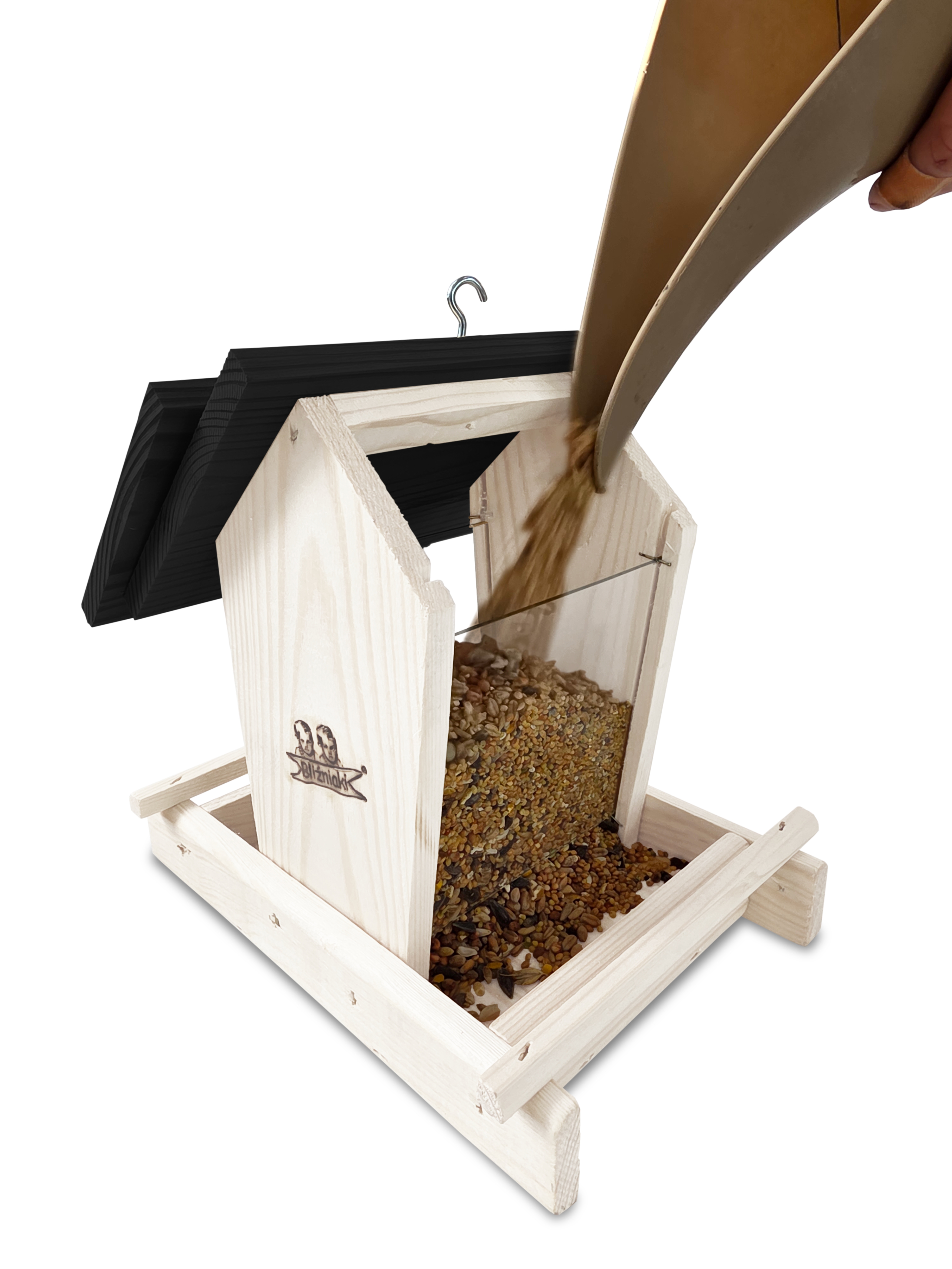 Przedmiotem sprzedaży jest ozdobny drewniany karmnik dla ptaków z dozownikiem ziarna model K29 BI CZ w kolorze białym z czarnym dachem