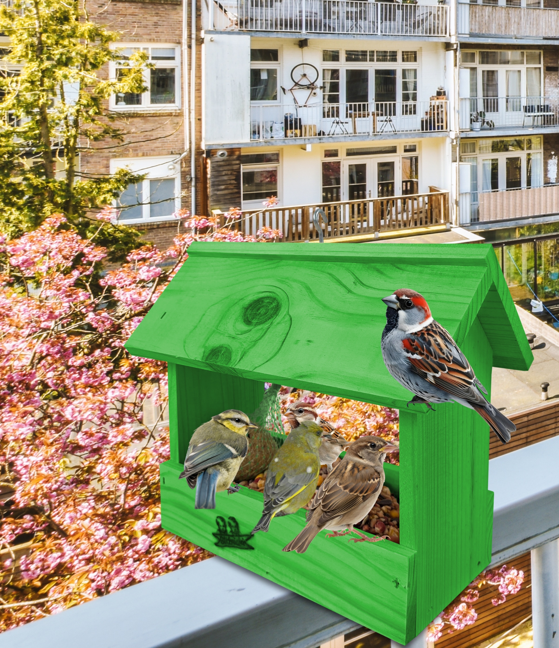Karmnik posiada haczyk, umożliwiający zawieszenie go na balkonie, drzewie, pod dachem altany. Dzięki temu przylatujące do niego ptaki nie staną się łatwym kąskiem dla kotów i innych zwierząt. Dzięki małym gabarytom, z łatwością można wkomponować go w elementy architektury ogrodowej, na balkonie czy nawet parapecie.