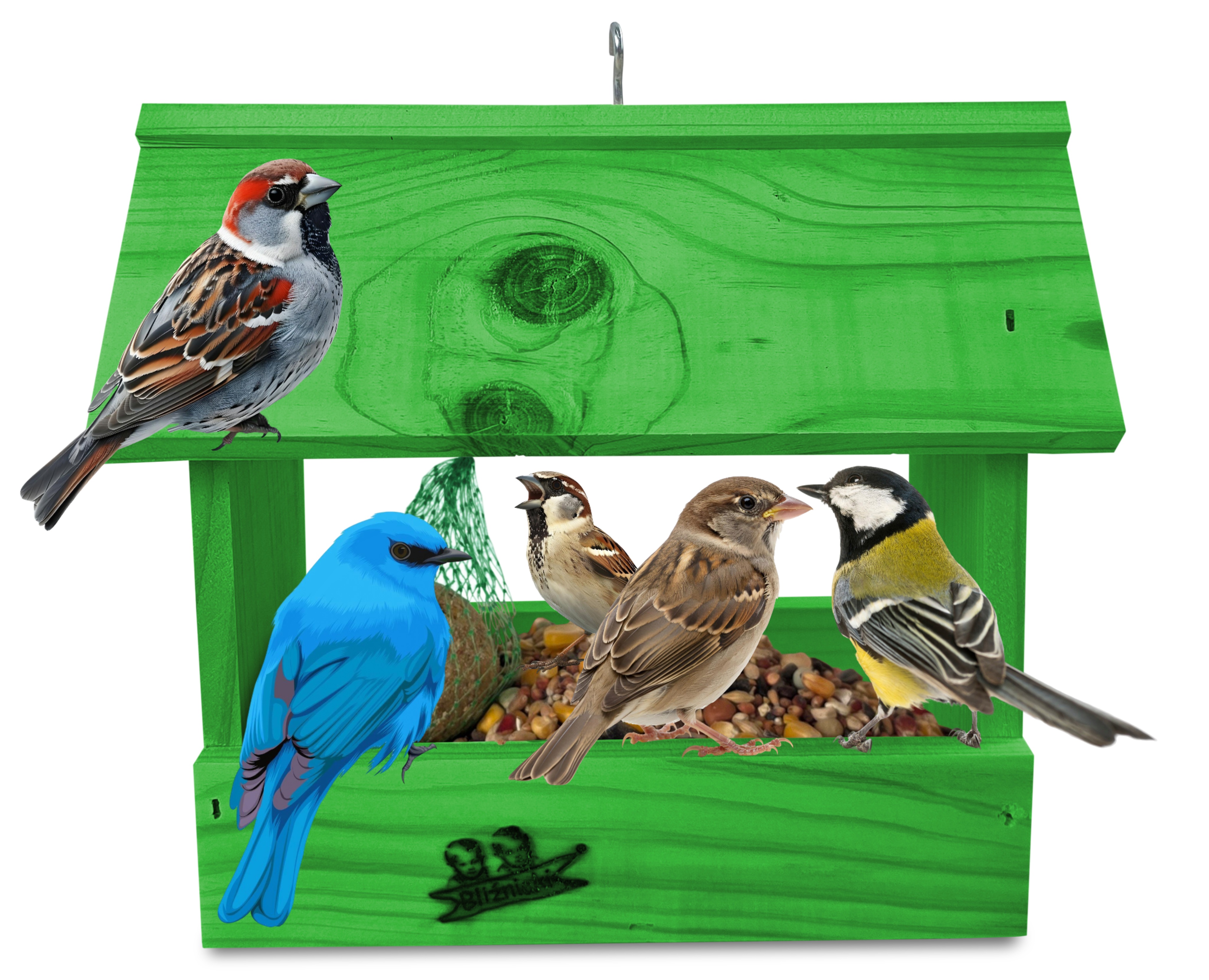 - U góry widoczny jest haczyk umożliwiający zawieszenie karmnika w dowolnym miejscu, możliwe jest również jego postawienie