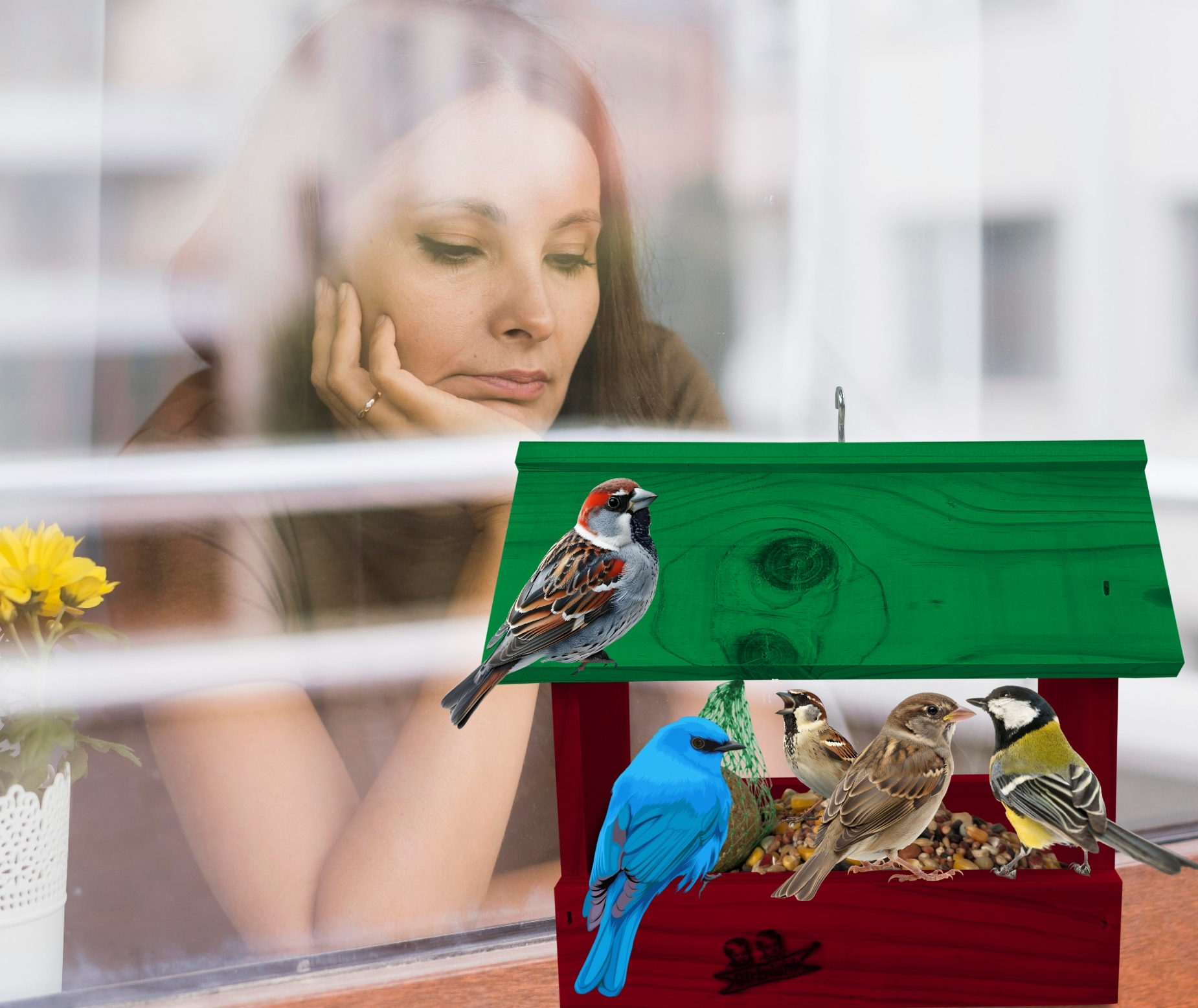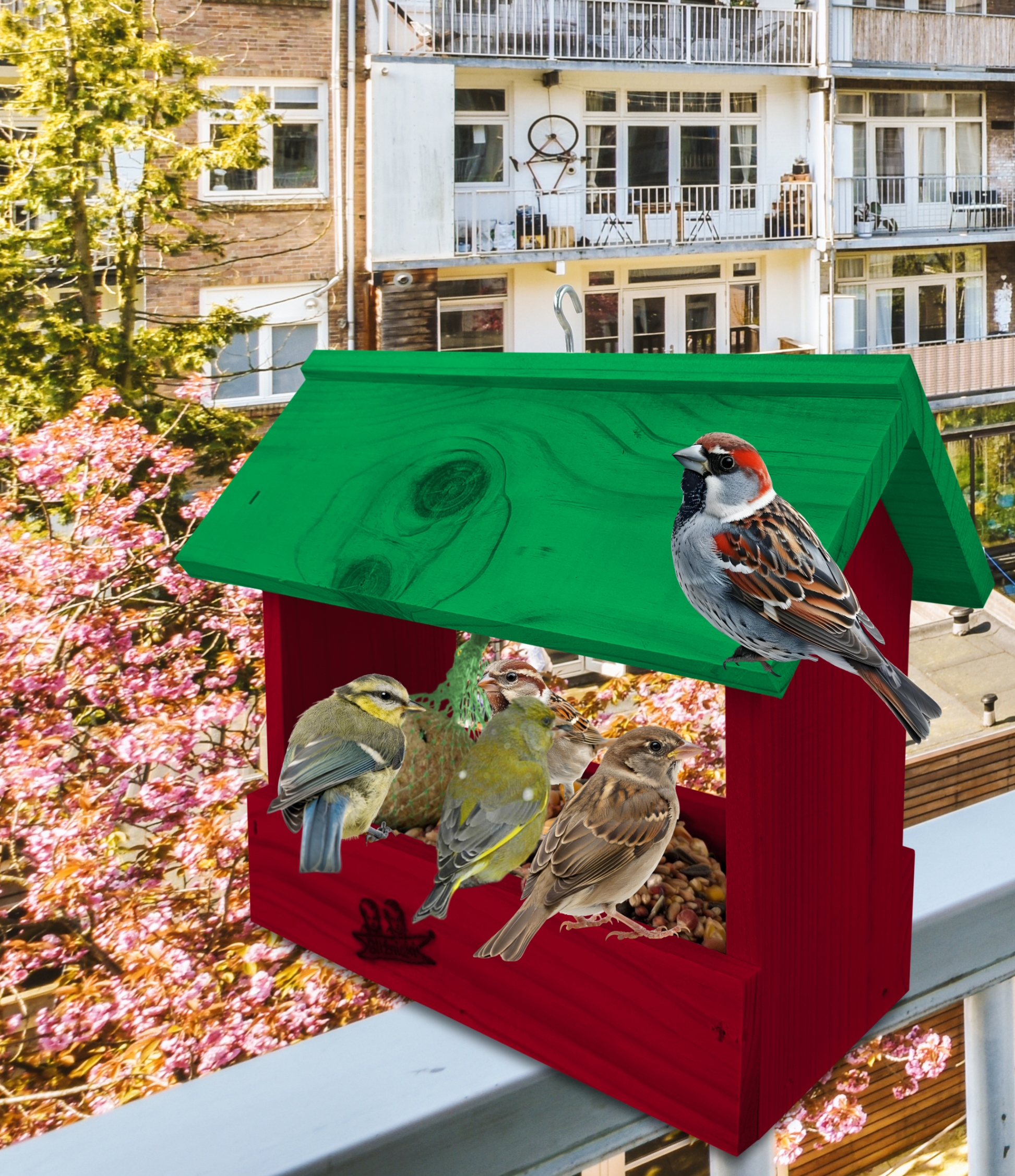 Przedmiotem sprzedaży jest ozdobny drewniany karmnik dla ptaków budka domek na balkon K204 MA K kolor mahoniowy z zielonym dachem