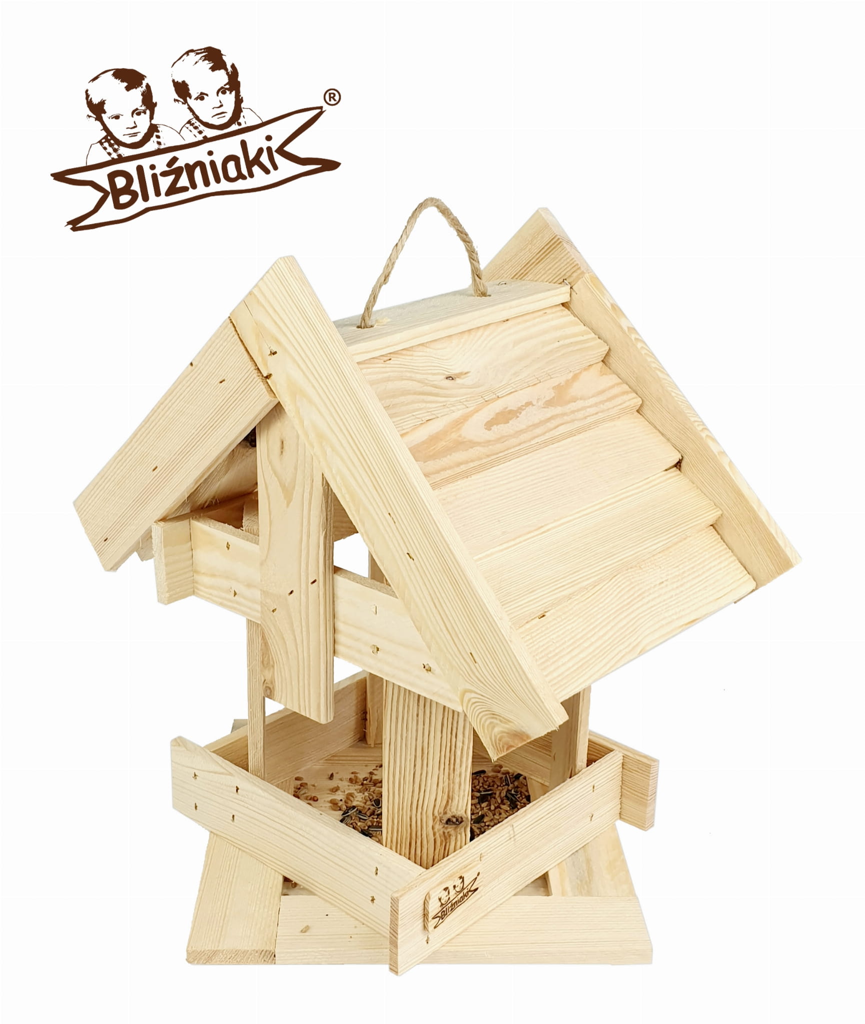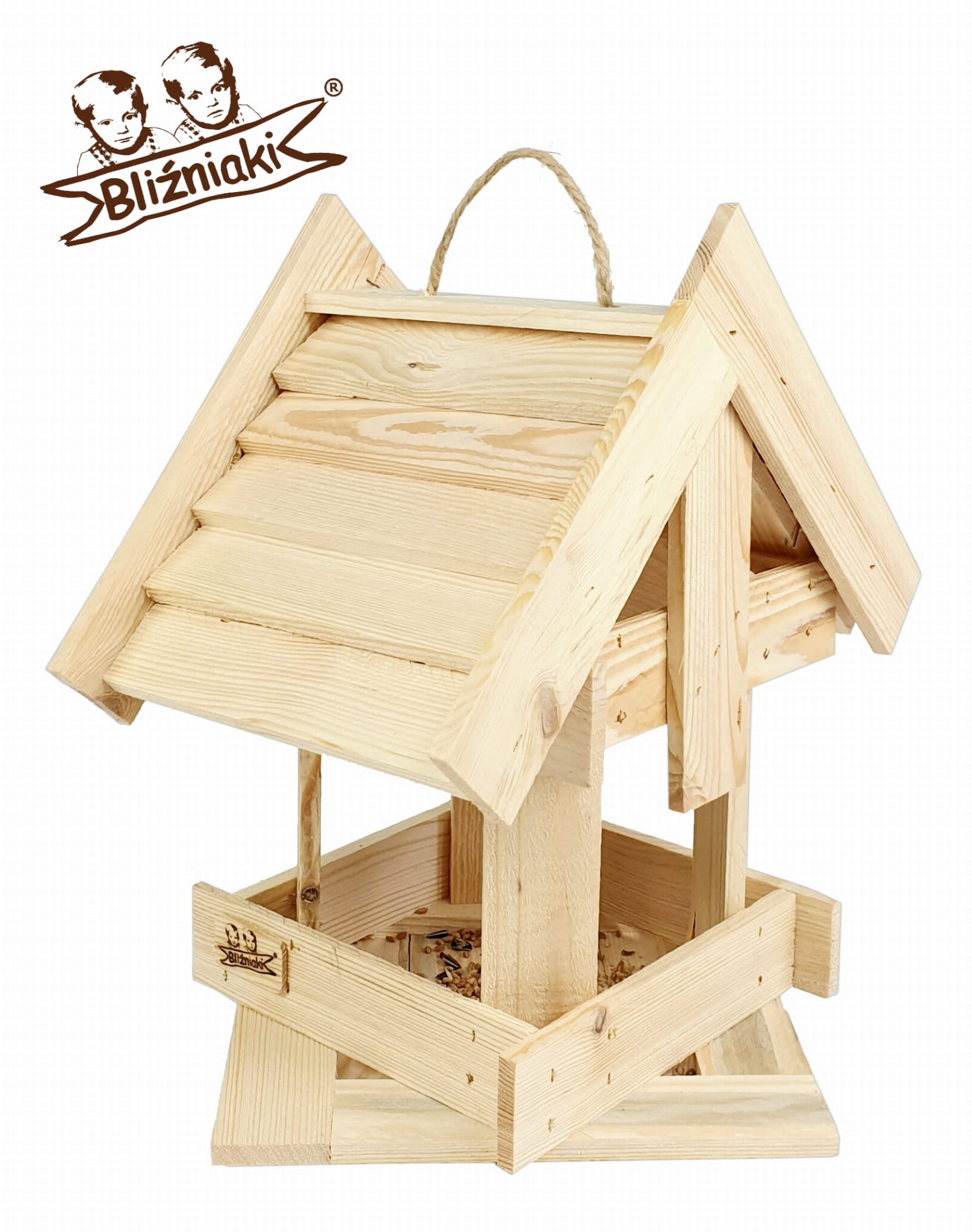 Wyposażony w szeroki dach, karmnik skutecznie chroni pożywienie przed deszczem i śniegiem. Dzięki temu zapewnia dłuższą świeżość dostarczanego pokarmu. Wykonany z wysokiej jakości drewna sosnowego, karmnik zachwyca estetyką oraz gwarantuje trwałość przez wiele sezonów zimowych. Posiada zawieszkę na dachu ułatwiającą montaż budki na drzewie lub krzewach.