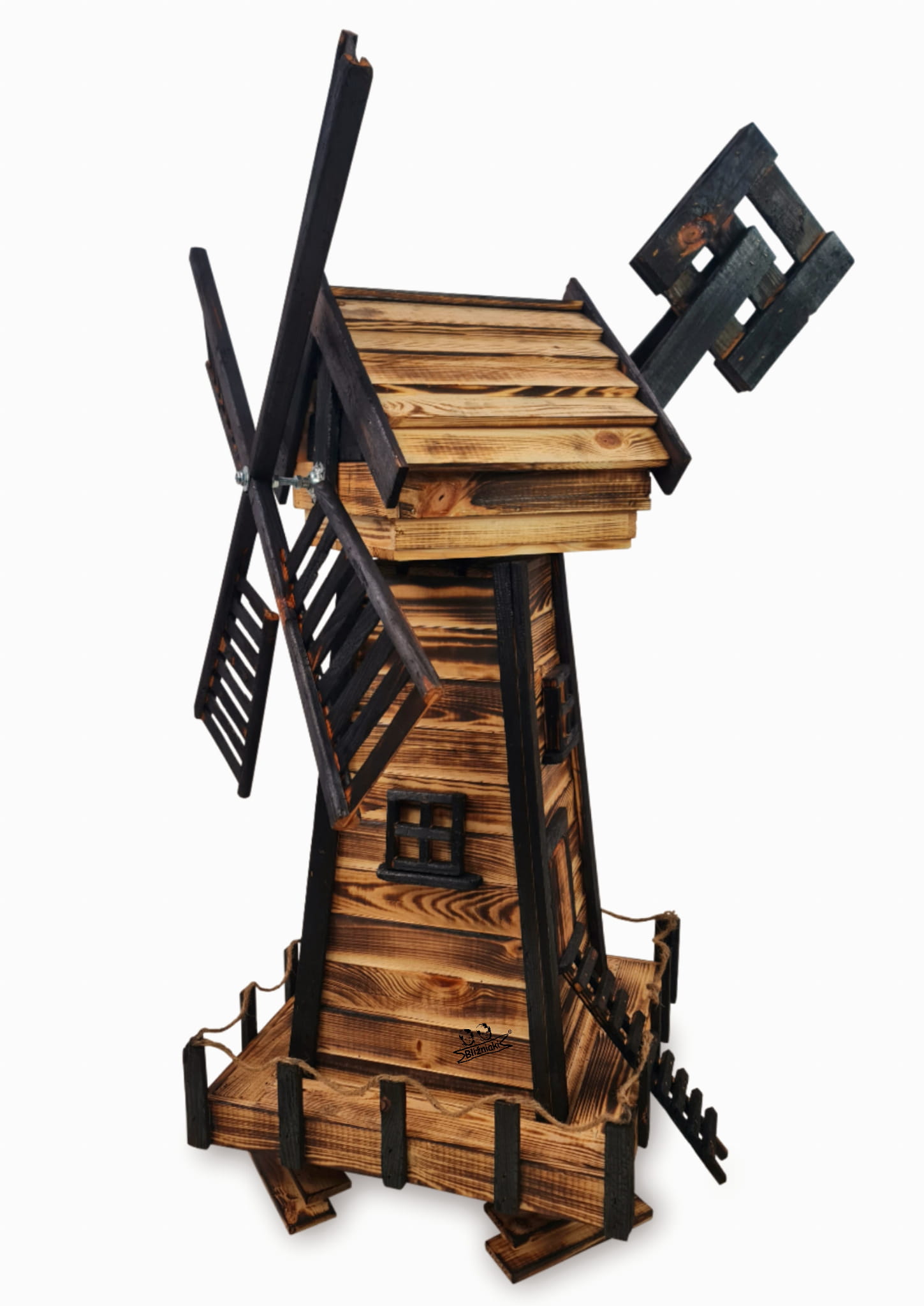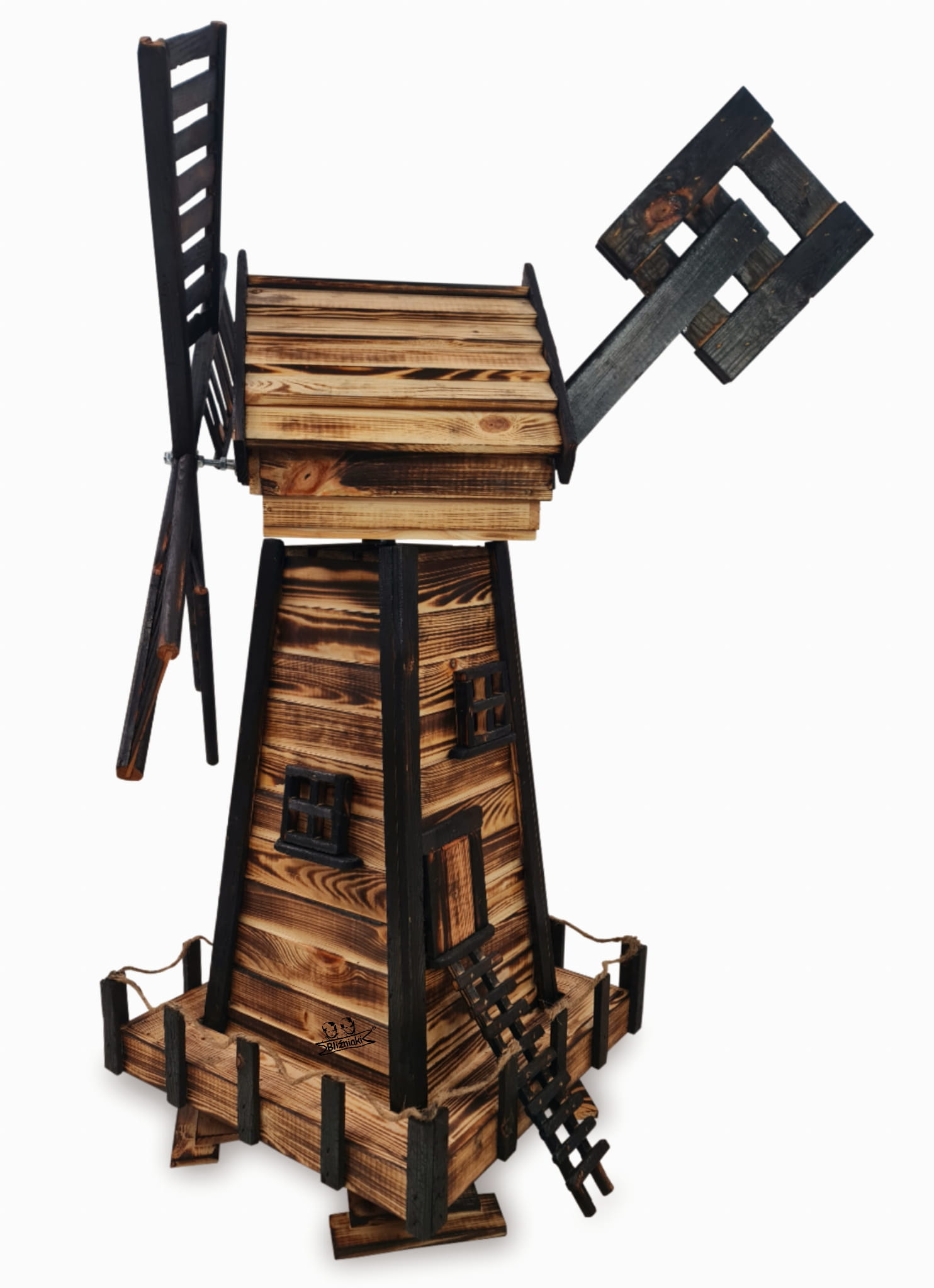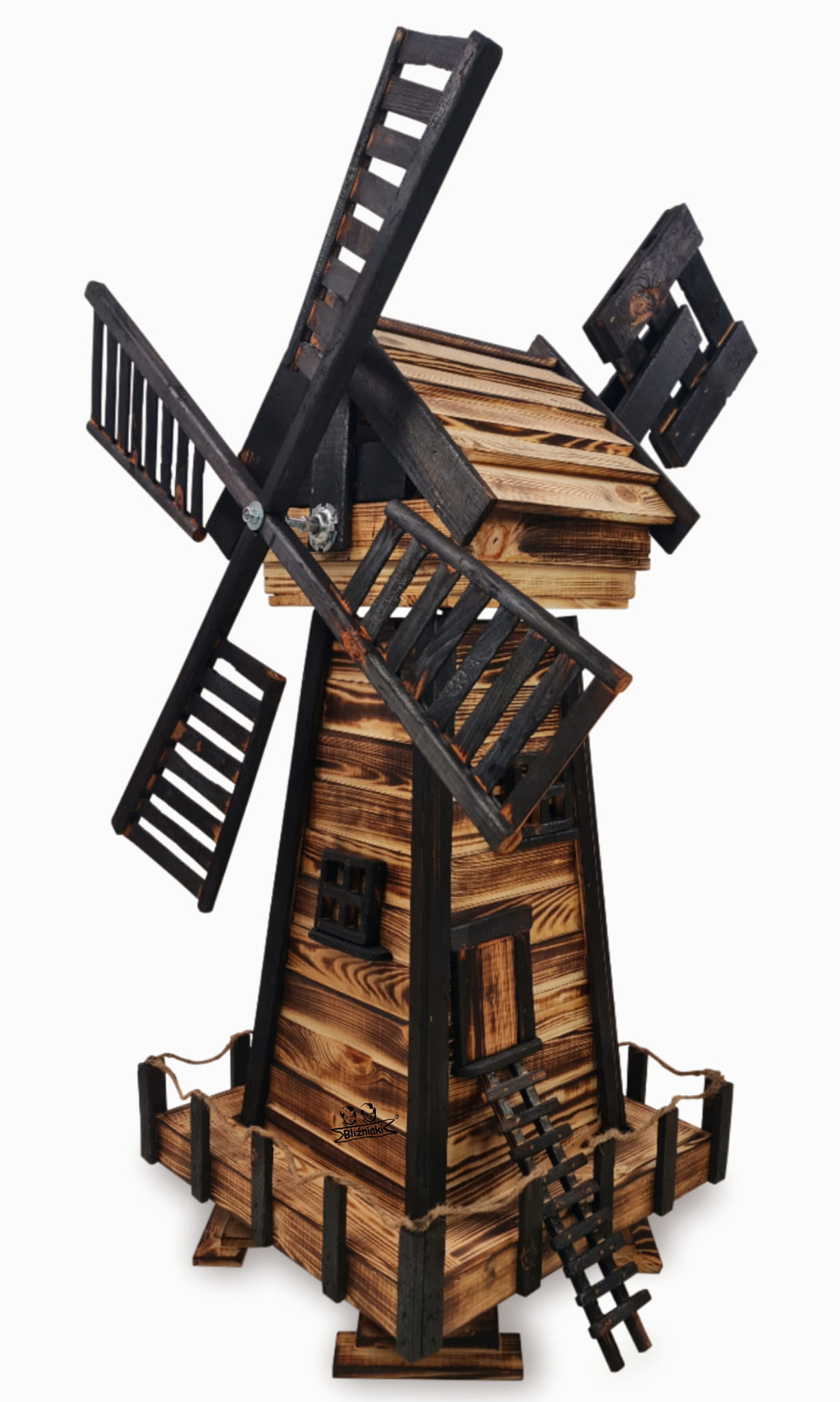 Produkt został wykonany z wysokiej jakości drewna opalanego ogniem metodą ShouSugiBan. Zabezpieczone w taki sposób drewno sprawia, że wiatrak jest odporny na szkodliwe działanie wody oraz wilgoci, promieni UV, a także grzybów i pleśni, może być więc przechowywany przez cały rok na zewnątrz.