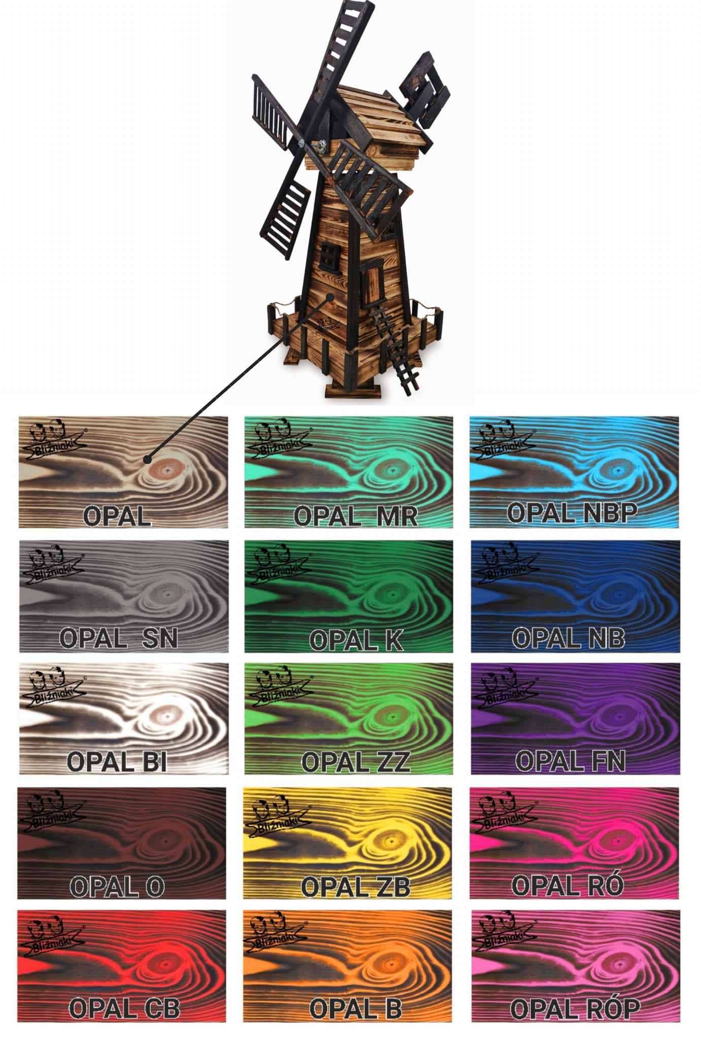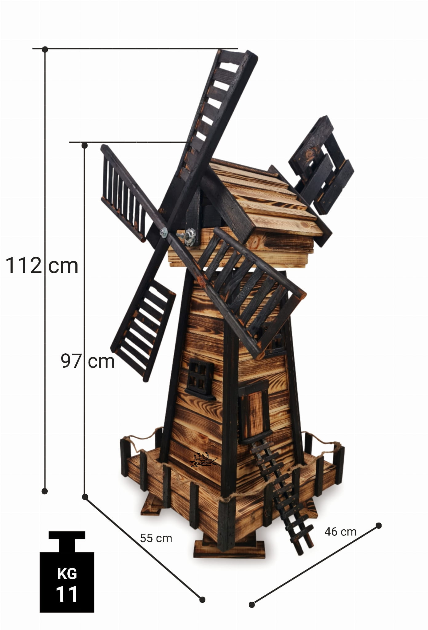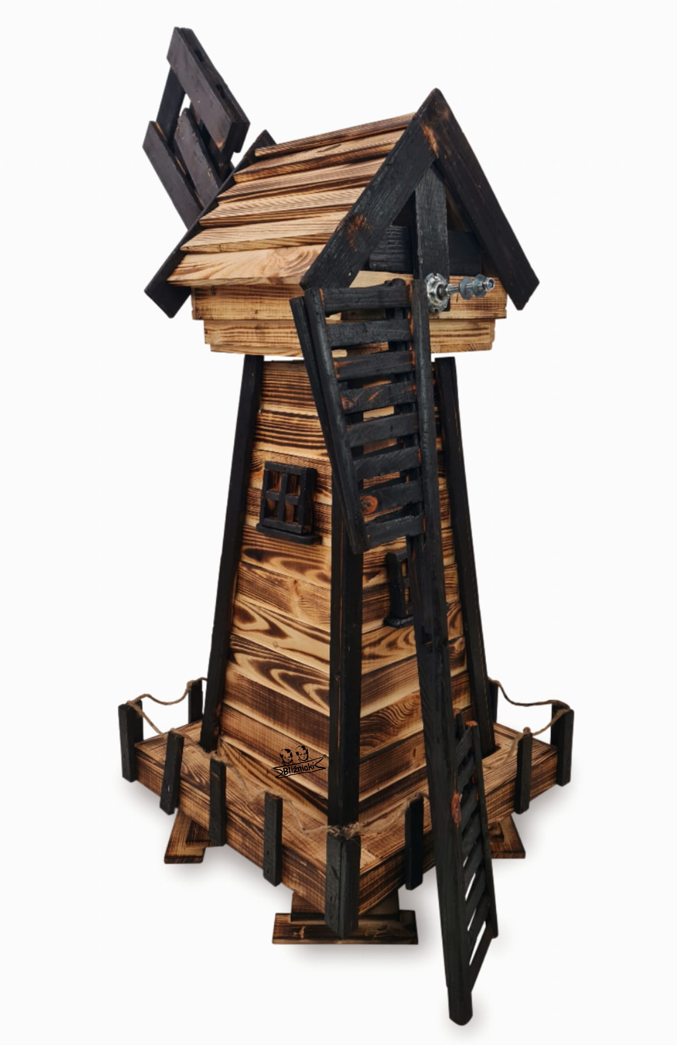 Produkt został wykonany z wysokiej jakości drewna opalanego ogniem metodą ShouSugiBan. Zabezpieczone w taki sposób drewno sprawia, że wiatrak jest odporny na szkodliwe działanie wody oraz wilgoci, promieni UV, a także grzybów i pleśni, może być więc przechowywany przez cały rok na zewnątrz.
