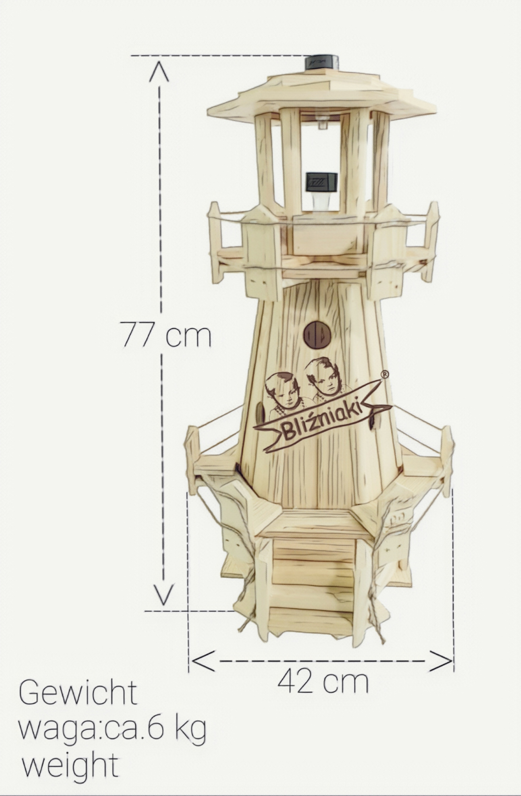 Nasz produkt zabezpieczony jest metodą impregnowania. Środek na bazie wody użyty do impregnacji jest w pełni ekologiczny i bezpieczny dla ludzi i zwierząt. Zabezpieczone w taki sposób drewno sprawia, że latarnia morska jest odporna na szkodliwe działanie wody oraz wilgoci, promieni UV, a także grzybów i pleśni, może być więc przechowywana przez cały rok na zewnątrz.