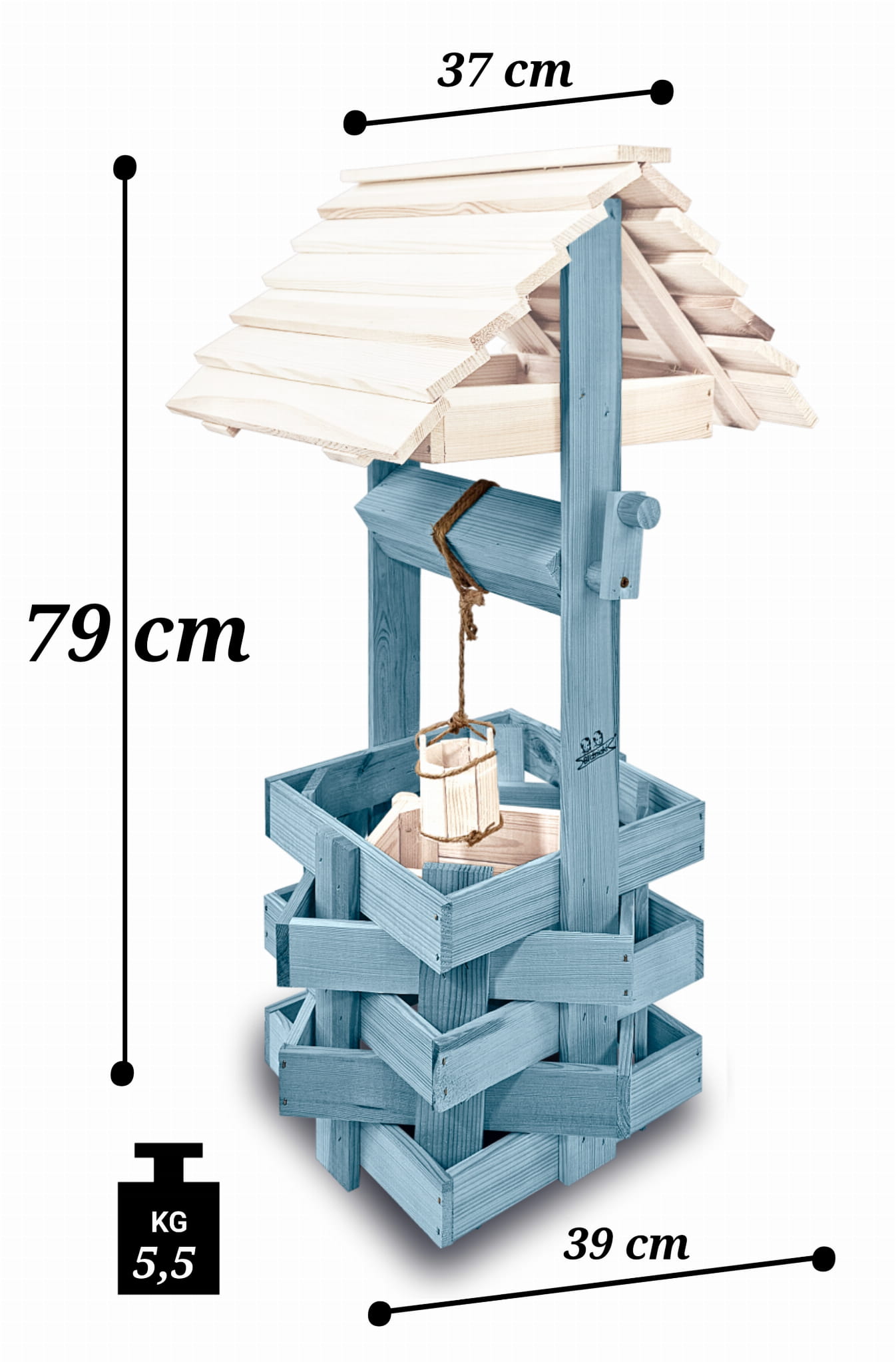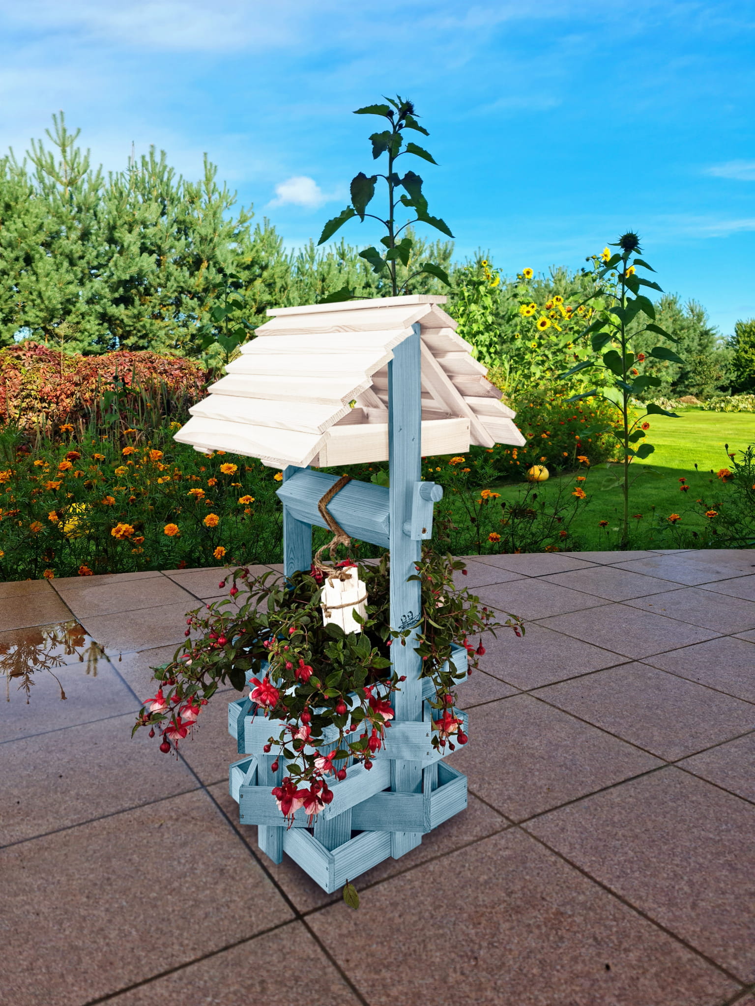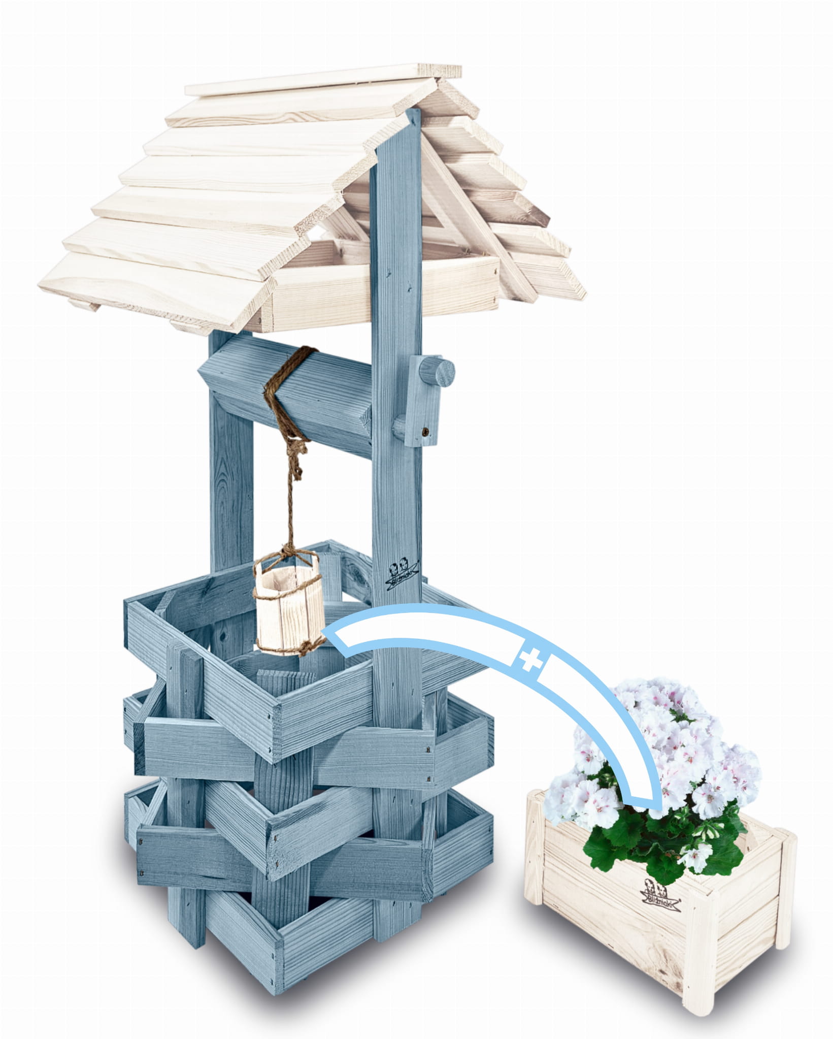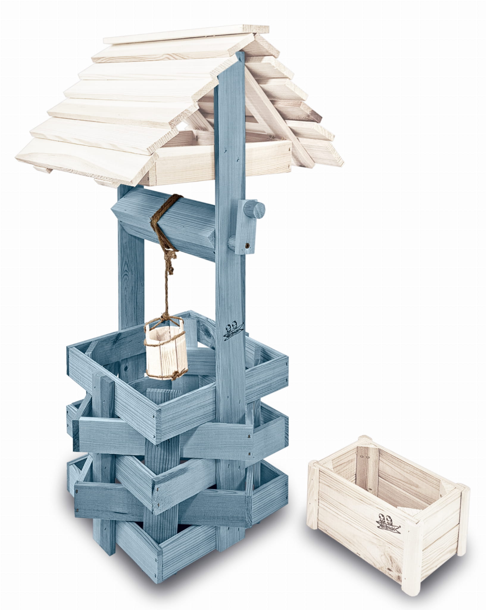 Do studni dołączona jest drewniana doniczka na kwiaty, utrzymana w tej samej estetyce, tworząc spójną i harmonijną całość.