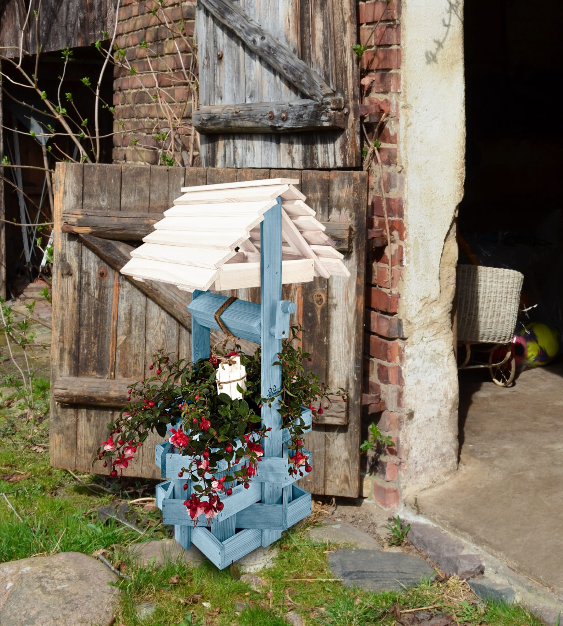 Nasza stylowa studnia wraz z donicą stanowi idealną bazę do stworzenia wyjątkowych kompozycji kwiatowych.