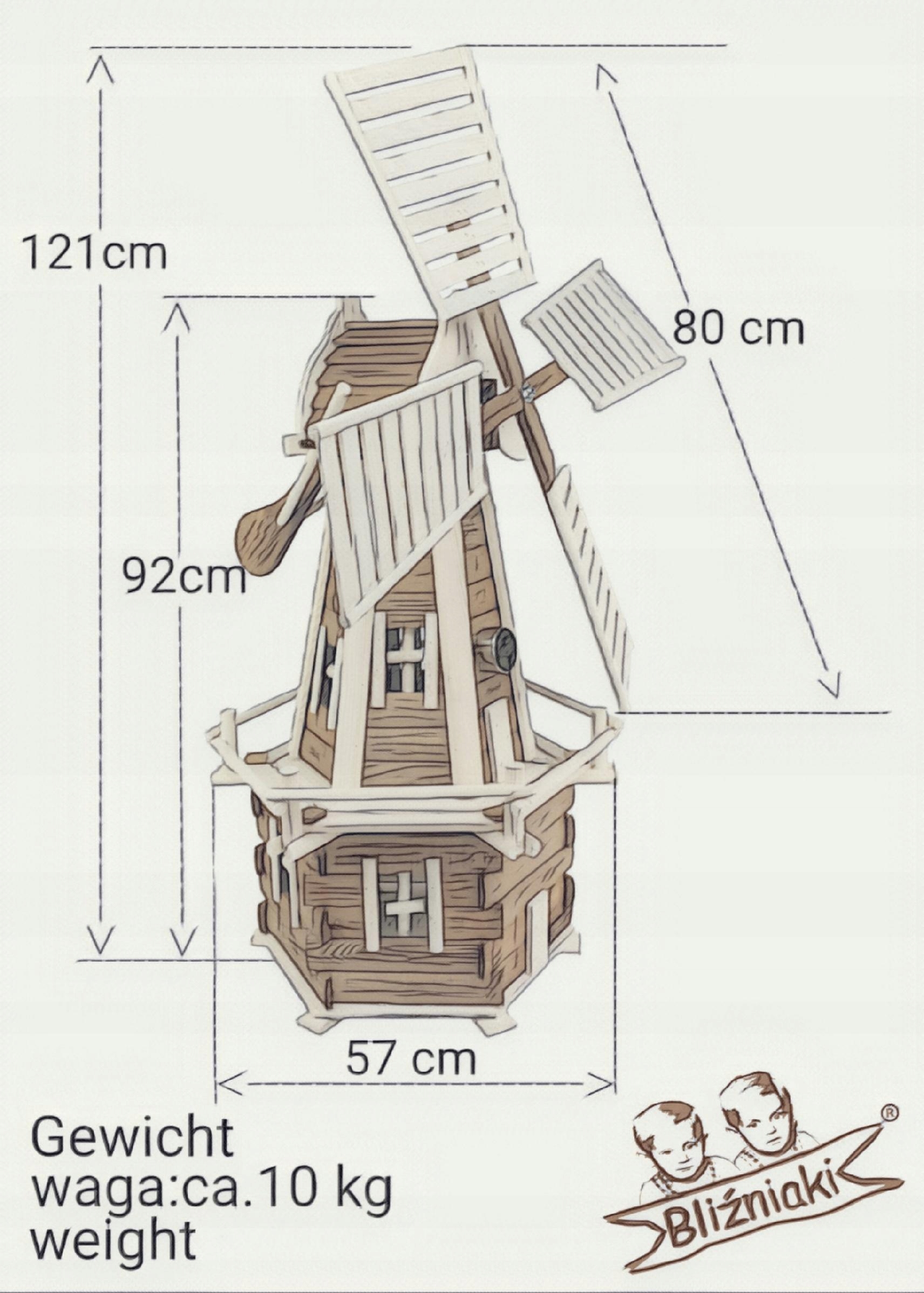 Produkt został wykonany z wysokiej jakości suszonego drewna i zabezpieczony metodą impregnowania. Środek na bazie wody użyty do impregnacji jest w pełni ekologiczny i bezpieczny dla ludzi i zwierząt. Zabezpieczone w taki sposób drewno sprawia, że wiatrak jest odporny na szkodliwe działanie wody oraz wilgoci, promieni UV, a także grzybów i pleśni, może być więc przechowywany przez cały rok na zewnątrz.