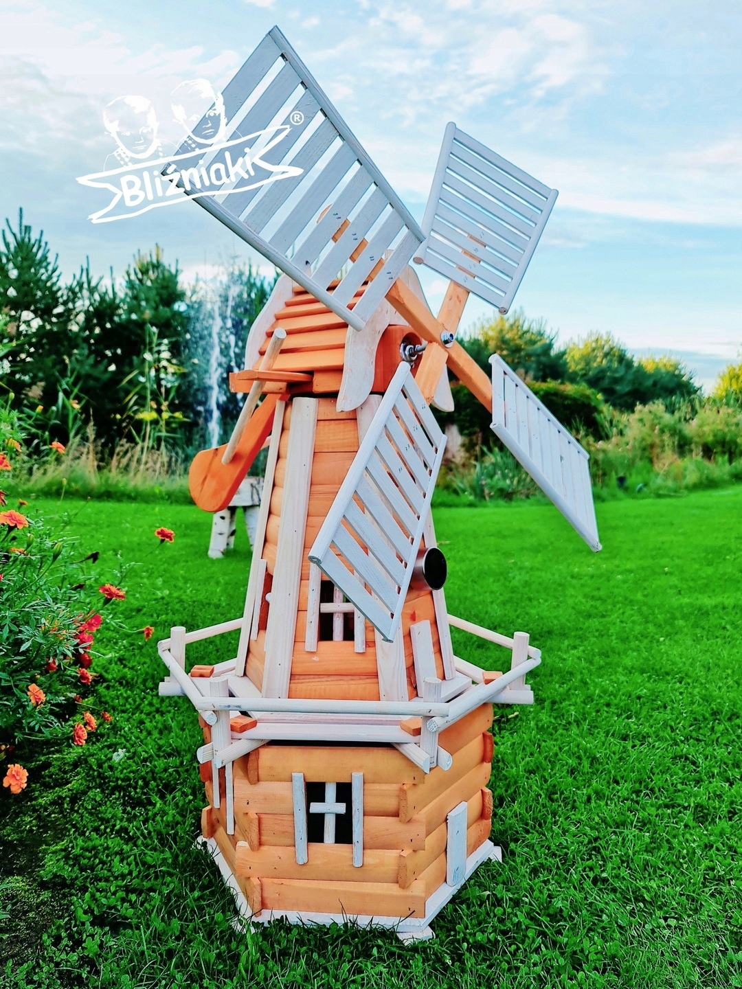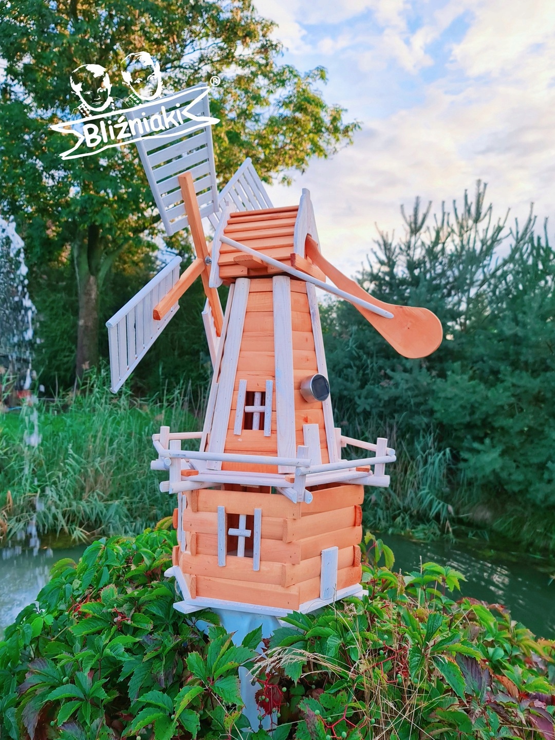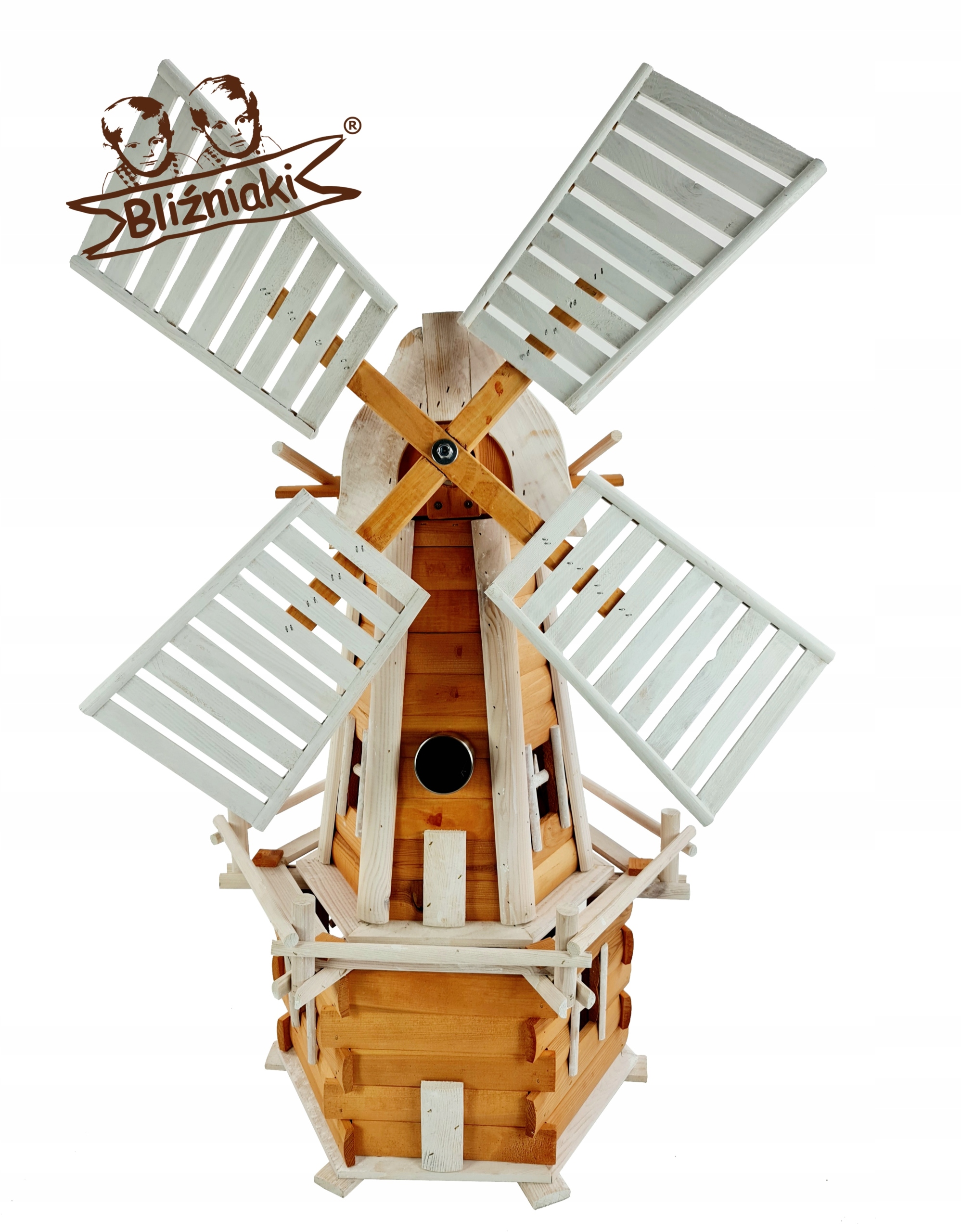 Drewniany wiatrak ogrodowy - młyn wietrzny typu holenderskiego - to wiatrak posiadający nieruchomą bryłę. Śmigła obracają się z niesamowitą lekkością, zaś ustawienie się bryły względem wiatru jest możliwe dzięki łopatkom umieszczonym na łożysku w tylnej części wiatraka.