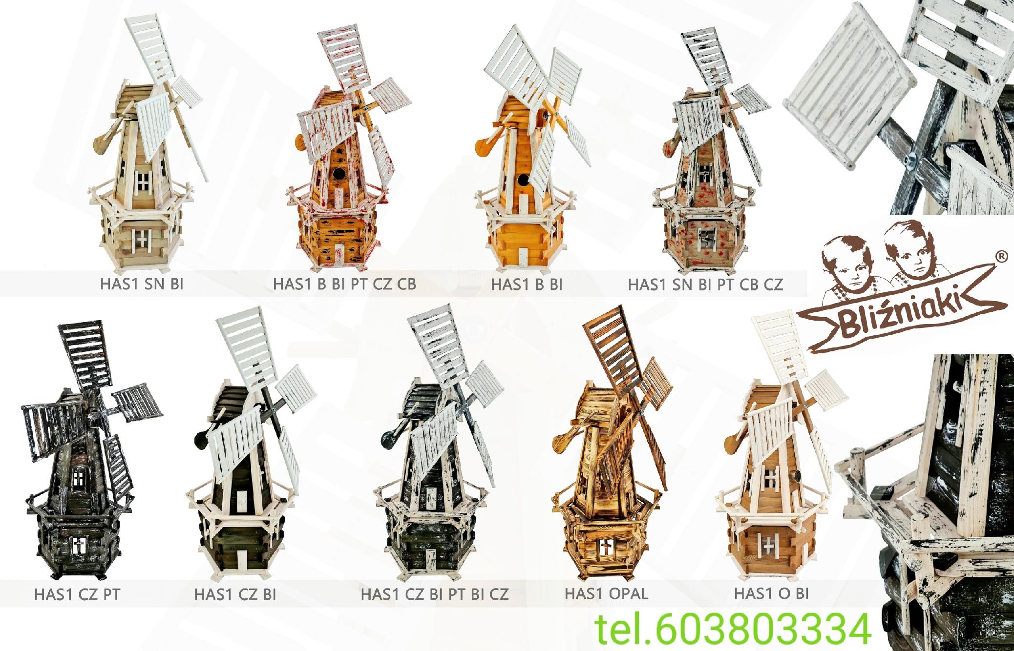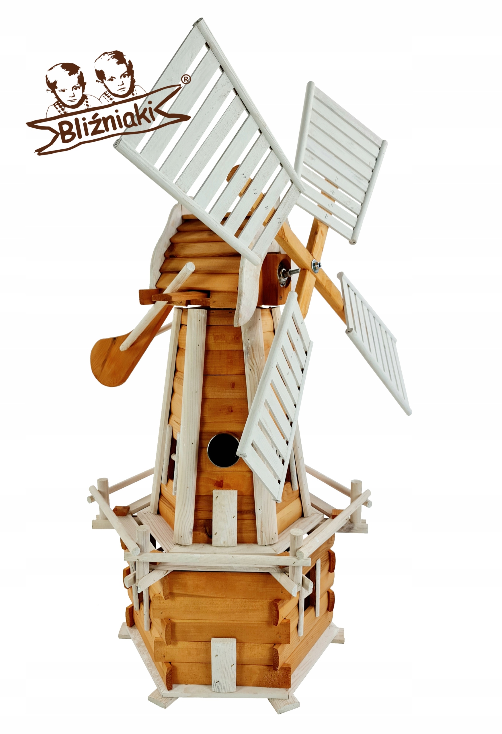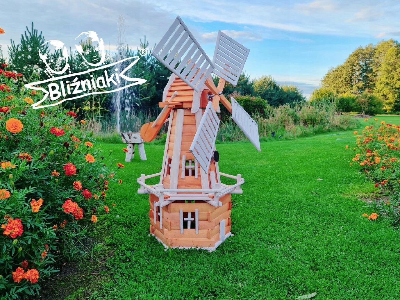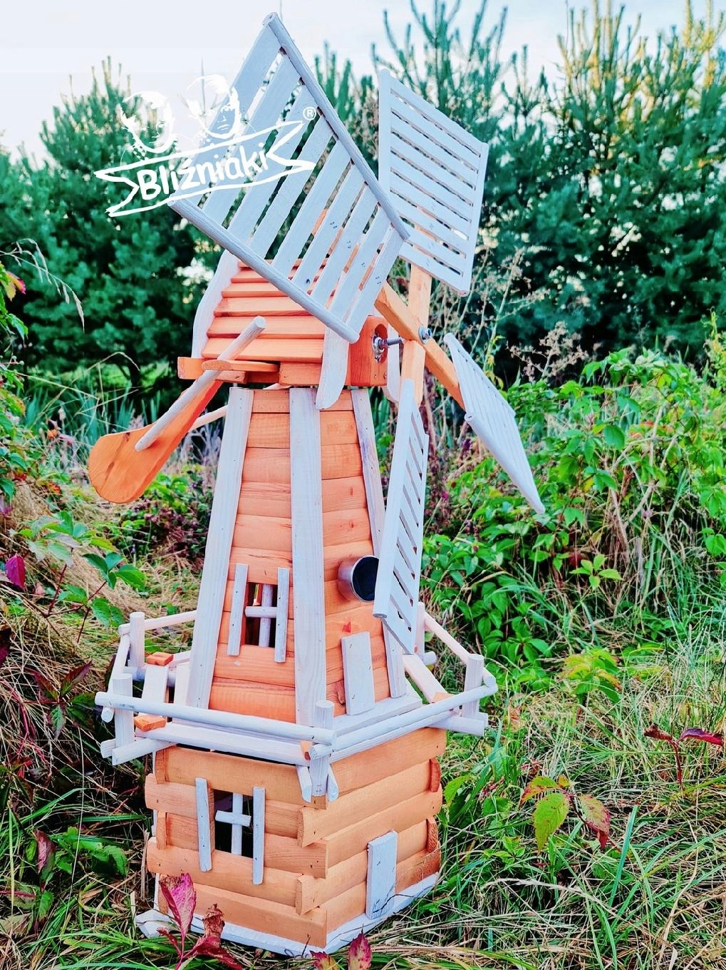 Drewniany wiatrak ogrodowy - młyn wietrzny typu holenderskiego - to wiatrak posiadający nieruchomą bryłę. Śmigła obracają się z niesamowitą lekkością, zaś ustawienie się bryły względem wiatru jest możliwe dzięki łopatkom umieszczonym na łożysku w tylnej części wiatraka.