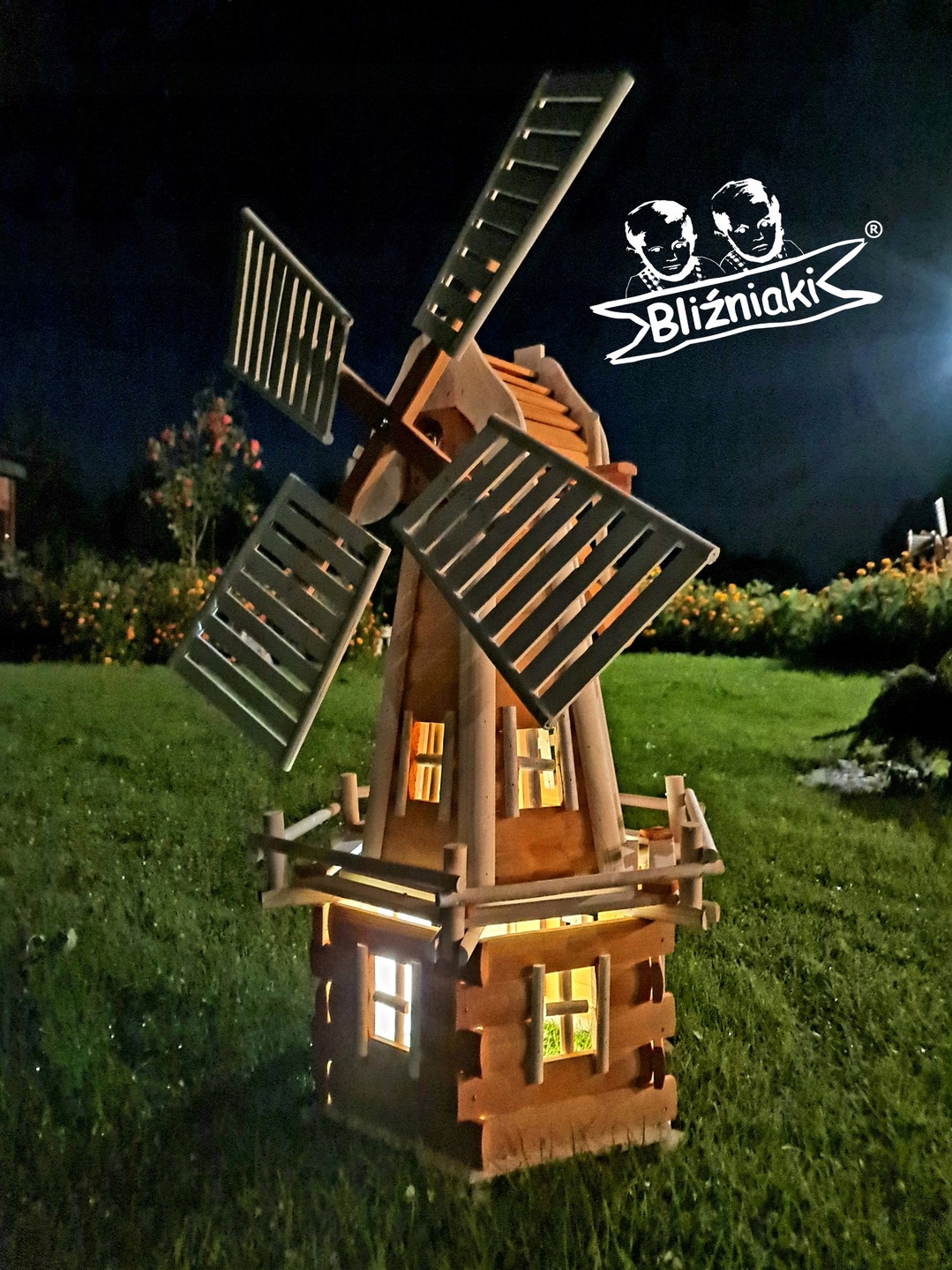 Dodatkowo, młyn wietrzny posiada lampę solarną, która świeci w nocy, tworząc magiczną atmosferę.