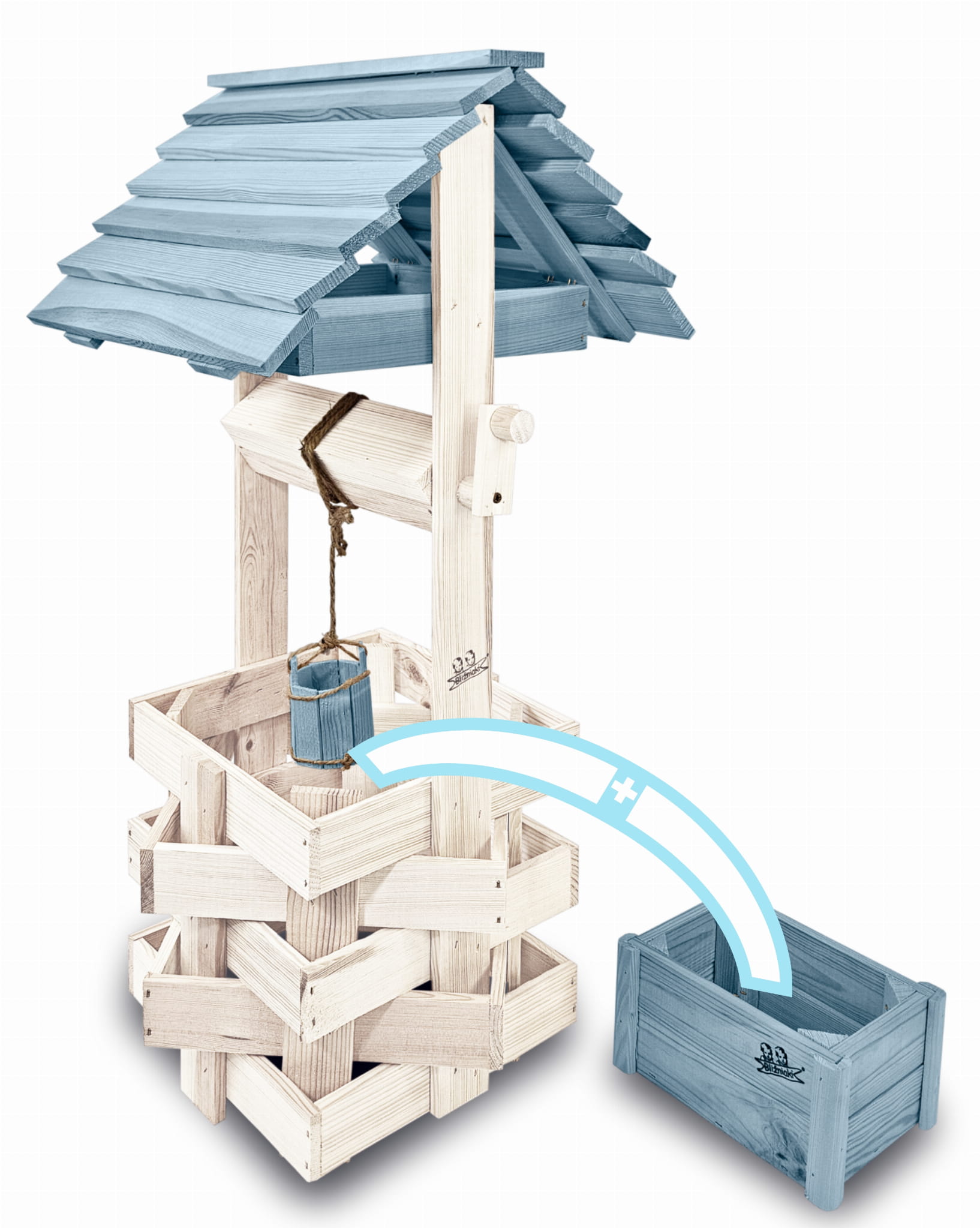 Do studni dołączona jest drewniana doniczka na kwiaty, utrzymana w tej samej estetyce, tworząc spójną i harmonijną całość.