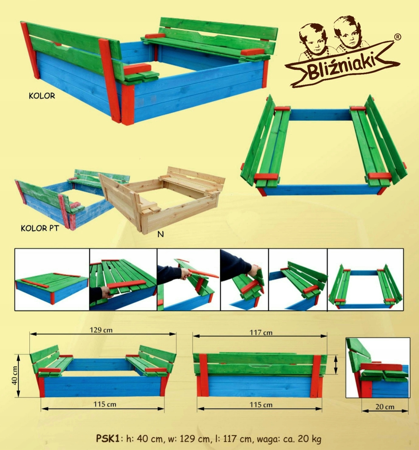 Dla łatwiejszego otwierania piaskownicy kilkucentymetrowe przerwy na dłoń po obu stronach ławko-pokryw.