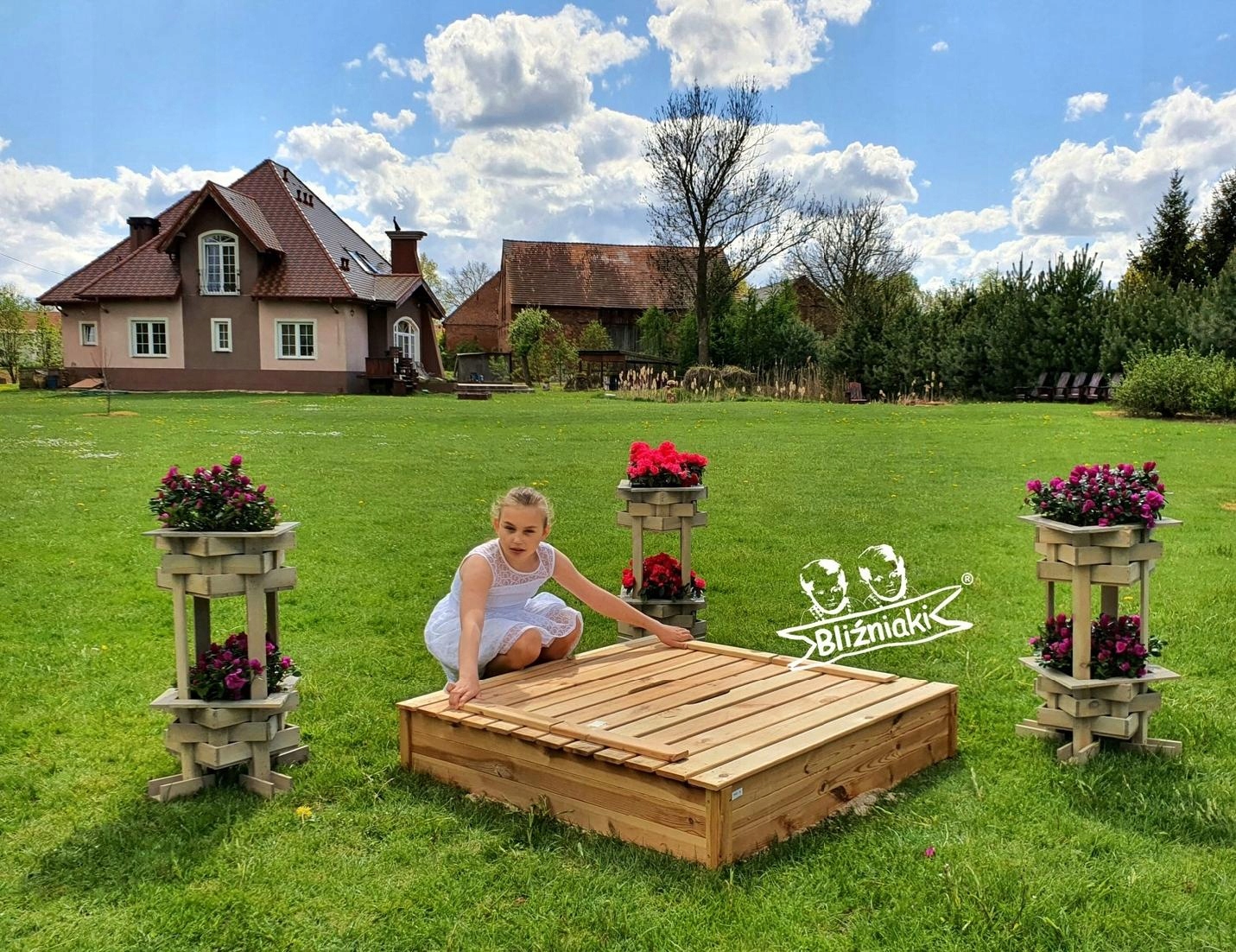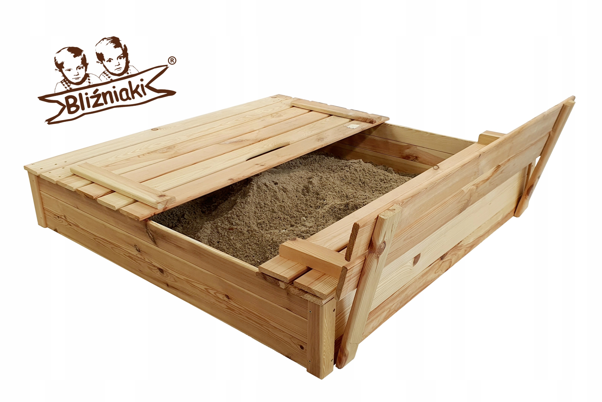 Piaskownica jest wyposażona w praktyczne zamknięcie, chroniące przed np. zwierzętami, które po otwarciu służą jako ławeczki.