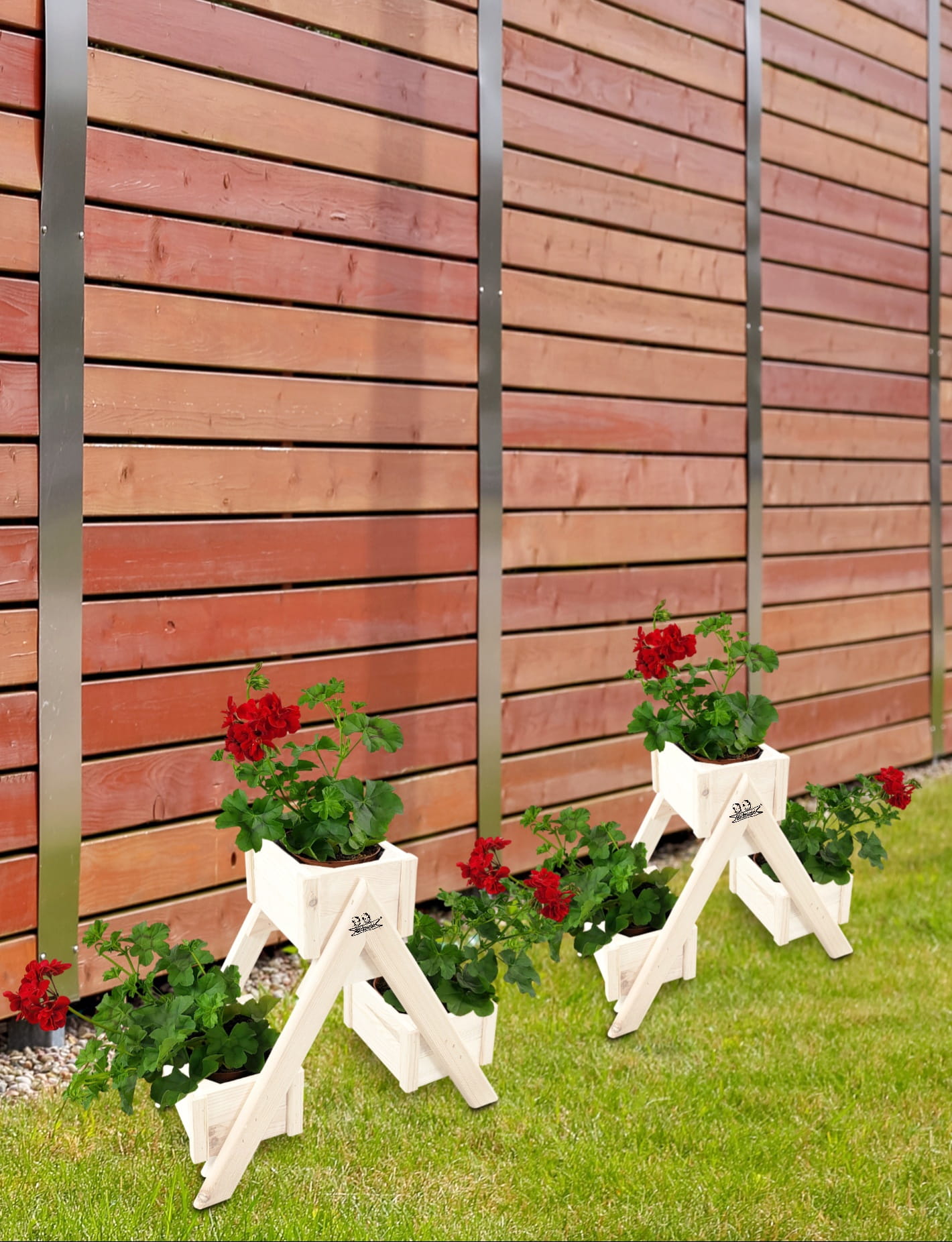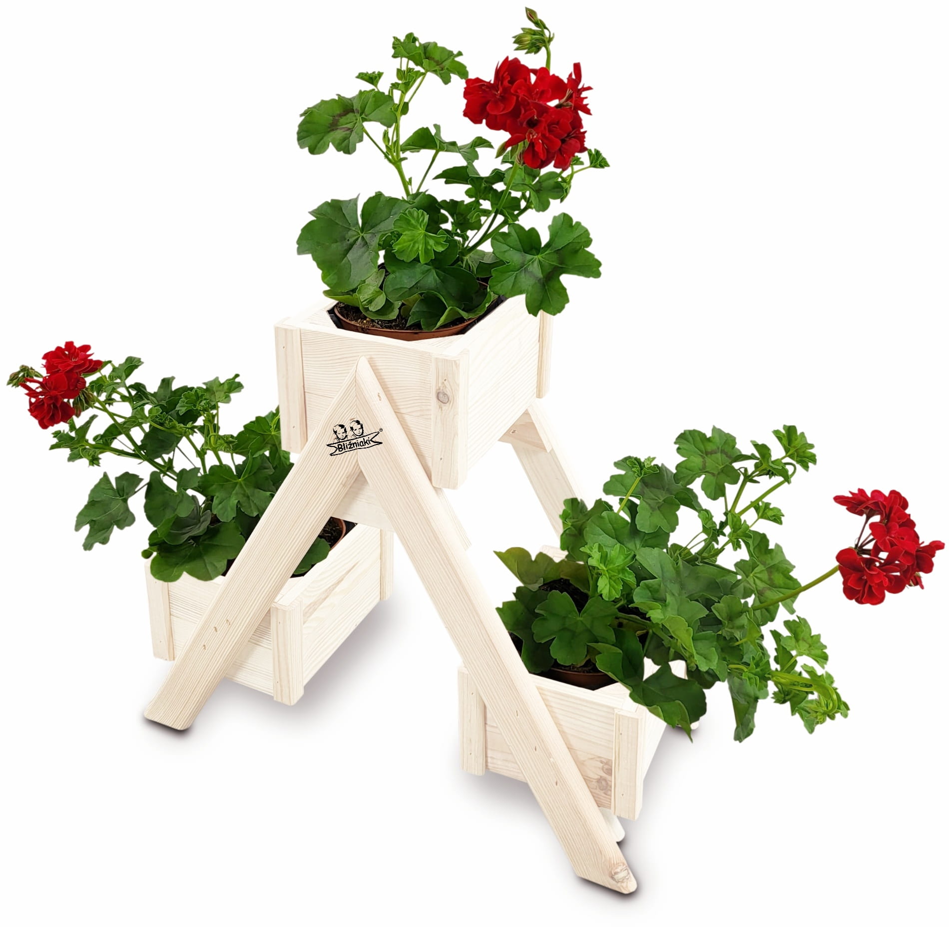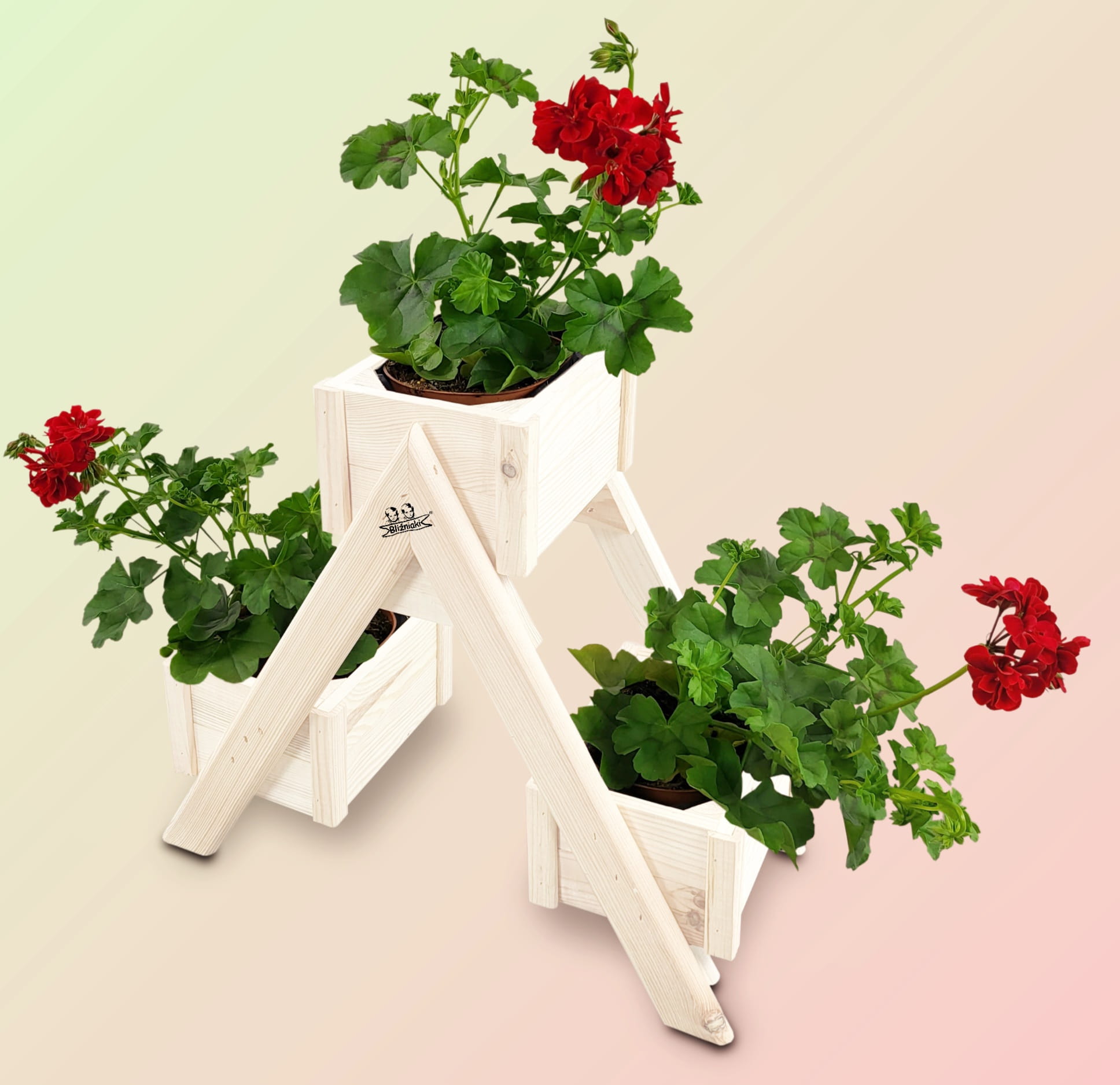 Zestaw pięciu dekoracyjnych, drewnianych stojaków - kwietników składających się z trzech doniczek - skrzynek wzbogaconych o folię