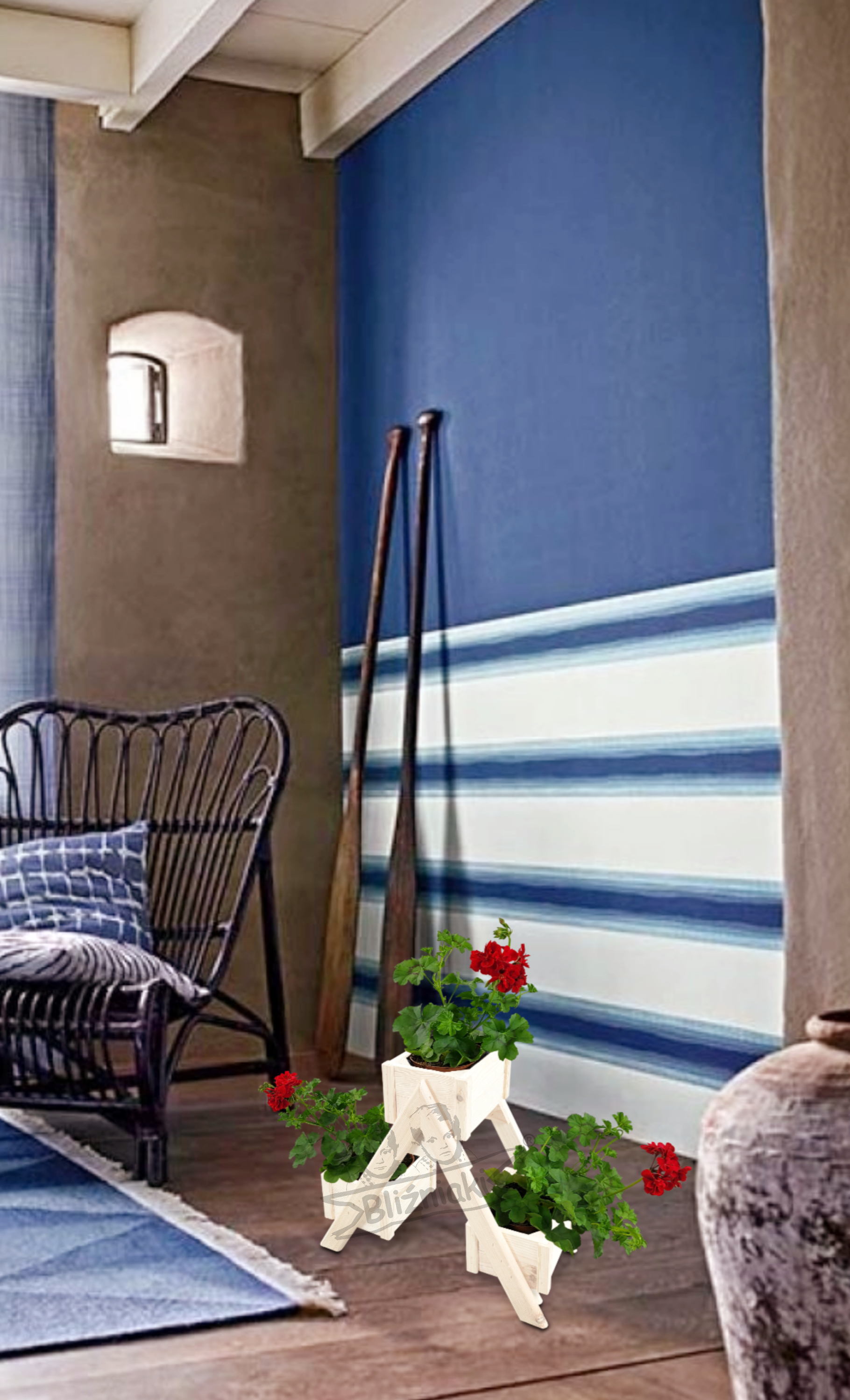 Stylowy stojak - kwietnik z trzema doniczkami - skrzynkami świetnie sprawdzi się w domu i ogrodzie na kwiaty lub zioła.