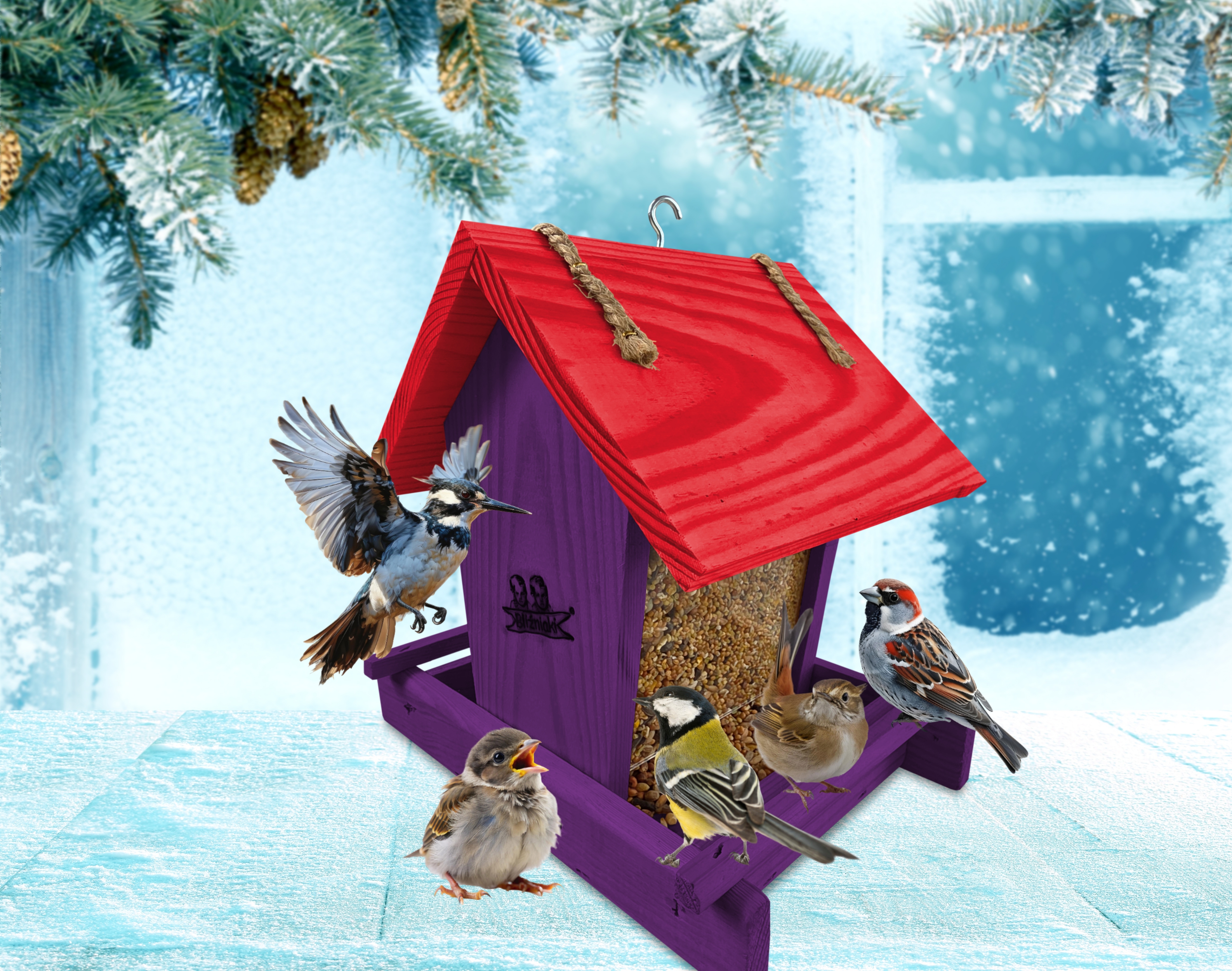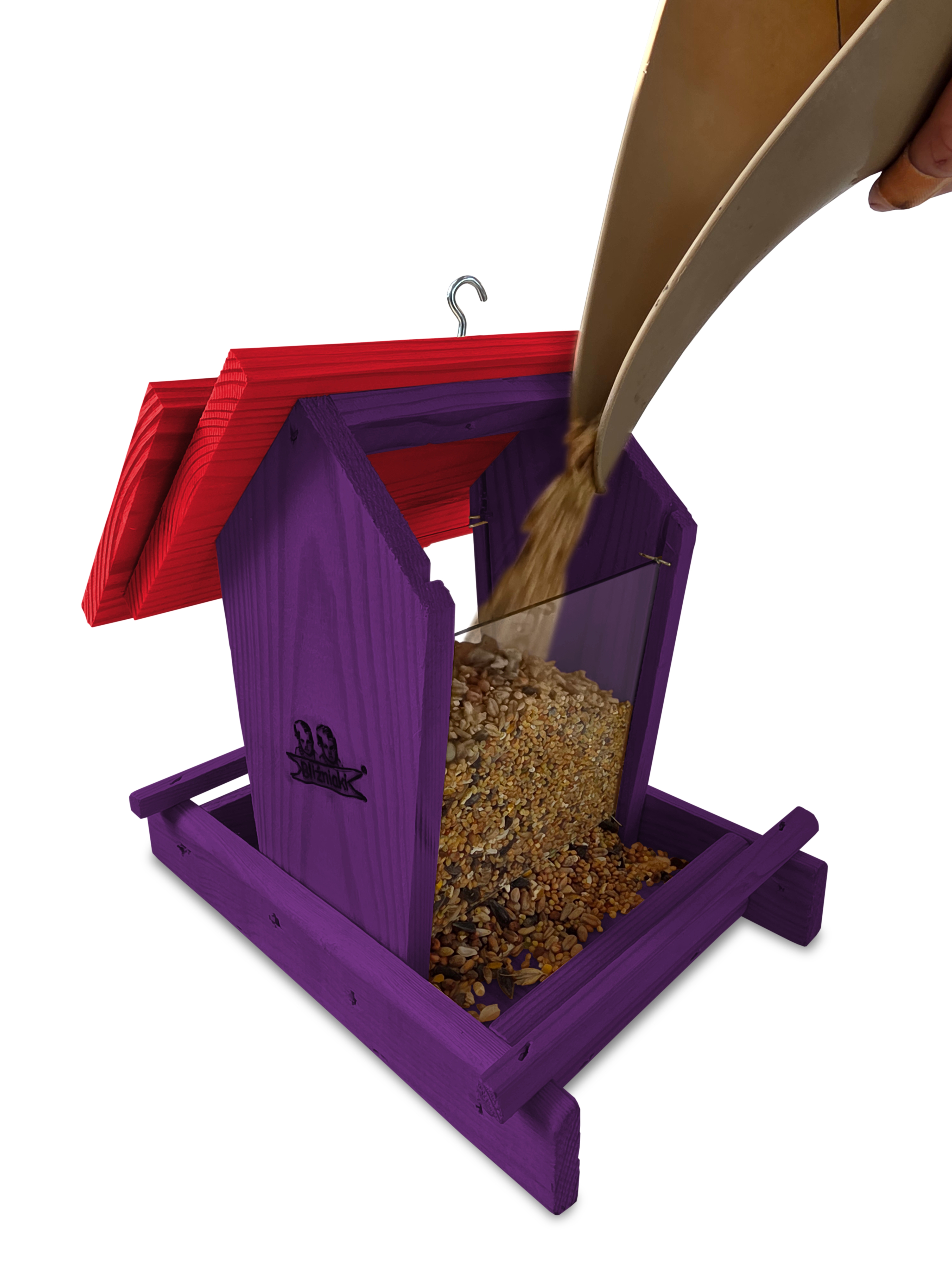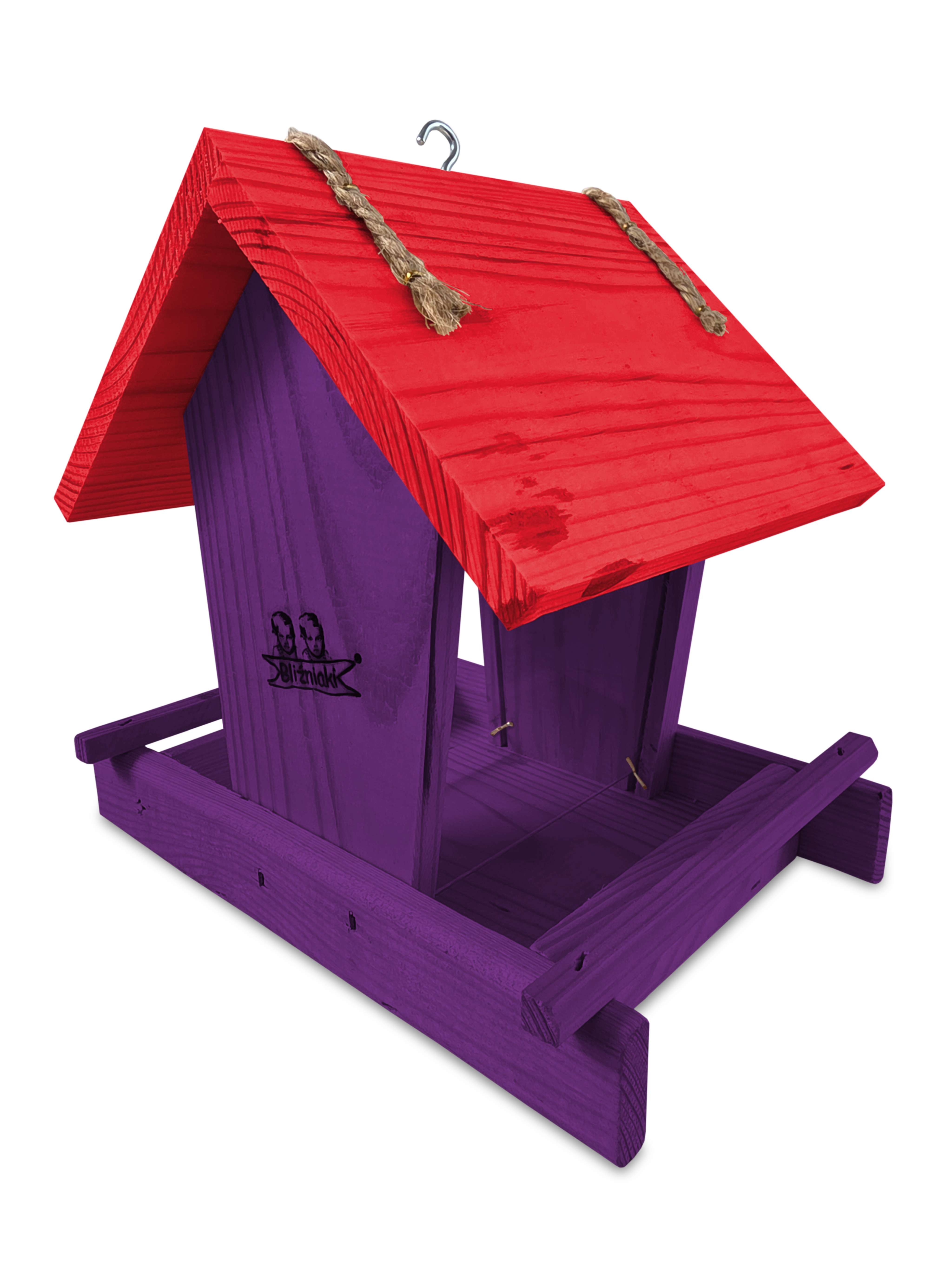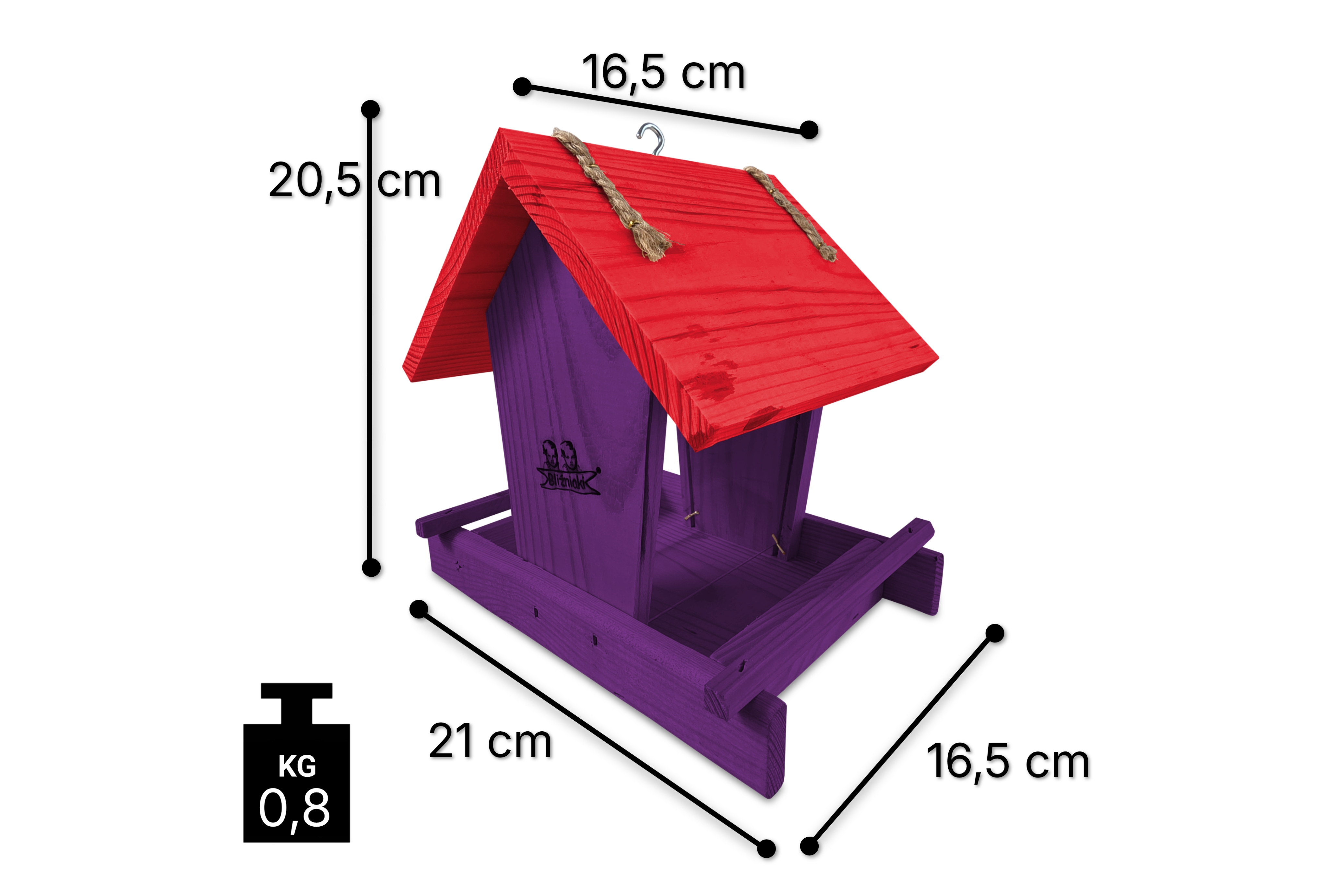 - Karmnik wykonany jest w całości z drewna iglastego, KOLOR CIEMNY FIOLET Z CZERWONYM DACHEM