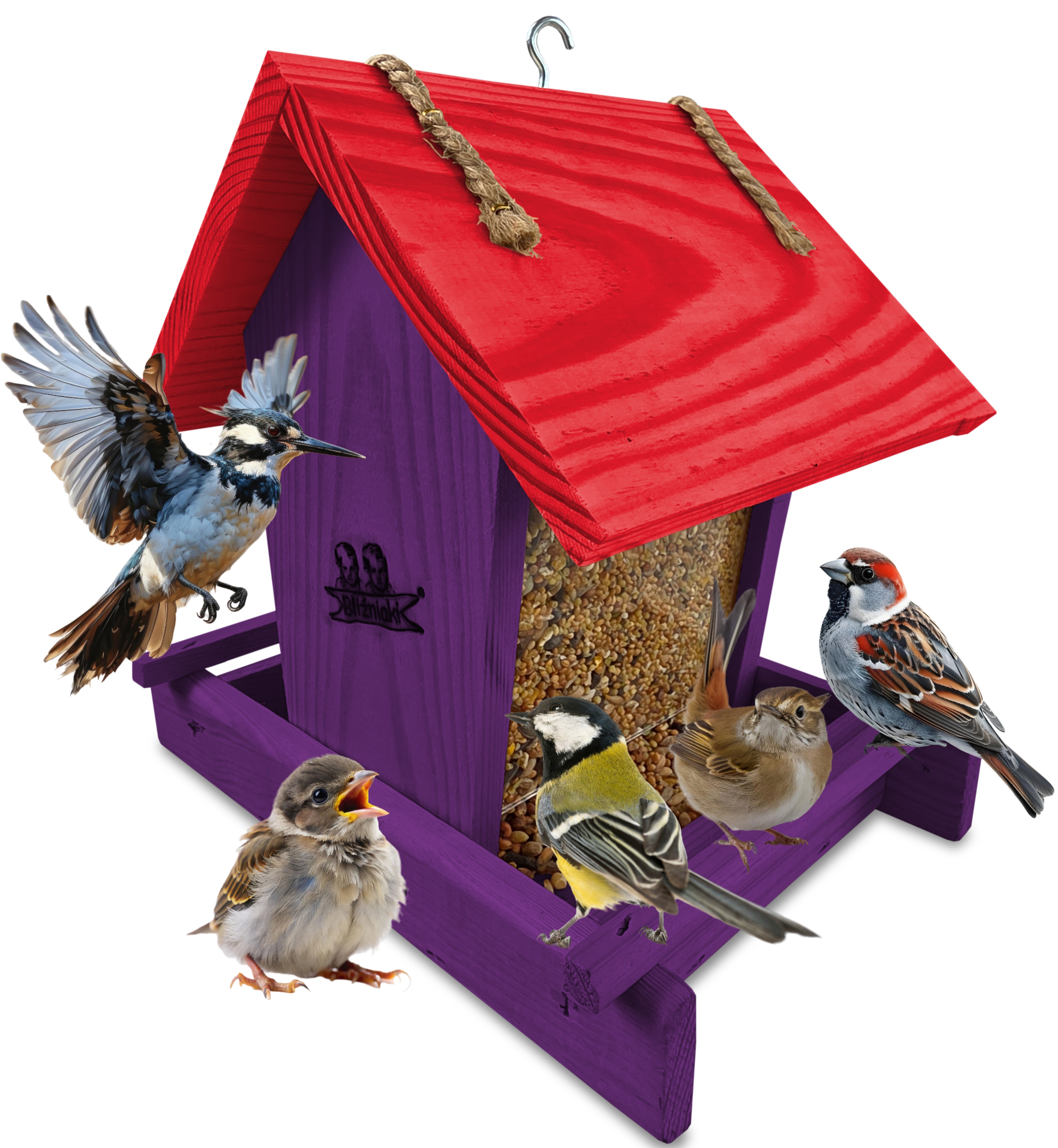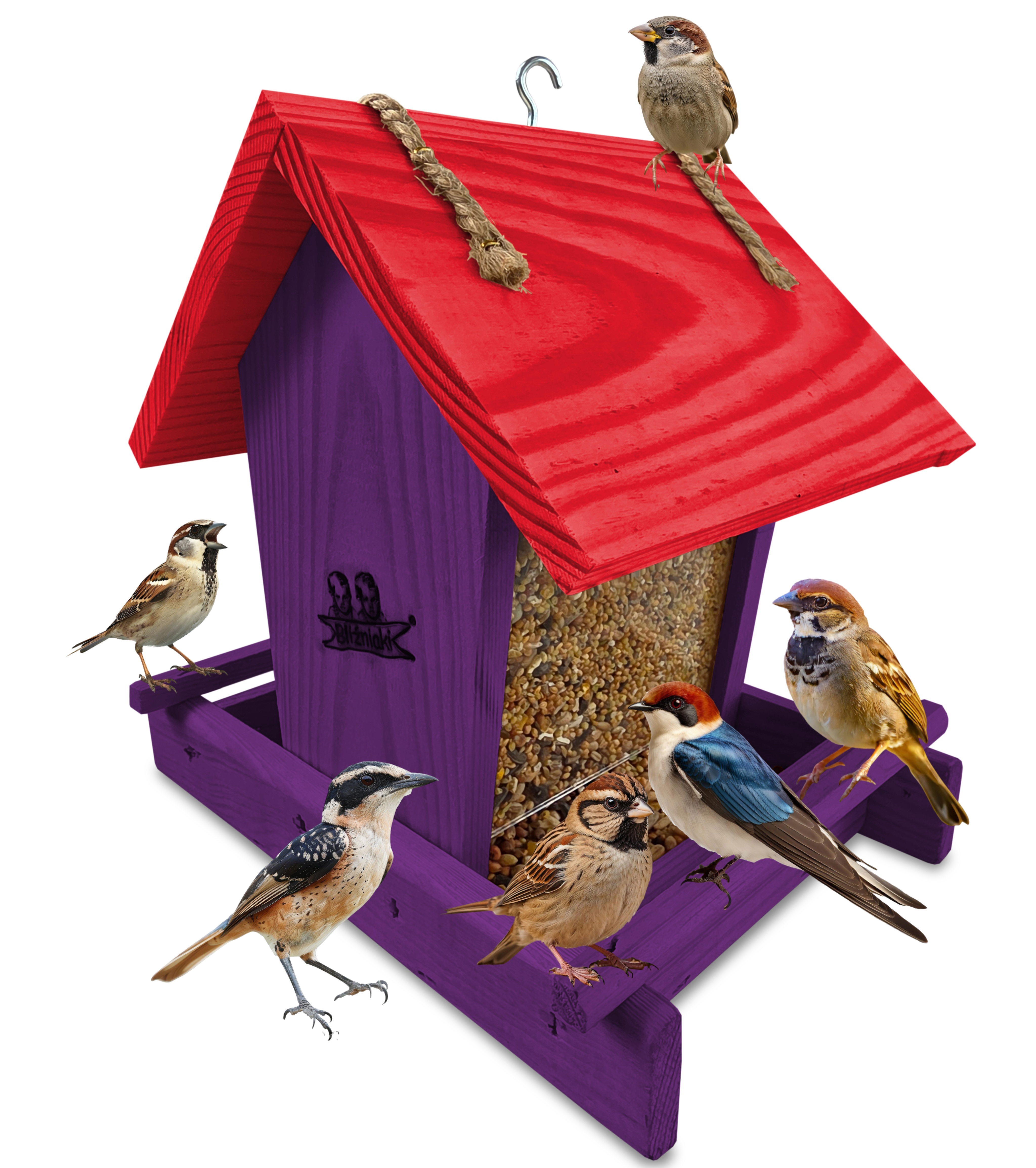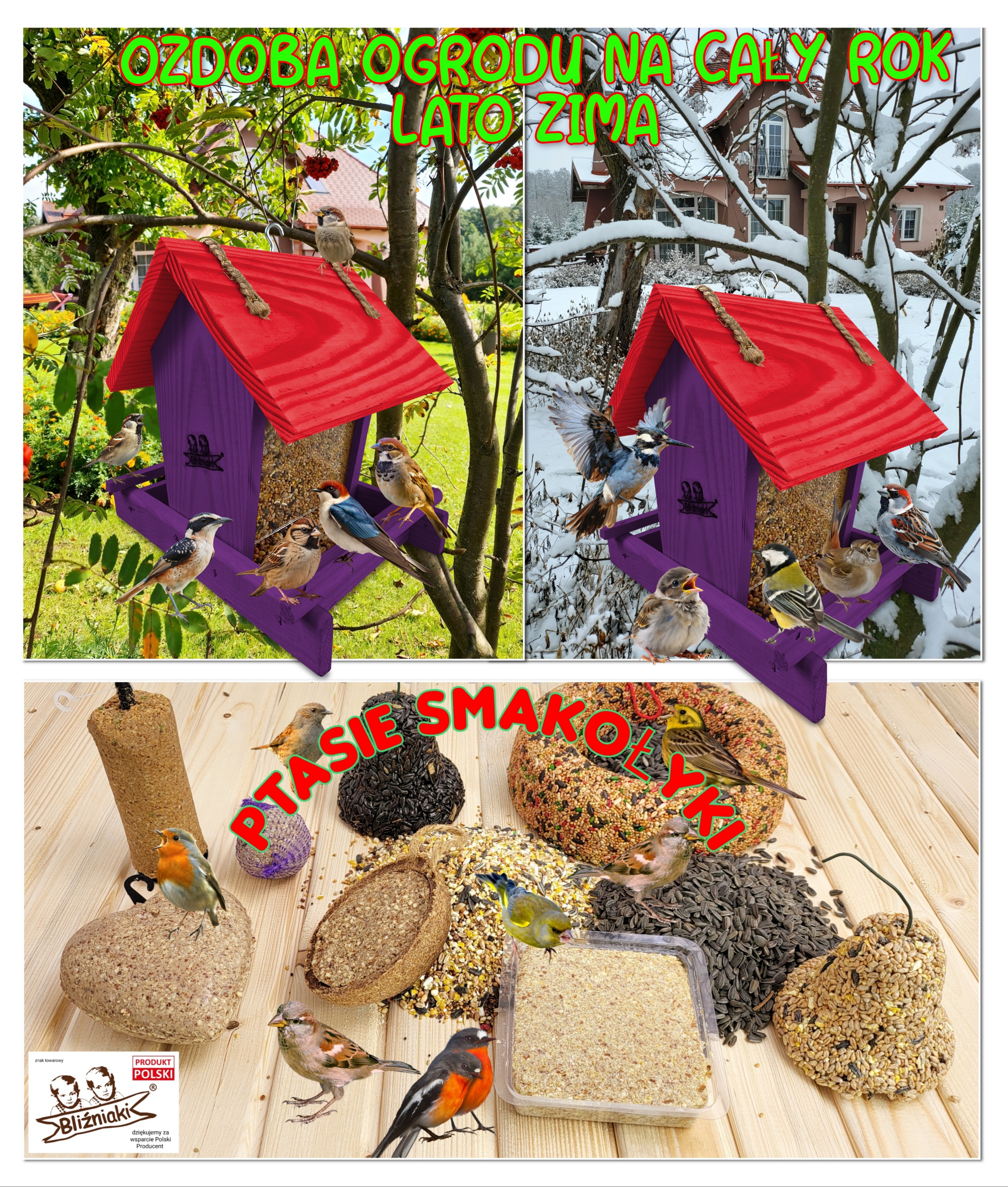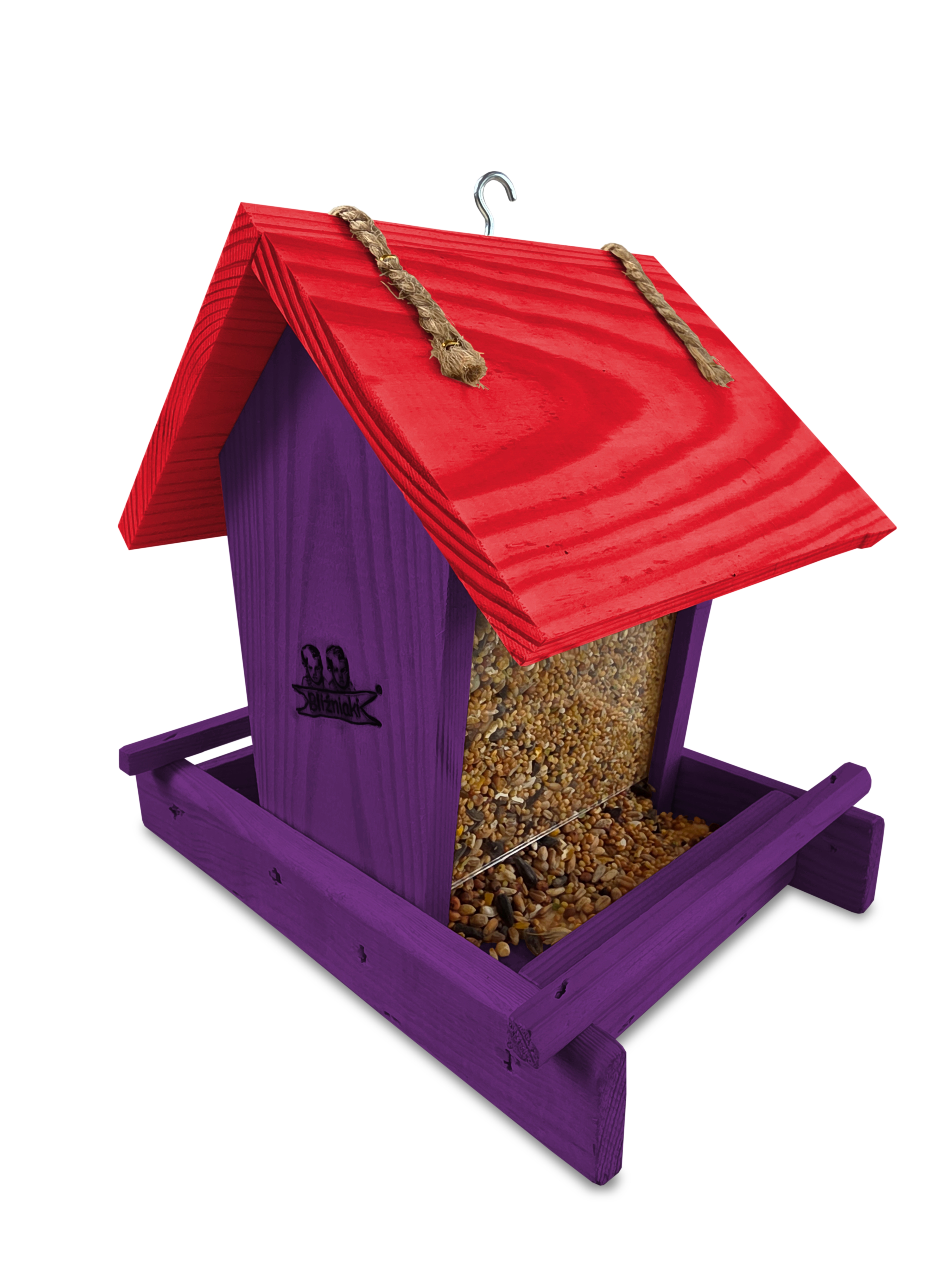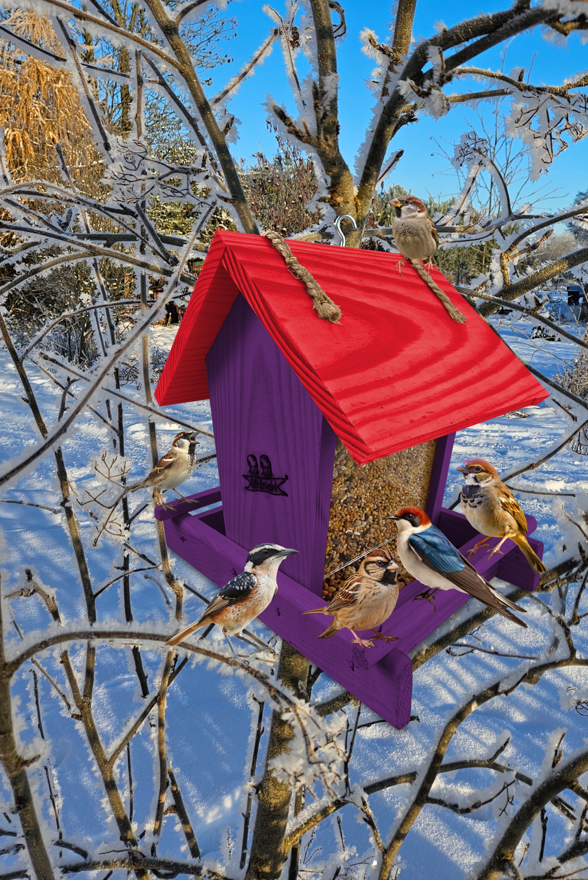 - Karmnik wykonany jest w całości z drewna iglastego, KOLOR CIEMNY FIOLET Z CZERWONYM DACHEM