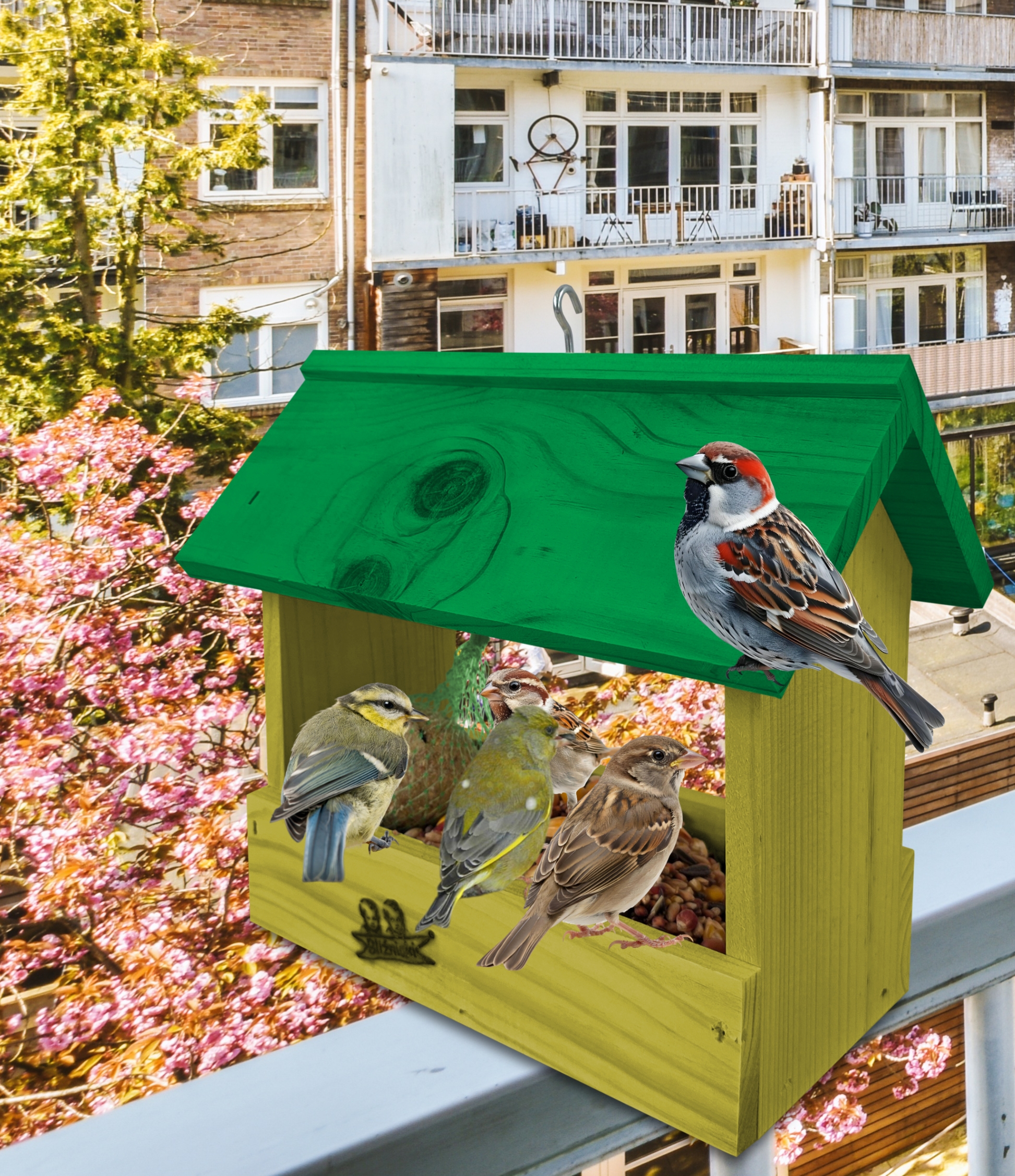 Przedmiotem sprzedaży jest ozdobny drewniany karmnik dla ptaków budka domek na balkon K204 OLI K kolor oliwkowy z zielonym dachem