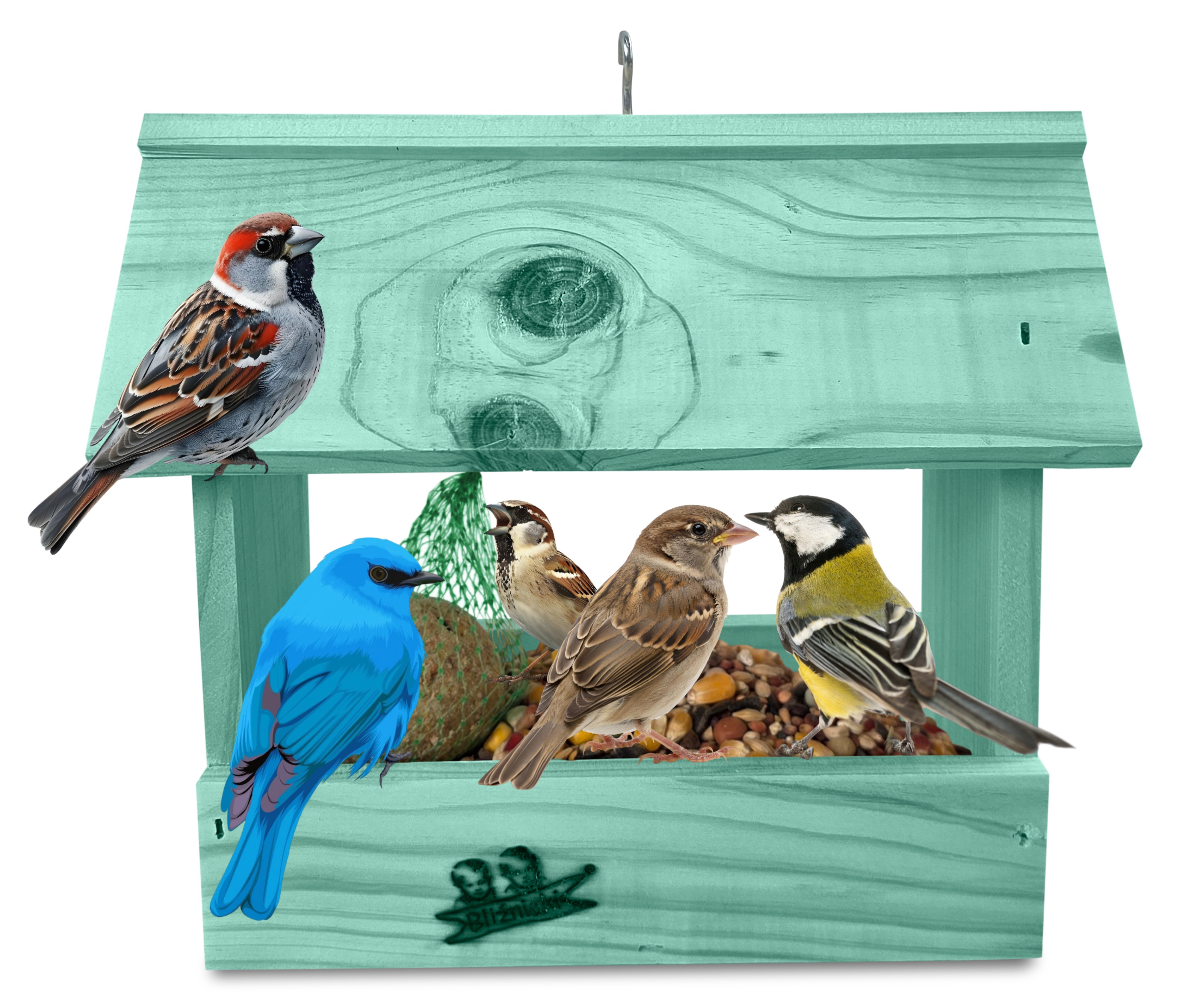 - U góry widoczny jest haczyk umożliwiający zawieszenie karmnika w dowolnym miejscu, możliwe jest również jego postawienie