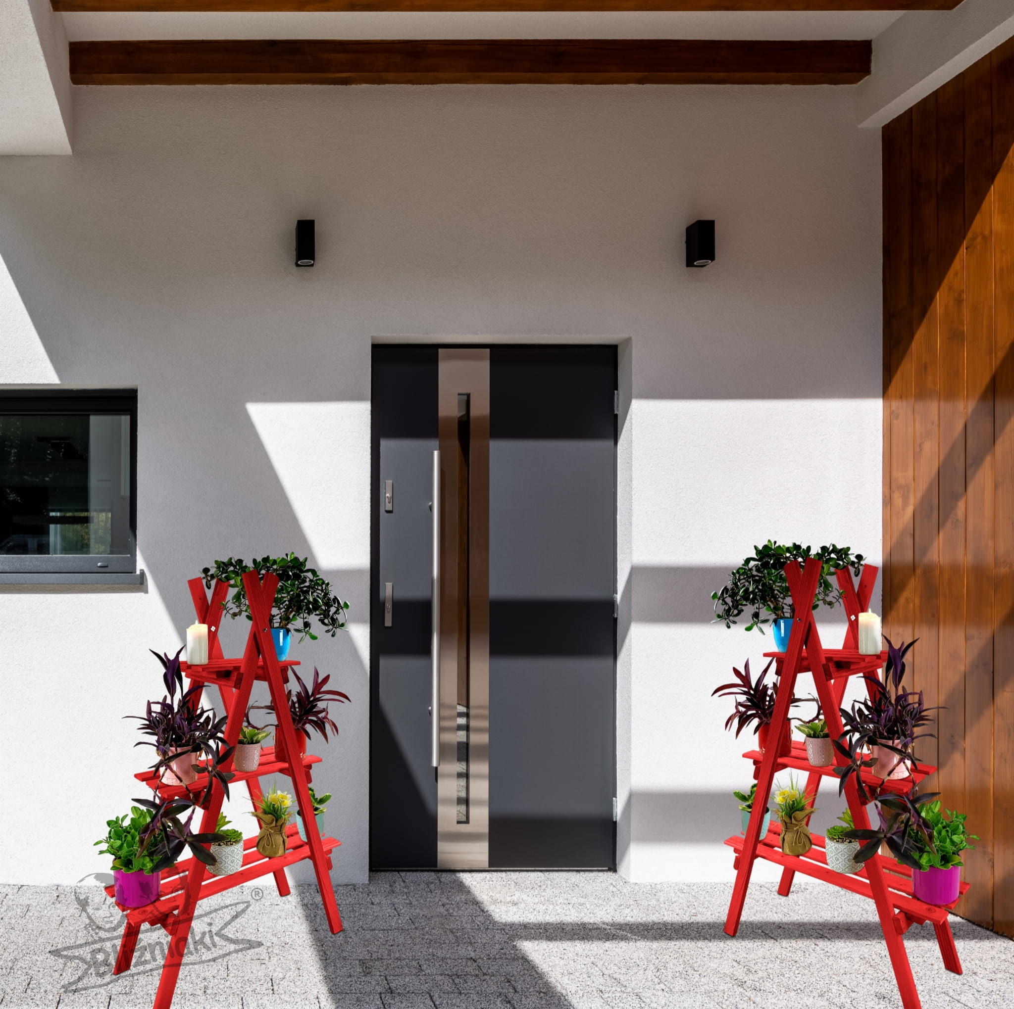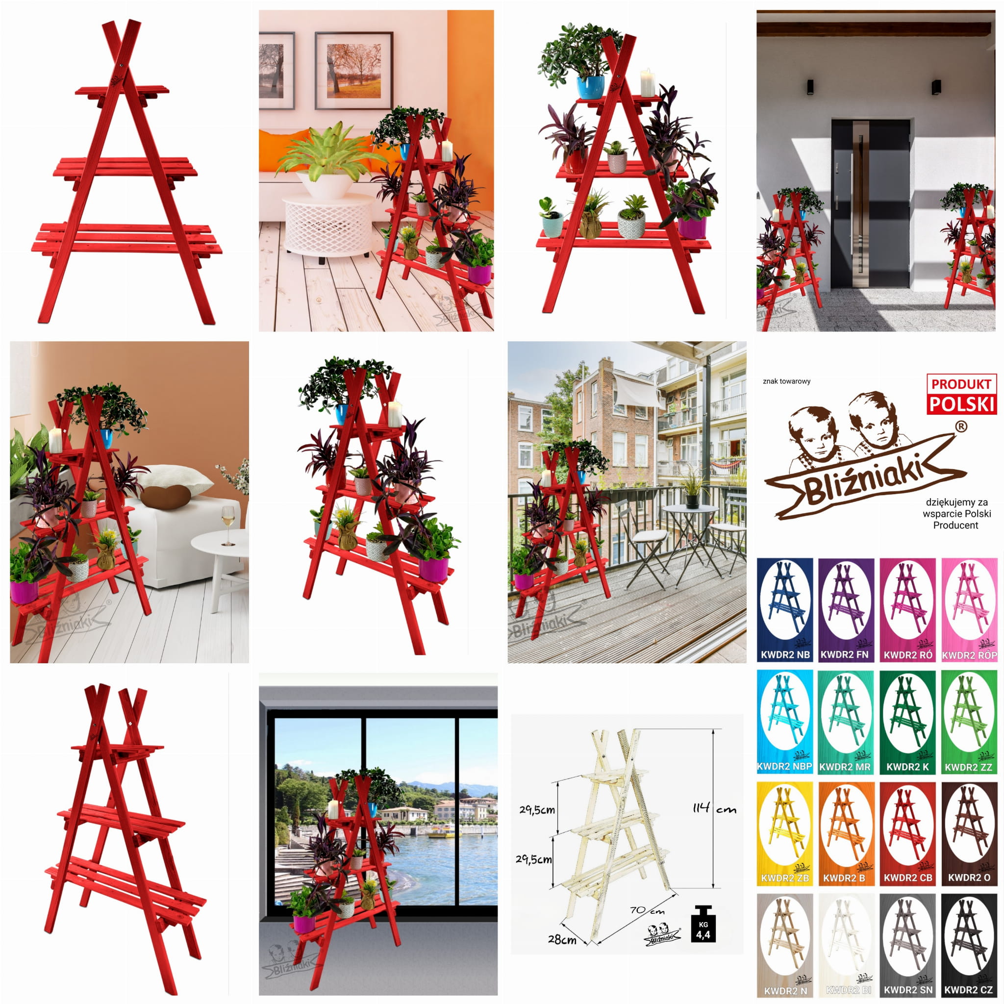 Regał został wykonany z solidnego drewna sosnowego, w kolorze CZERWONYM. To bardzo praktyczny i stylowy element wyposażenia nowoczesnego domu pozwalający zadbać o należny porządek w pomieszczeniach jak i na zewnątrz. Nasz stojak może również pełnić rolę ozdobnego kwietnika do ustawienia na nim doniczek z Twoimi ulubionymi kwiatami na tarasie lub balkonie.