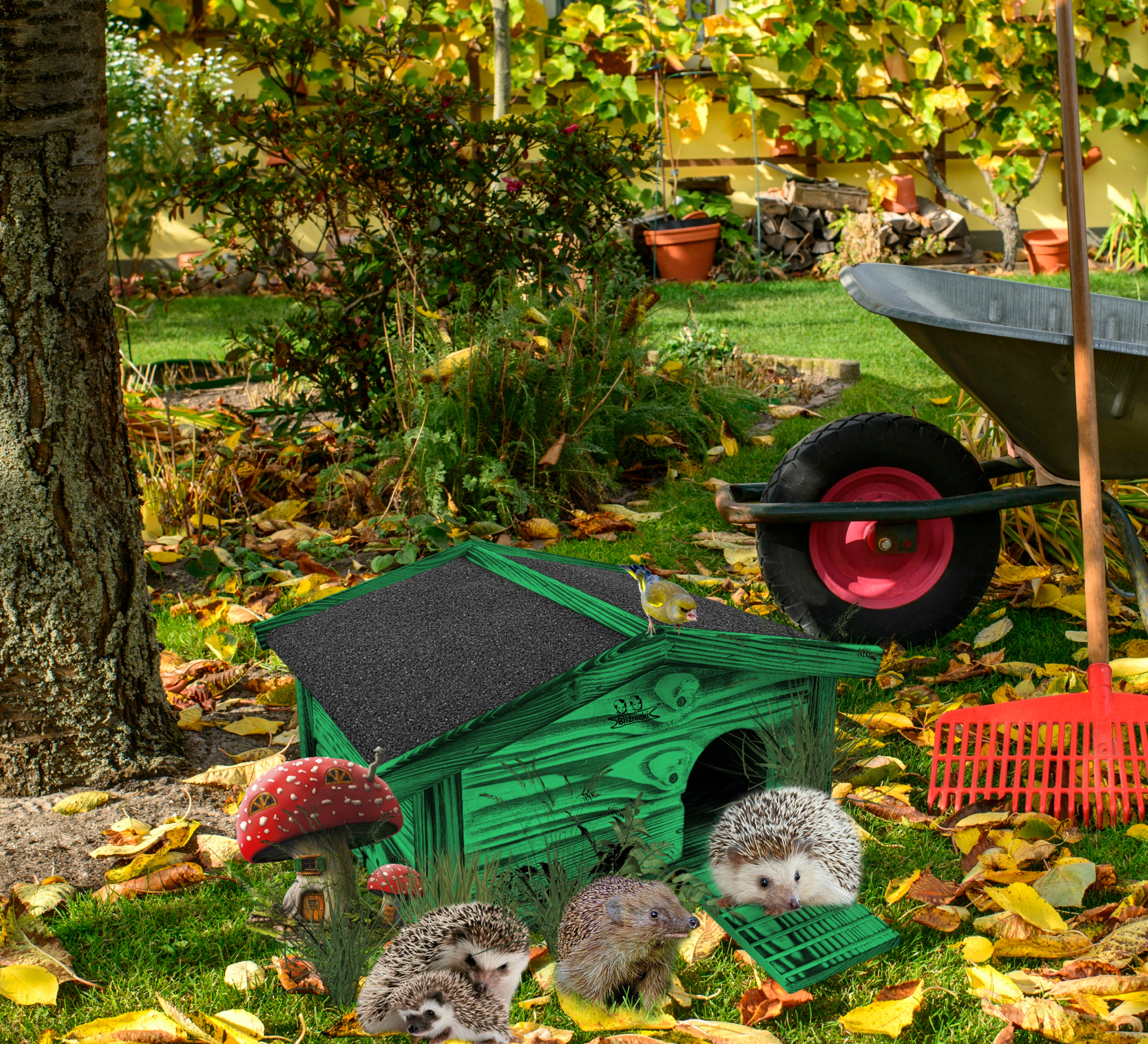 Domek zapewni bezpieczeństwo dorosłym oraz małym jeżom przed drapieżnikami oraz ochroni budowane gniazdo przed wyniesieniem siana.