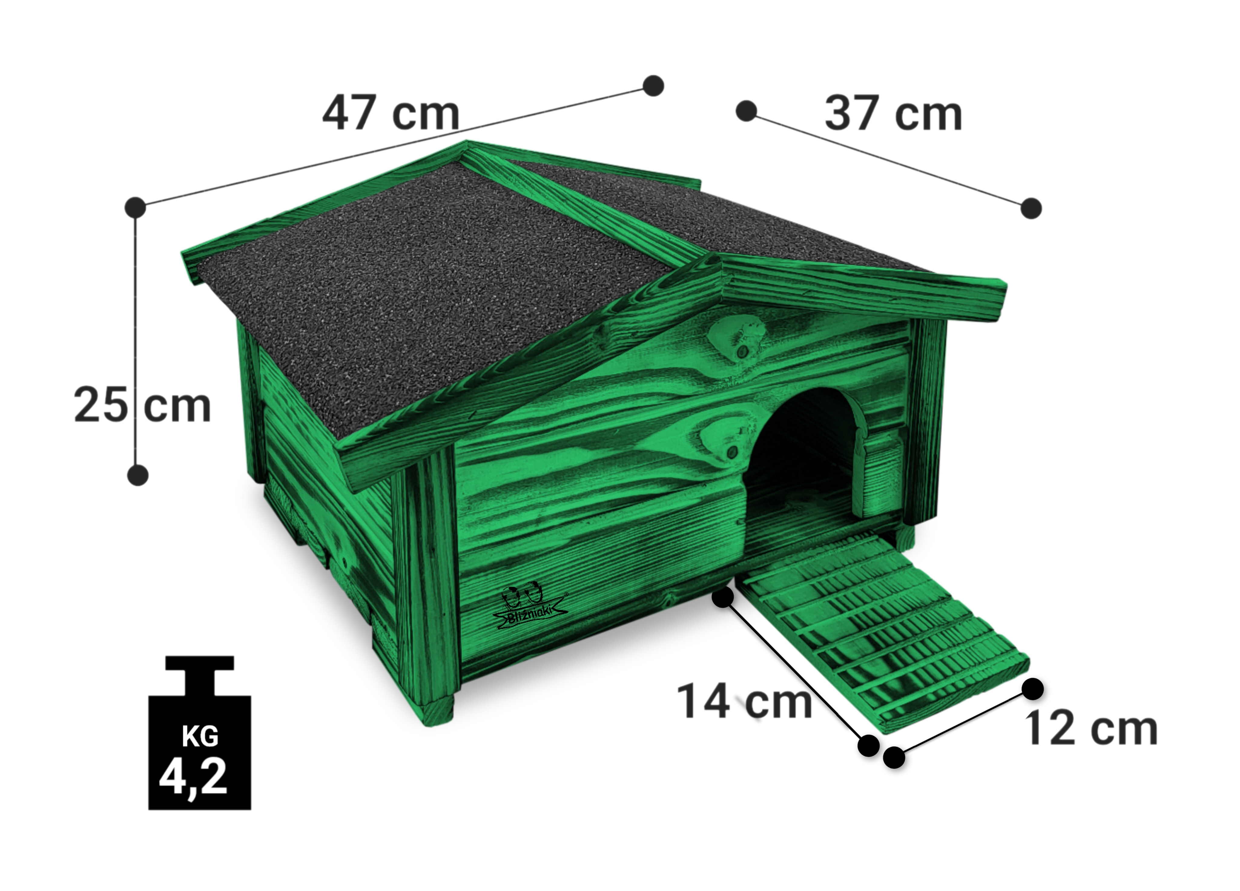 Konstrukcja domku jest stabilna, zdejmowany dwuspadowy dach ułatwi czyszczenie wnętrza budki a do środka prowadzi podest ryflowane schodki, ponadto kryta podłoga odizolowuje jeże od mokrego i zimnego podłoża co czyni ten domek komfortowym siedziskiem do lęgu małych jeżyków.