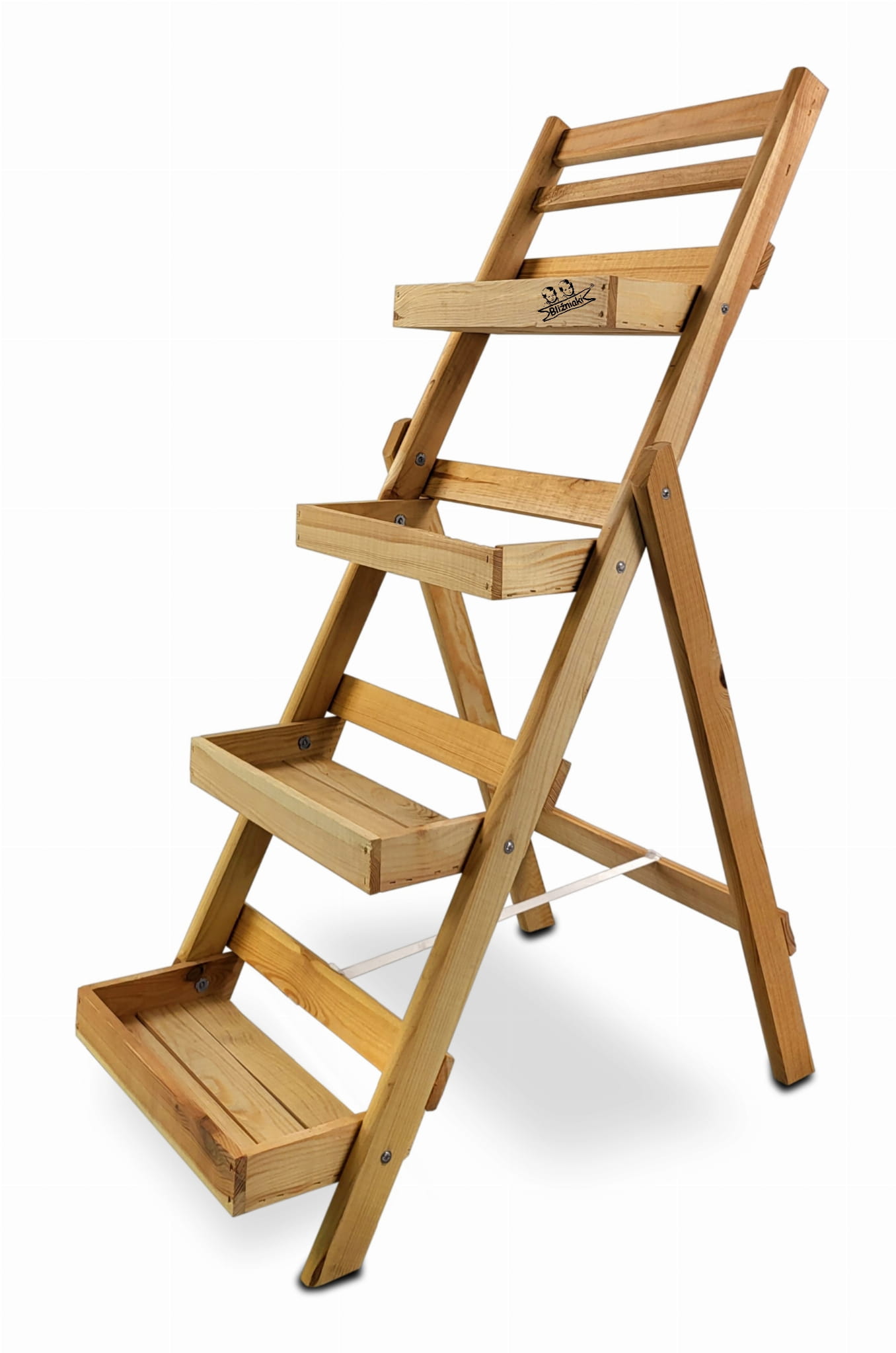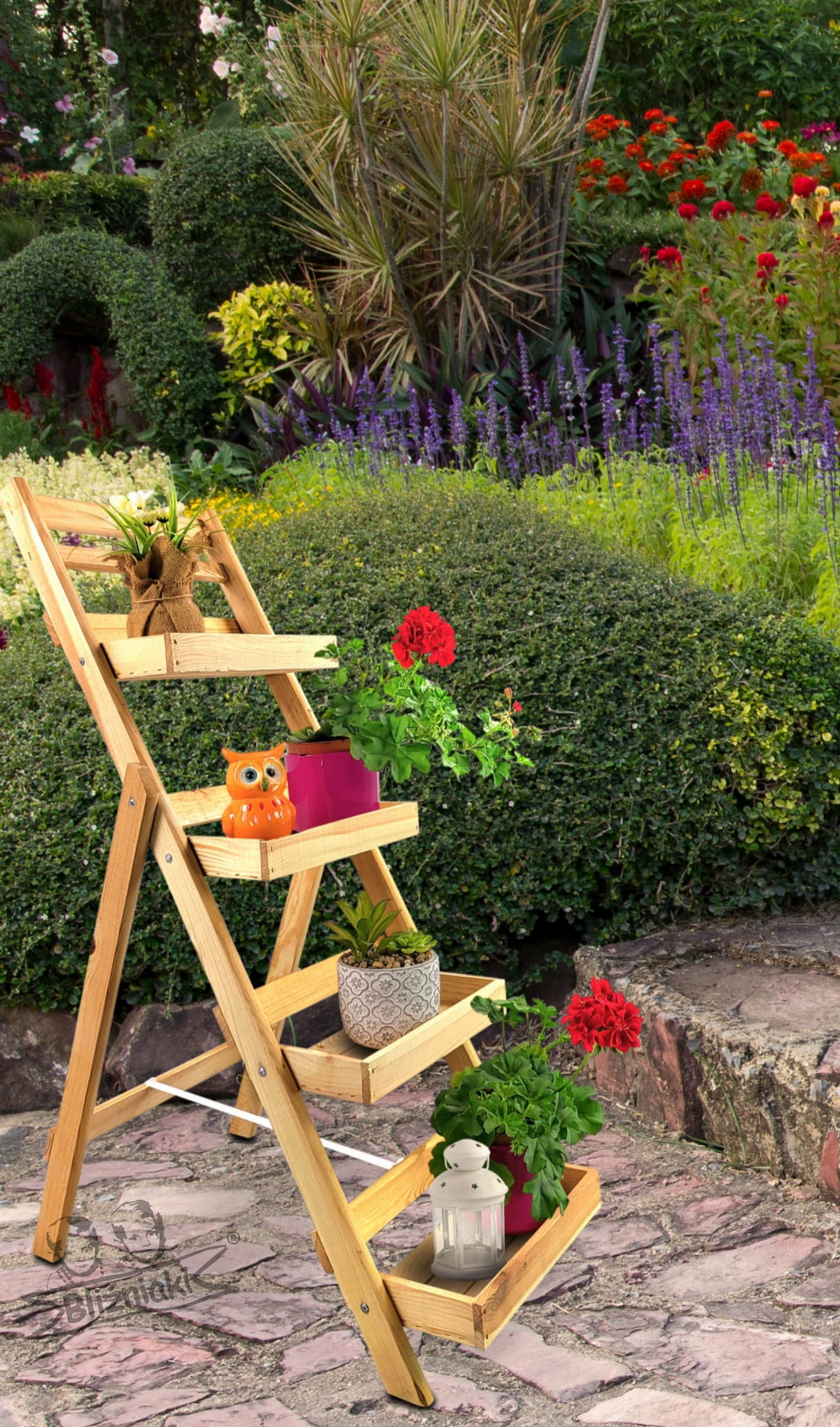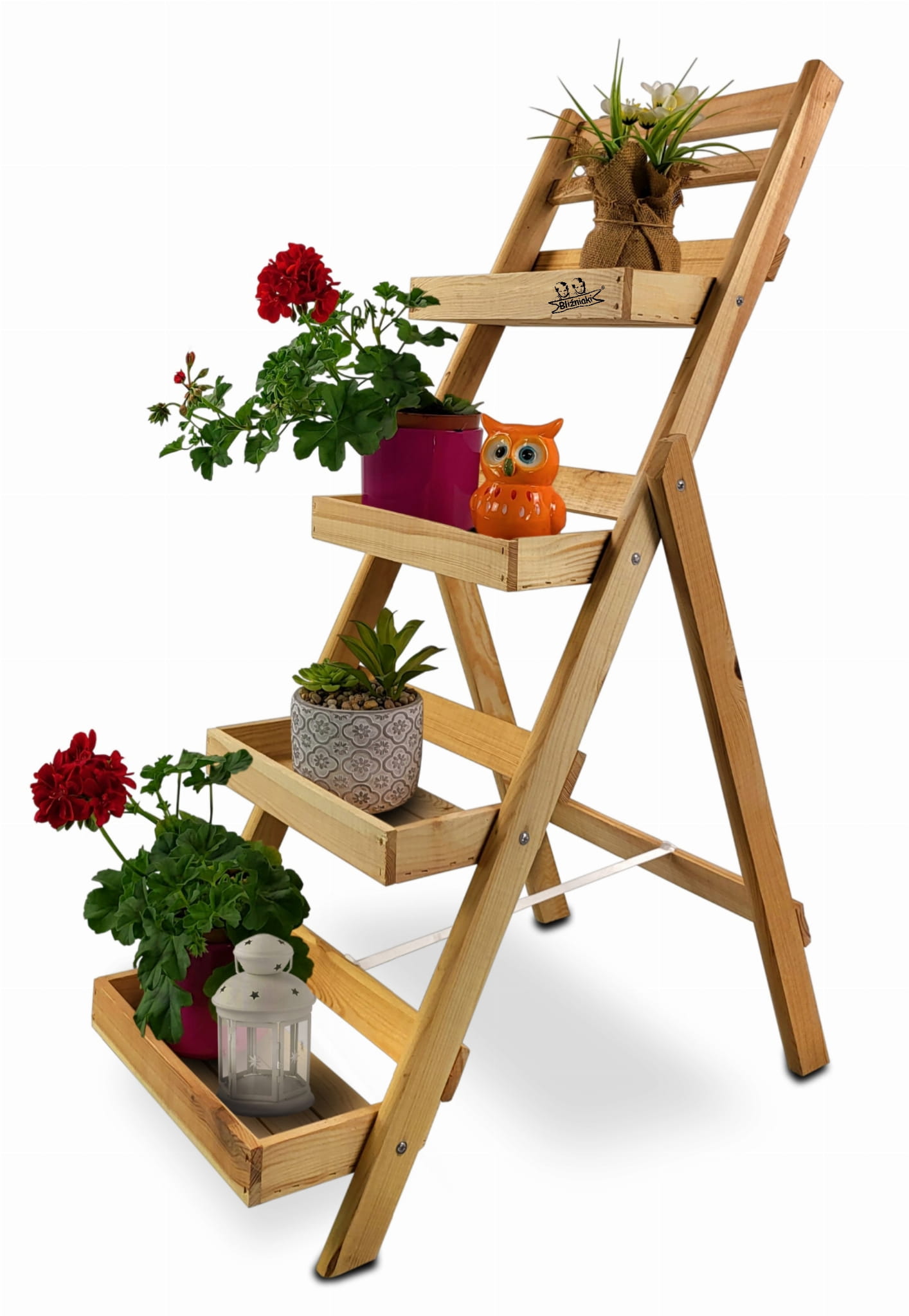 Stylowy, wielofunkcyjny składany 4-piętrowy regał z drabinką łączy w sobie styl i funkcjonalność, umożliwiając wyeksponowanie drobiazgów, roślin doniczkowych, bibelotów, zabawek, książek, a także niewielkich urządzeń i innych przedmiotów, dzięki czemu będzie idealnym dodatkiem do każdej przestrzeni, takiej jak balkon, weranda, salon, kuchnia, ogród.