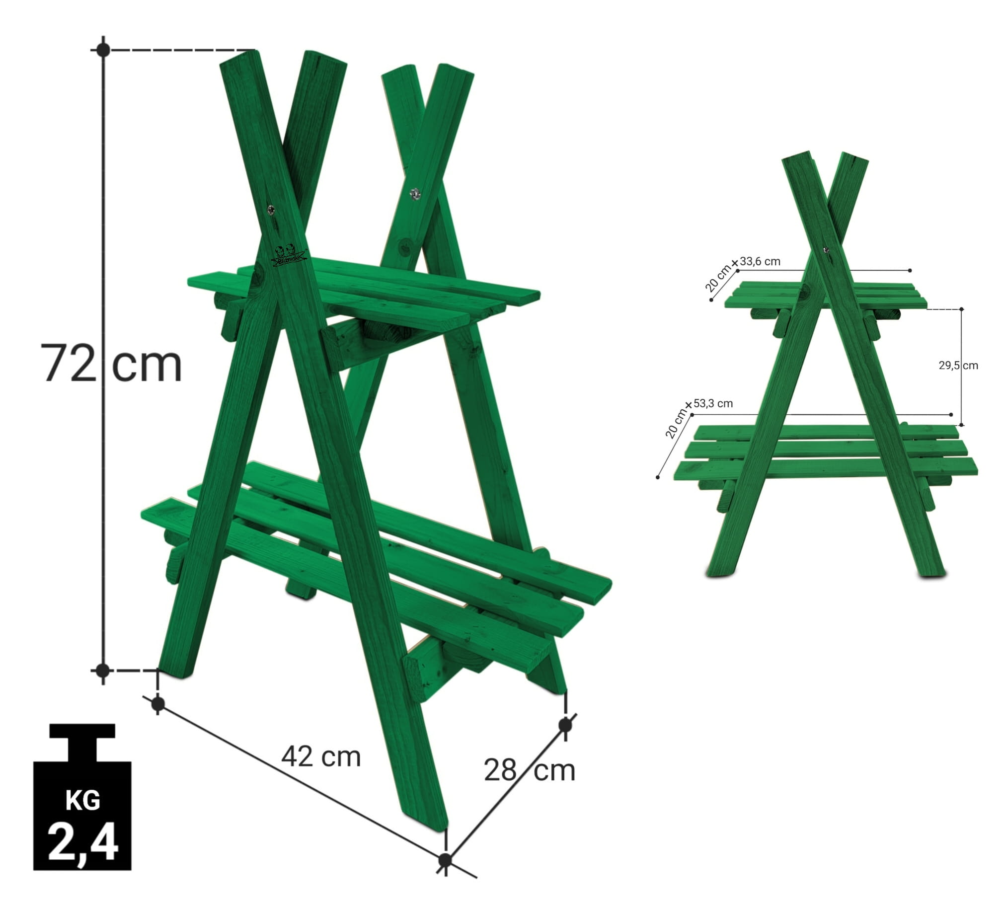 Regał został wykonany z solidnego drewna sosnowego, w kolorze ZIELONYM. To bardzo praktyczny i stylowy element wyposażenia nowoczesnego domu pozwalający zadbać o należny porządek w pomieszczeniach jak i na zewnątrz. Nasz stojak może również pełnić rolę ozdobnego kwietnika do ustawienia na nim doniczek z Twoimi ulubionymi kwiatami na tarasie lub balkonie.