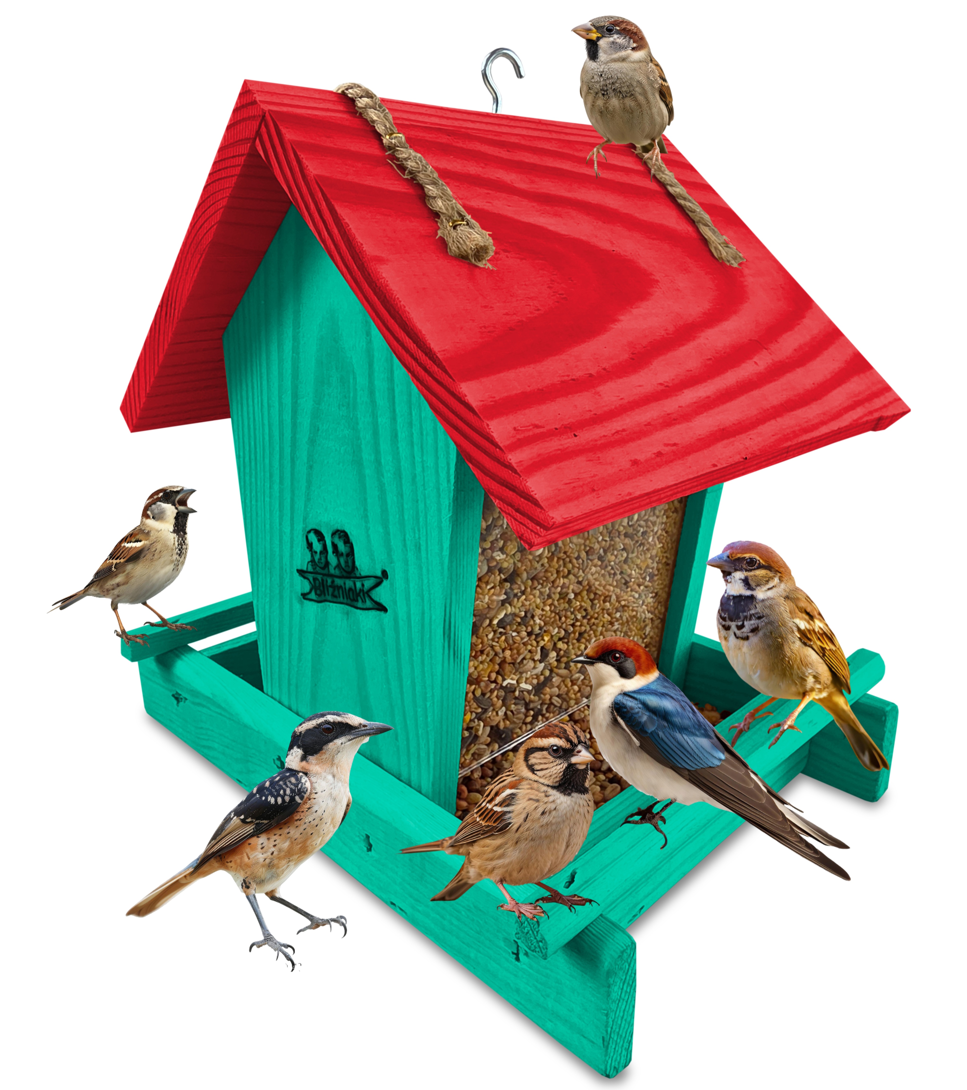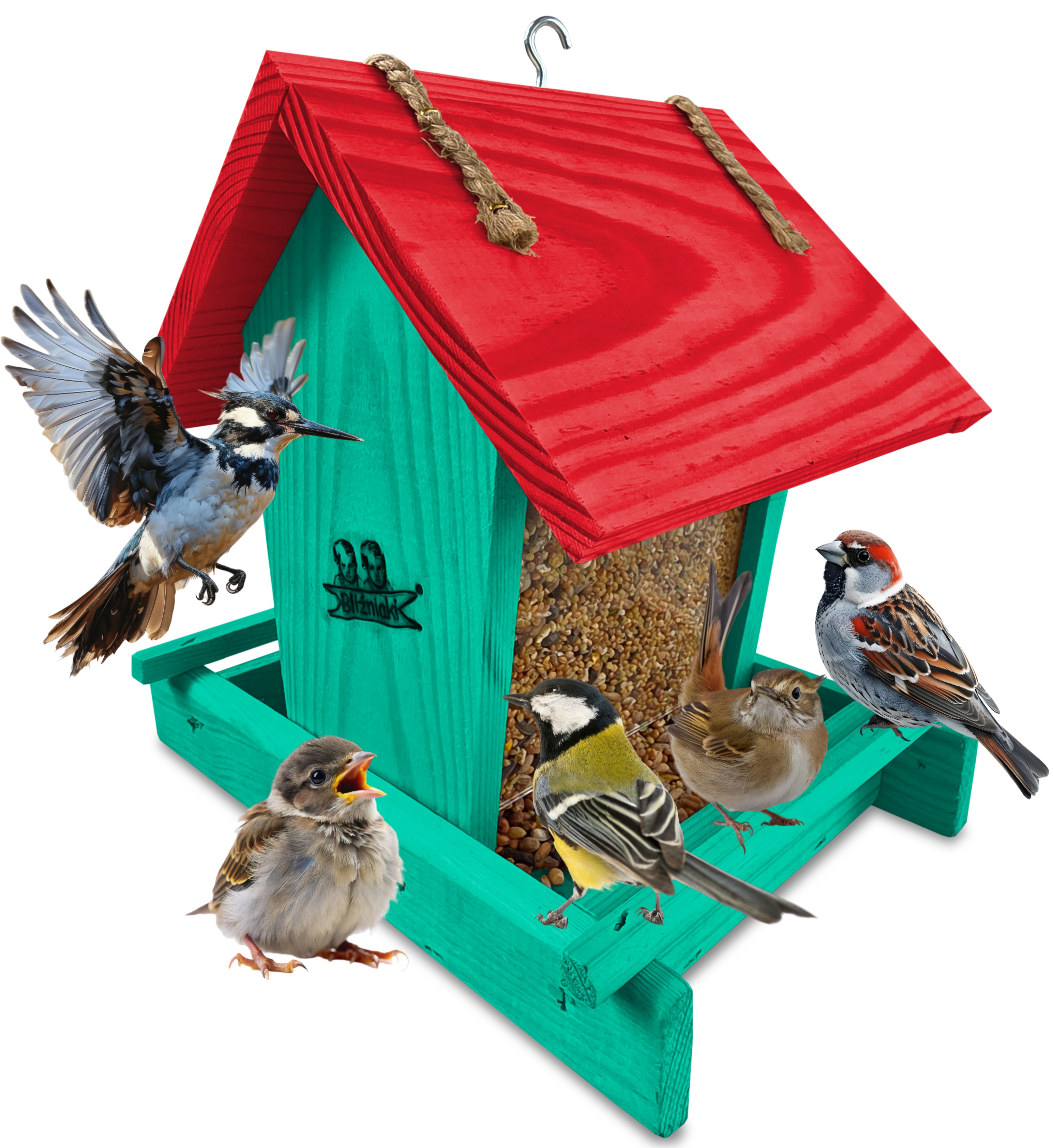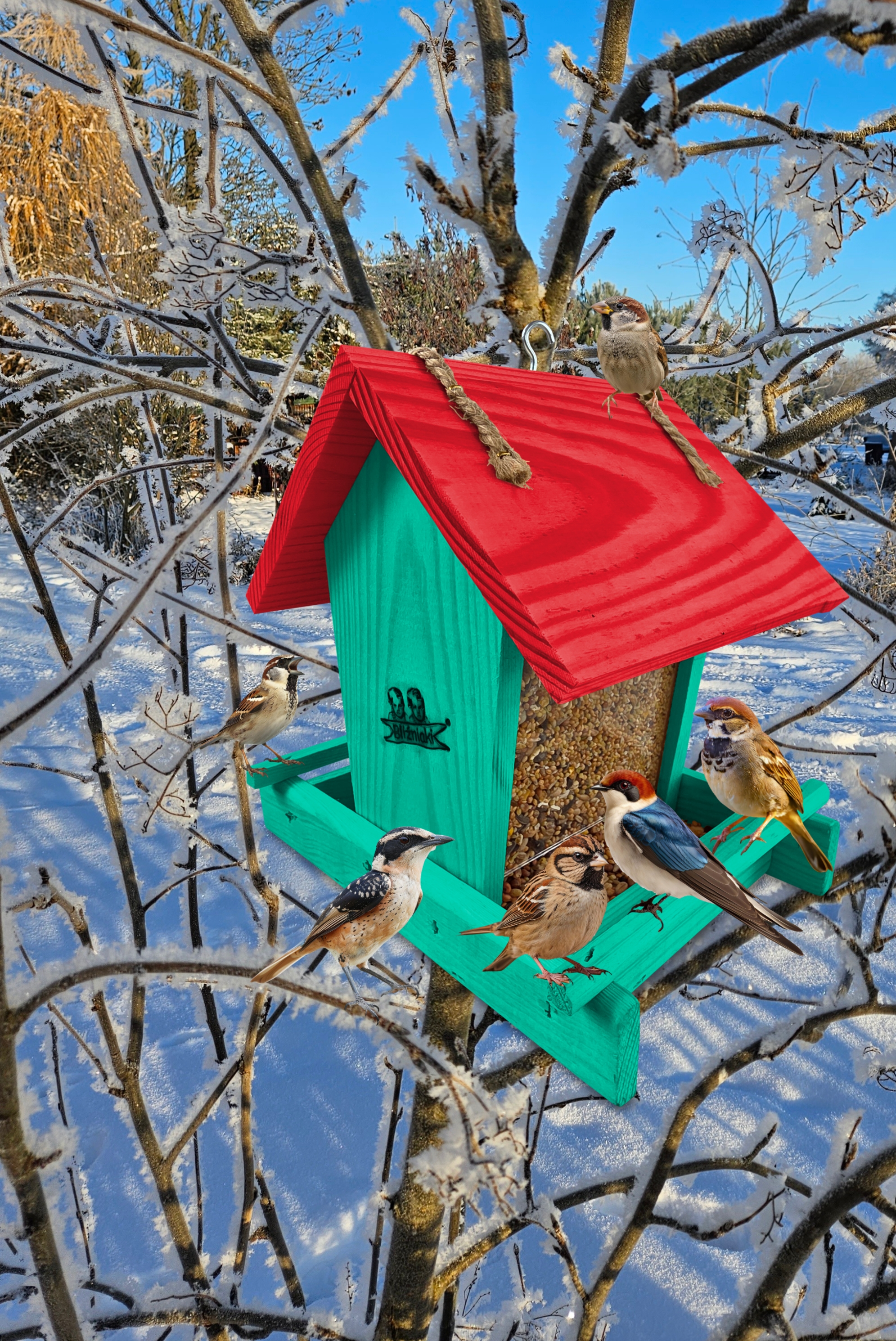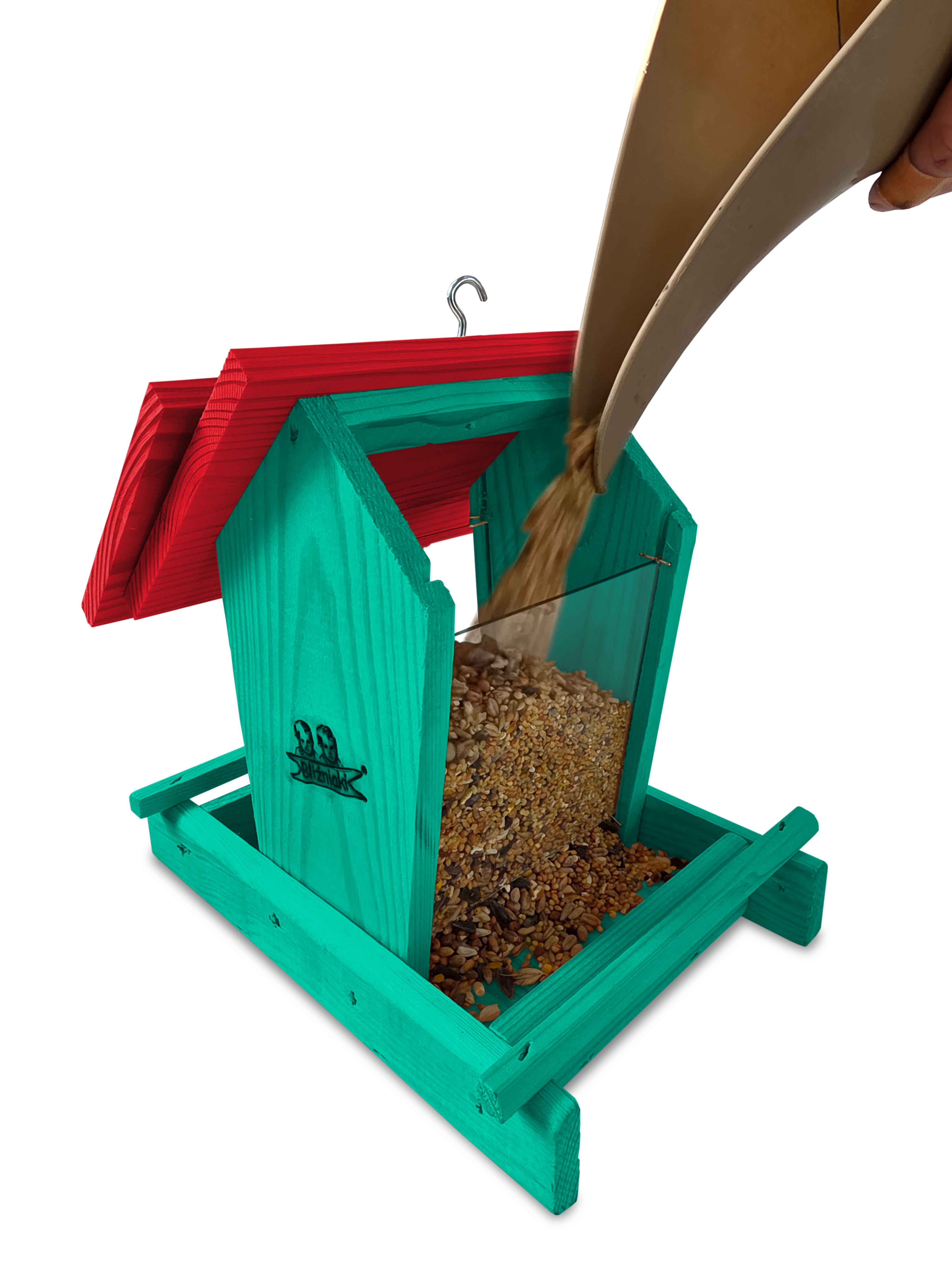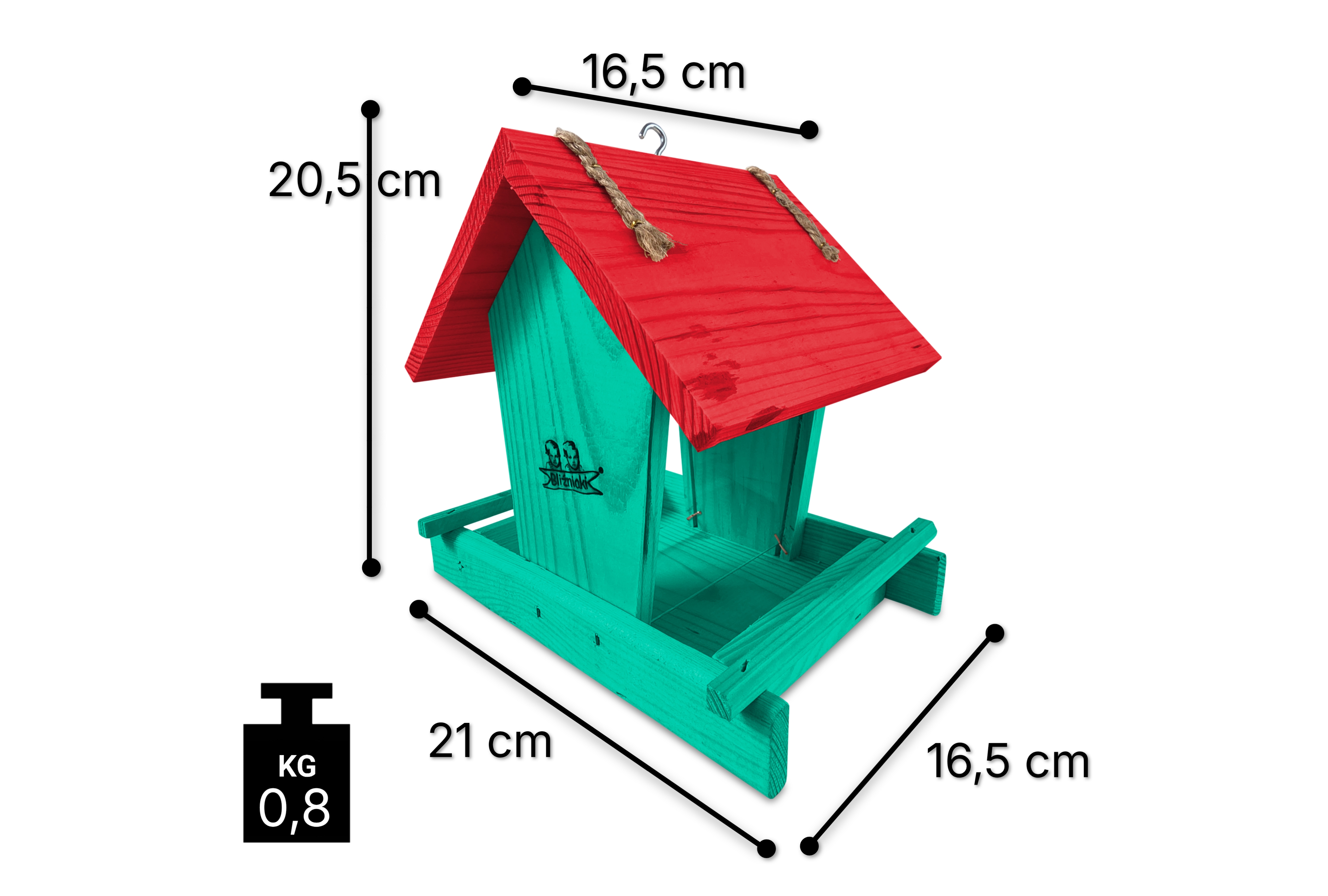Przedmiotem sprzedaży jest ozdobny drewniany karmnik dla ptaków z dozownikiem ziarna model K29 MR CB kolor morska zieleń z czerwonym dachem