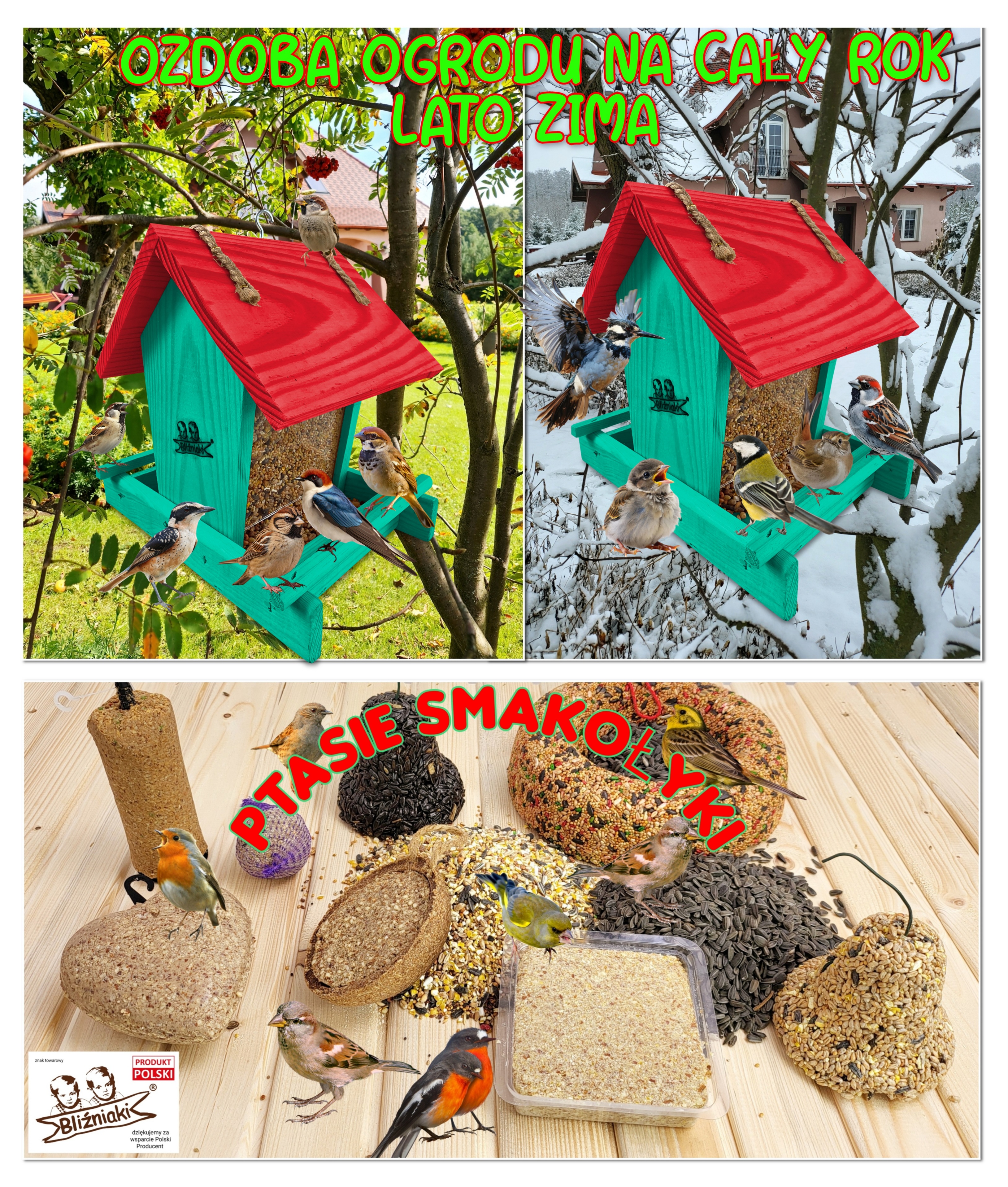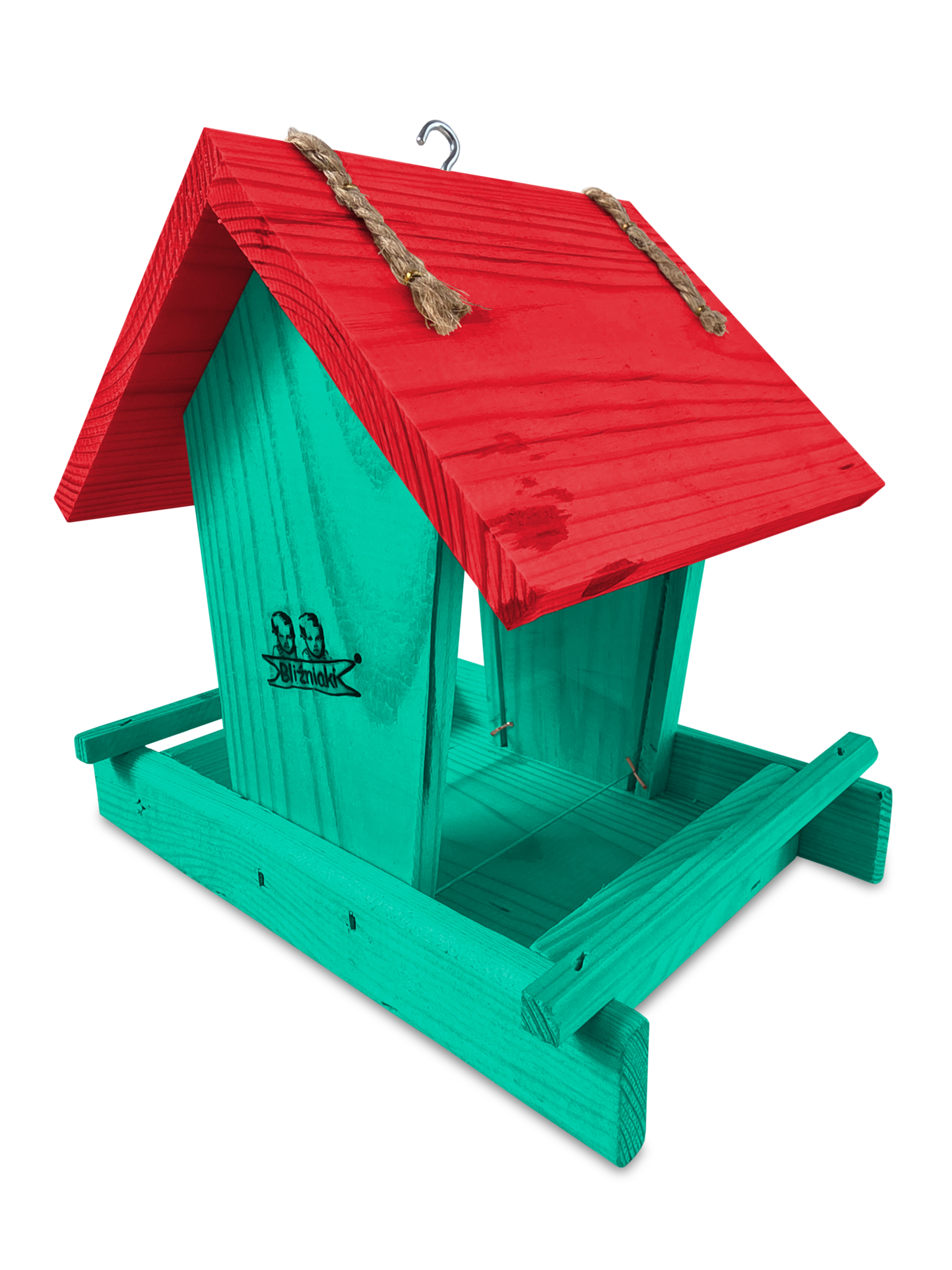- Karmnik wykonany jest w całości z drewna iglastego, KOLOR MORSKA ZIELEŃ Z CZERWONYM DACHEM